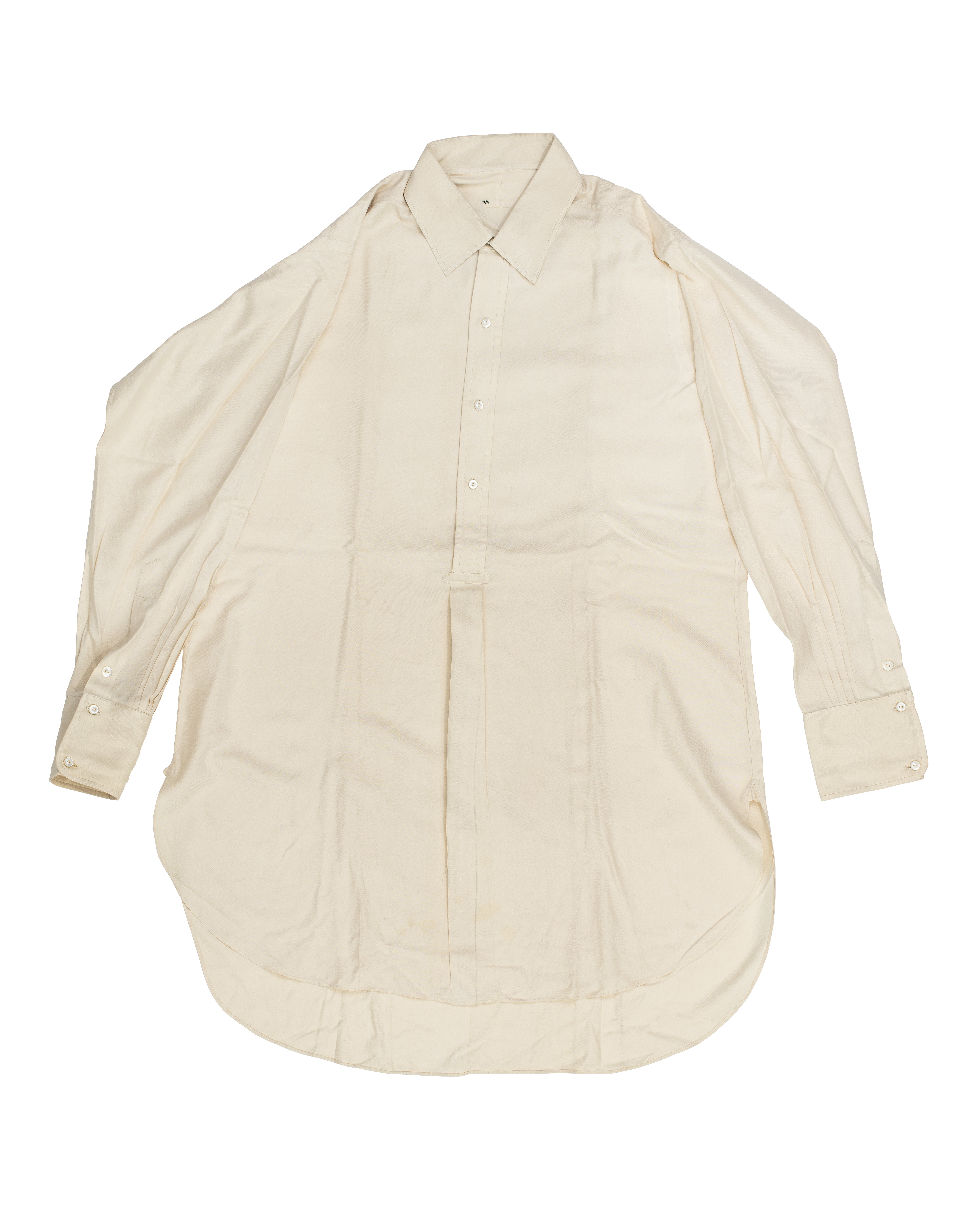 Skjorta av benvit helsiden, fällkrage. Öppen och med knäppning ned till halva längden. Fem knappar, varav två är i kragen, diam: 10 mm, vita pärlemor. Från nederdelen av öppningen och ända ned ett motveck. I båda sidor sprund, med rundade hörn. Isydda ärmar med manchetter, tre knappar varav en i sprundet ovanför manchetten. Pressade motveck ovanför manchetten.' Storlek 41,5.