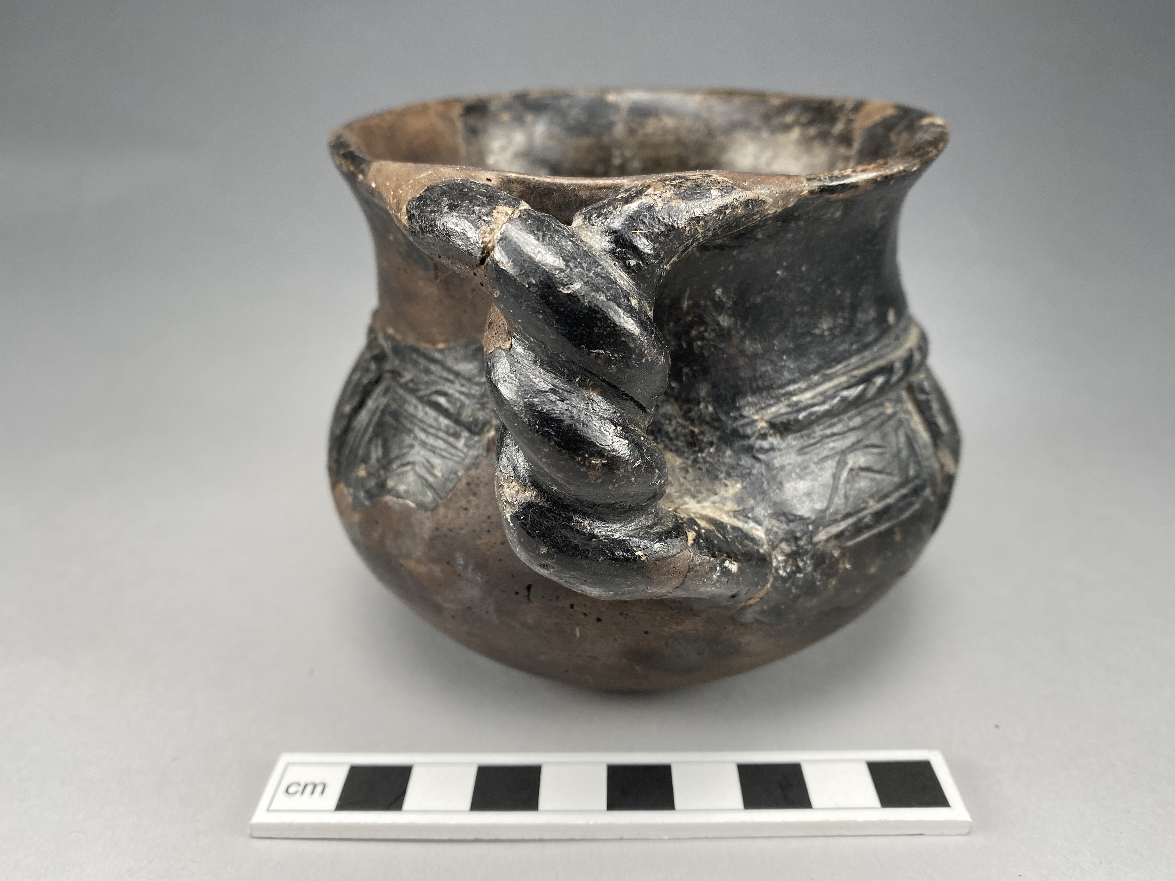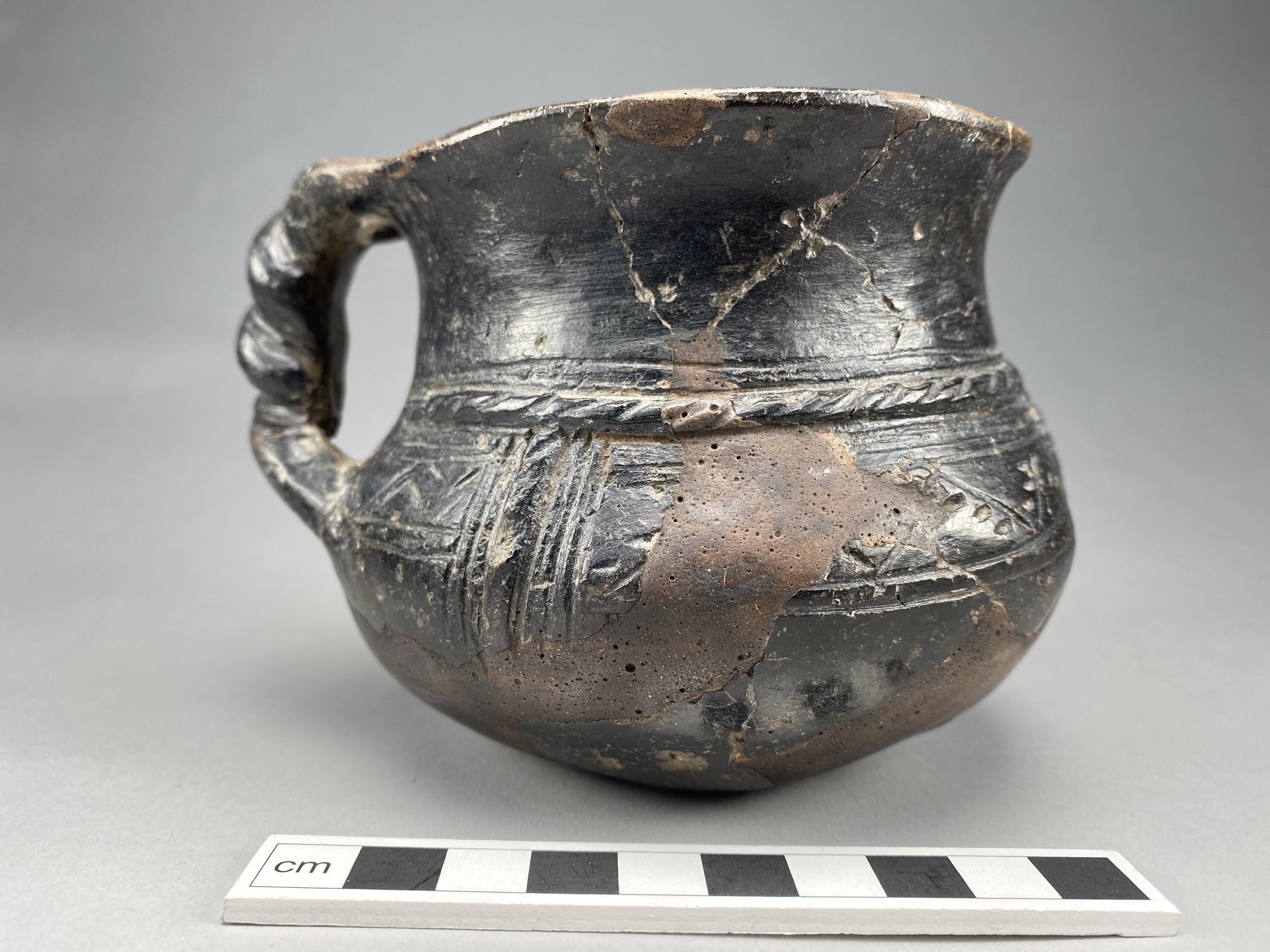 "Elaborated ware". Hänkelkärl med inristad dekor och repstavsvulster. Hänkeln är flätad av två runda korvar