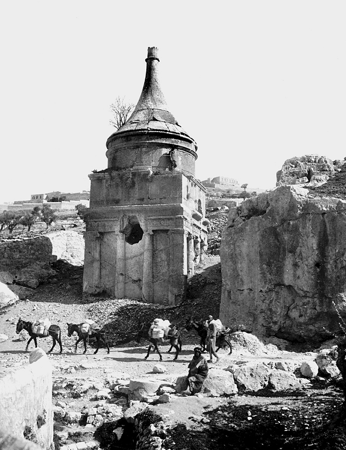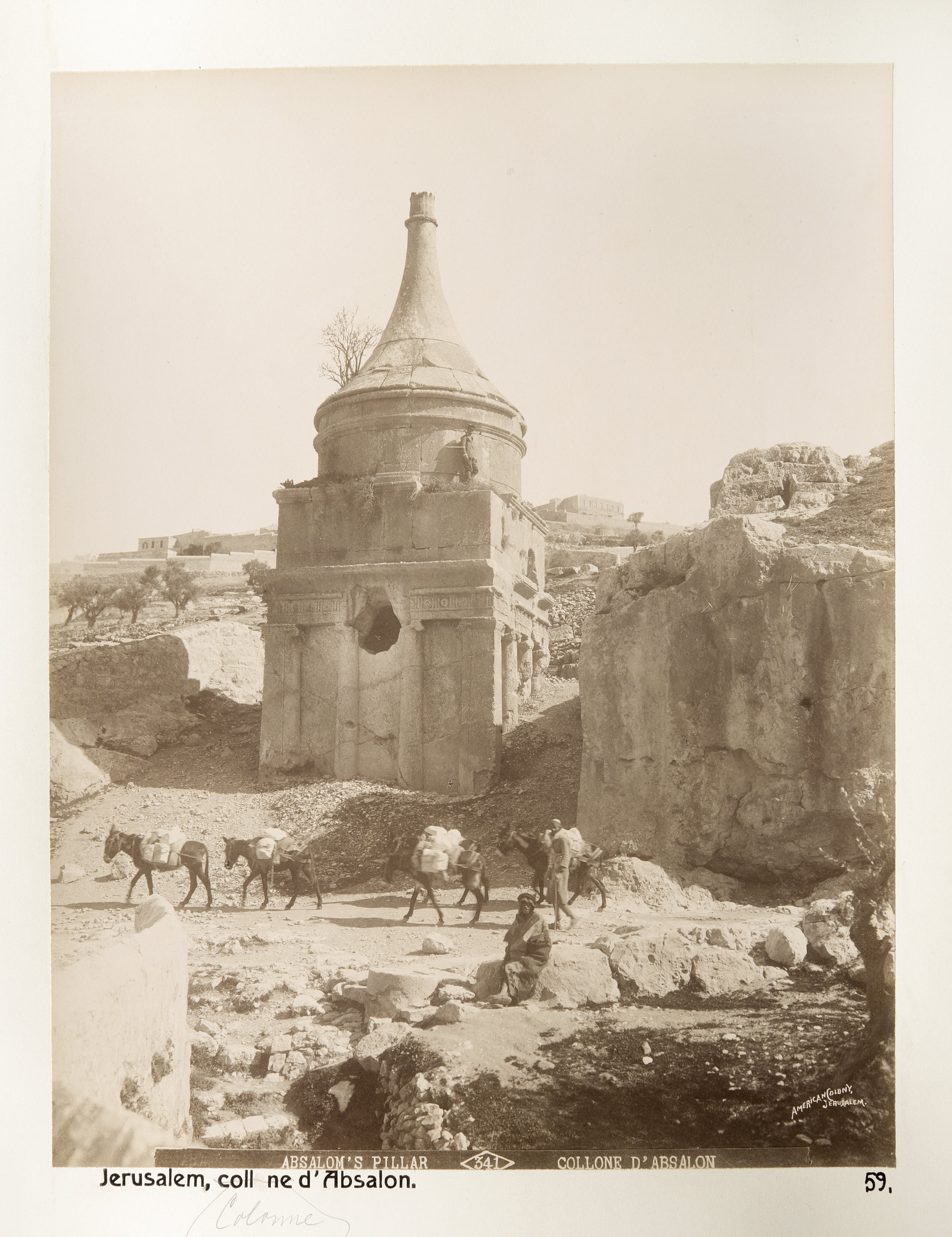 Absaloms grav, Jerusalem. Text på originalet: "Absalom's Pillar/Collone d'Absalon". Fotografierna LXVI:N.01.-180. kommer från resan till Palestina och Syrien som Wilhelmina och Walther von Hallwyl gjorde den 30 mars-27 april 1901. De lämnade Sverige den 5 november 1900 för Egypten, där de stannade till den 28 mars 1901, då de fortsatte till Palestina. Med på resan var Wilhelminas sällskapsdam, fröken Ida Uhse. Den 27 april fortsatte de till Turkiet och Mindre Asien. De mindre fotografierna (utom de från Samos) LXVI:N.90.-100. är tagna av Wilhelmina själv, under en resa till häst från Jerusalem till Damaskus 8-20 april 1901. Övriga fotografier är inköpta av Wilhelmina i Jerusalem, Damaskus och Beirut. Alla uppgifter kommer från Ida Uhses reseanteckningar.