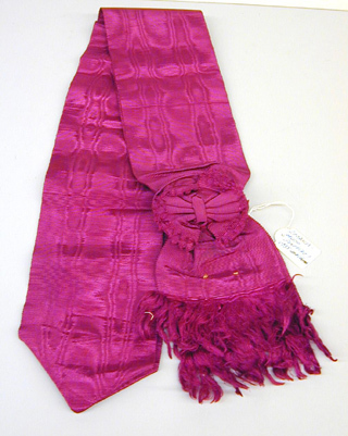 Axelband av rödviolett sidenmoaré, bandändar med långa fransar, l: ca 60 mm. Ca 120 mm därovanför är bandet sammanbundet, däröver fäst dubbel rosett av bandet, b: 75 mm, de övre banden med tandade ändar. Ena kanten på baksidan rynkad.