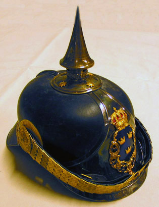 Hjälm, fodrad med blått, tvådelat foder med kronprinskrona och "G.A." i guldtryck. Under hjälmfodret låg näsduk nr: 12856. Svettrem av rödbrunt läder, b: 55 mm med kanterna upptill bågformiga. I övrigt modellenlig.