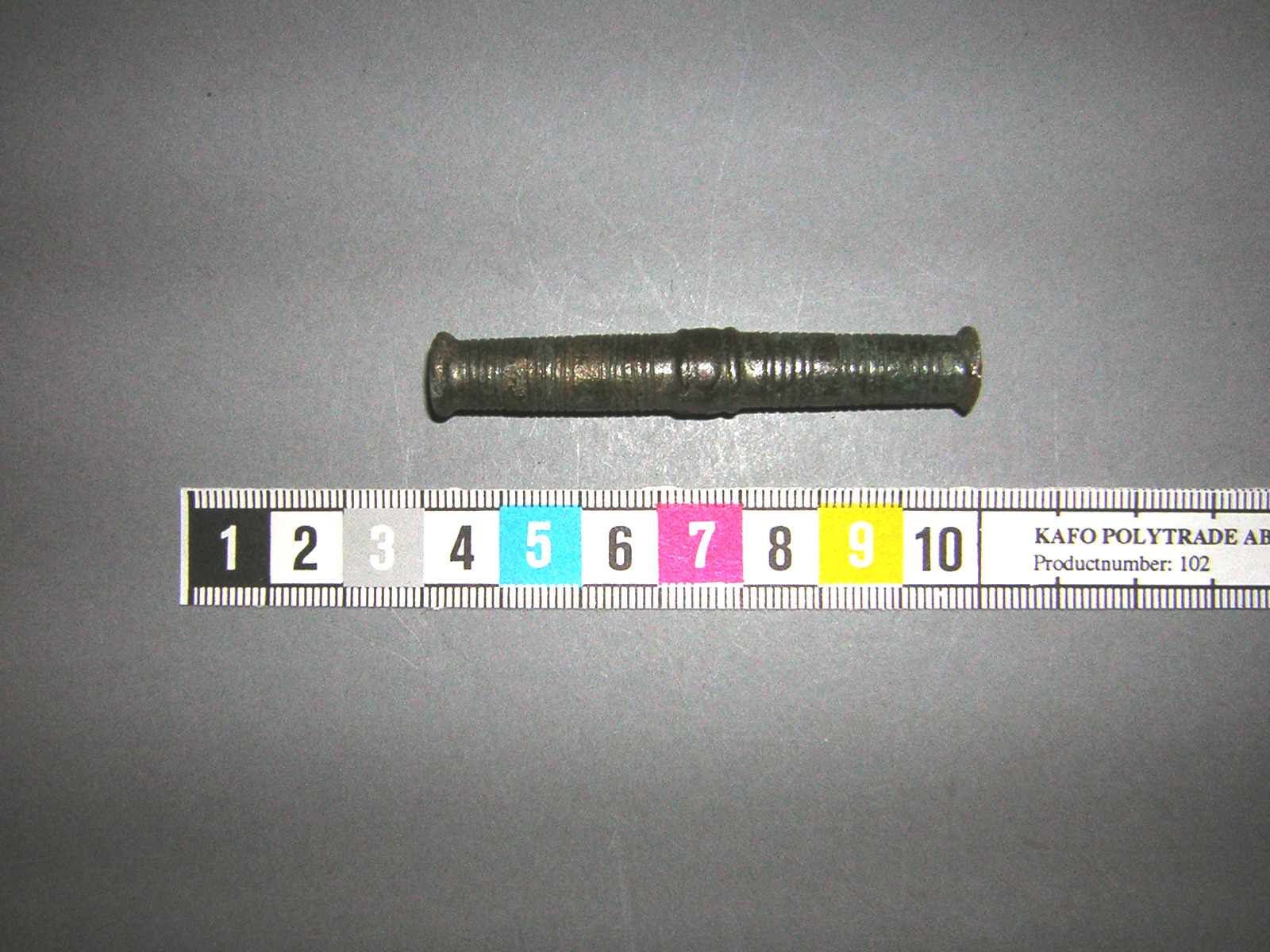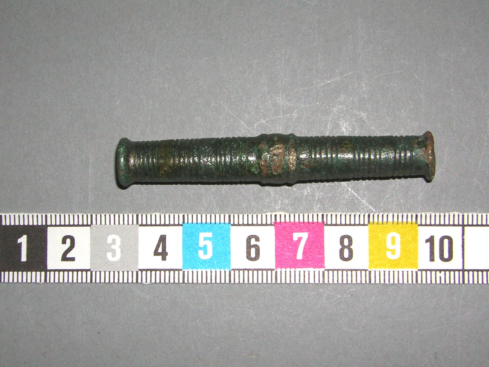 Rör av brons, trind och med runt hål. Utsidan är ornerad med upphöjda ränder och med grupper av fina, fördjupade linjer.