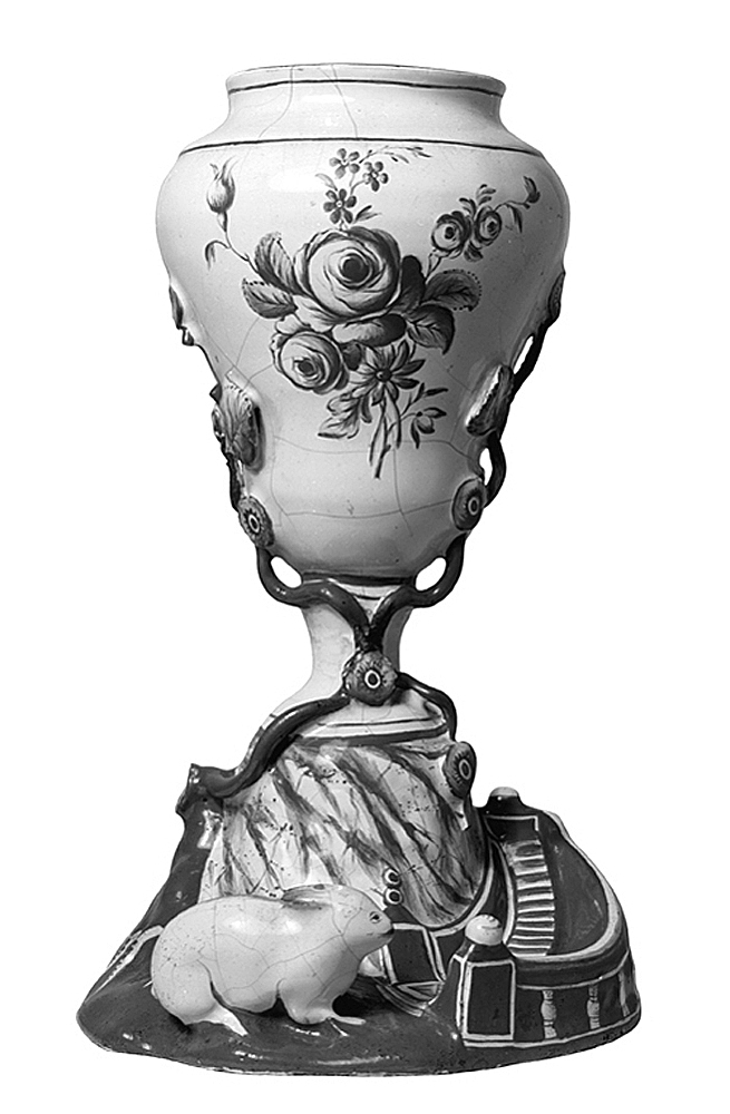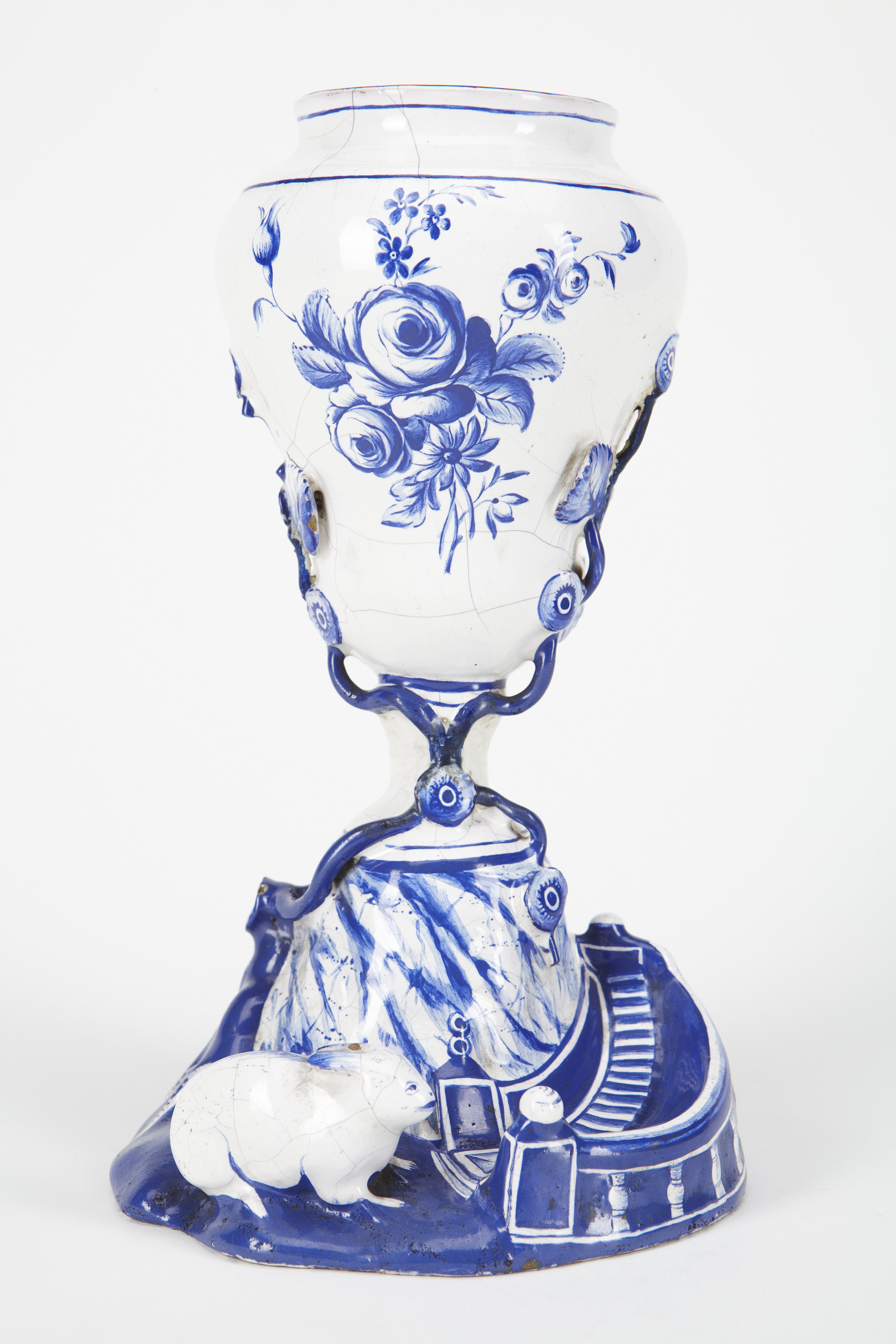 VAS (s.k. kaninvas; lock saknas). Pokalformig; kuppan omvänt päronformig med något insvängd mitt samt svagt utsvängd uppstående mynning; skaft kort, insvängt; fot i form av ett stenkummel, till en tredjedel omgivet av en trappa med barriär, framför trappan en mot densamma vänd kanin. Dekor: I pressad och fritt pålagd relief samt i blått (muffelfärg) på tennglasyr. Godset grågult. På kuppans framsida en bukett av en större och en mindre ros, upptill en förgärmigejstjälk, nedtill en enkel flerbladig blomma, till vänster en rosenknopp, till höger en kvist med två små rosor; på motsatta sidan en kvist med två från varandra vända rosenknoppar samt två blad. Runt överdelen tre i blått. Stenkumlet på framsidan i form av ett marmorerat block. Trappan med femton målade steg avslutas med ett rektangulärt postament. Kaninen vit med öron och rygglinje i blått. På den trappan motsatta sidan en avhuggen otydlig trädstam, från denna utgående i fri relief en gren, som vid skaftet delar sig och fortsätter uppåt med en del på vardera sidan om framsidans bukett. På fotens undersida en märkning i blått. Höjd 20,5 cm. Fot, längd 12,1 cm, bredd 10,2 cm