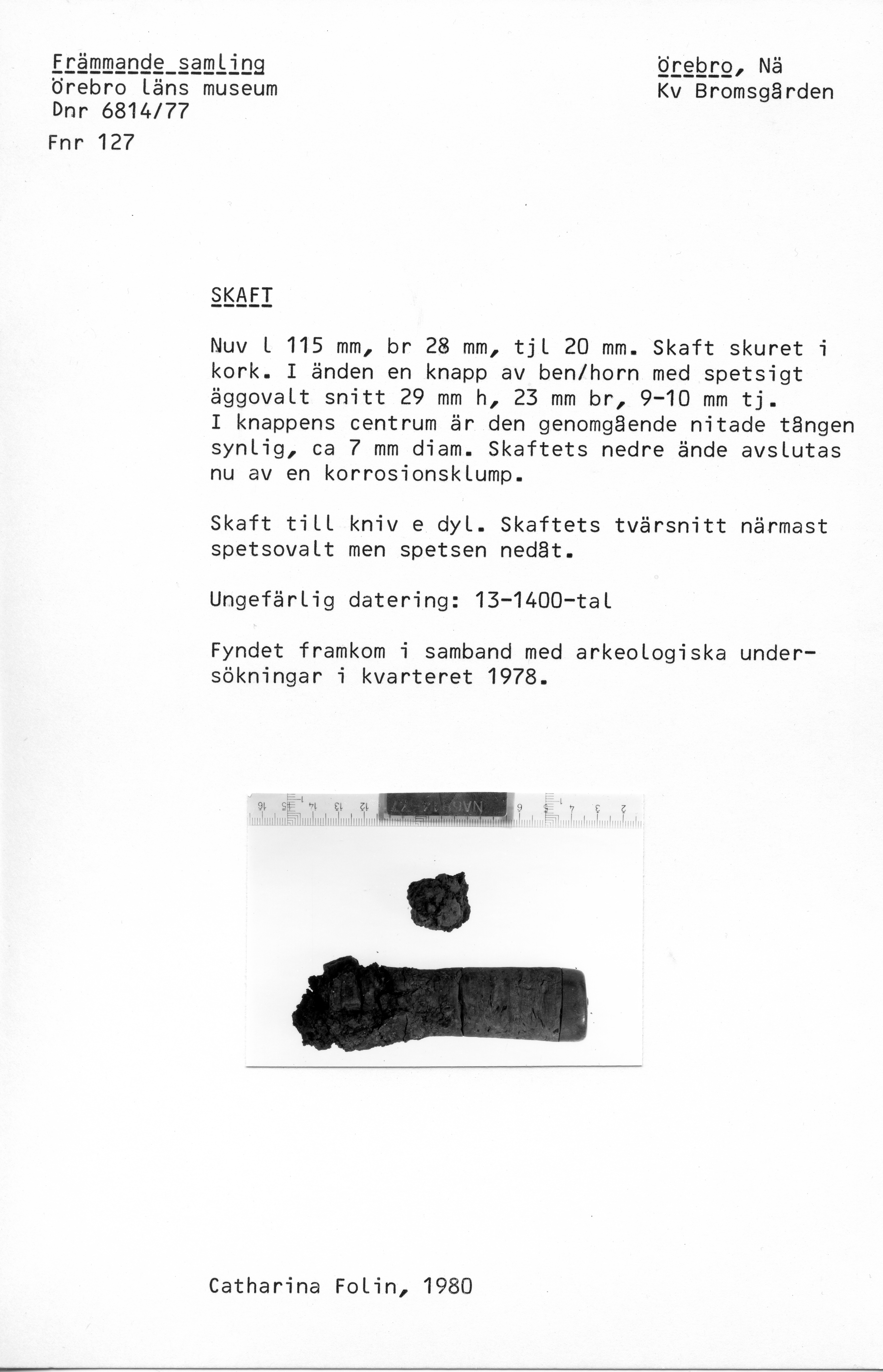 Skaft skuret i kork. I änden en knapp av ben/horn. Den nitade tången syns i mitten.