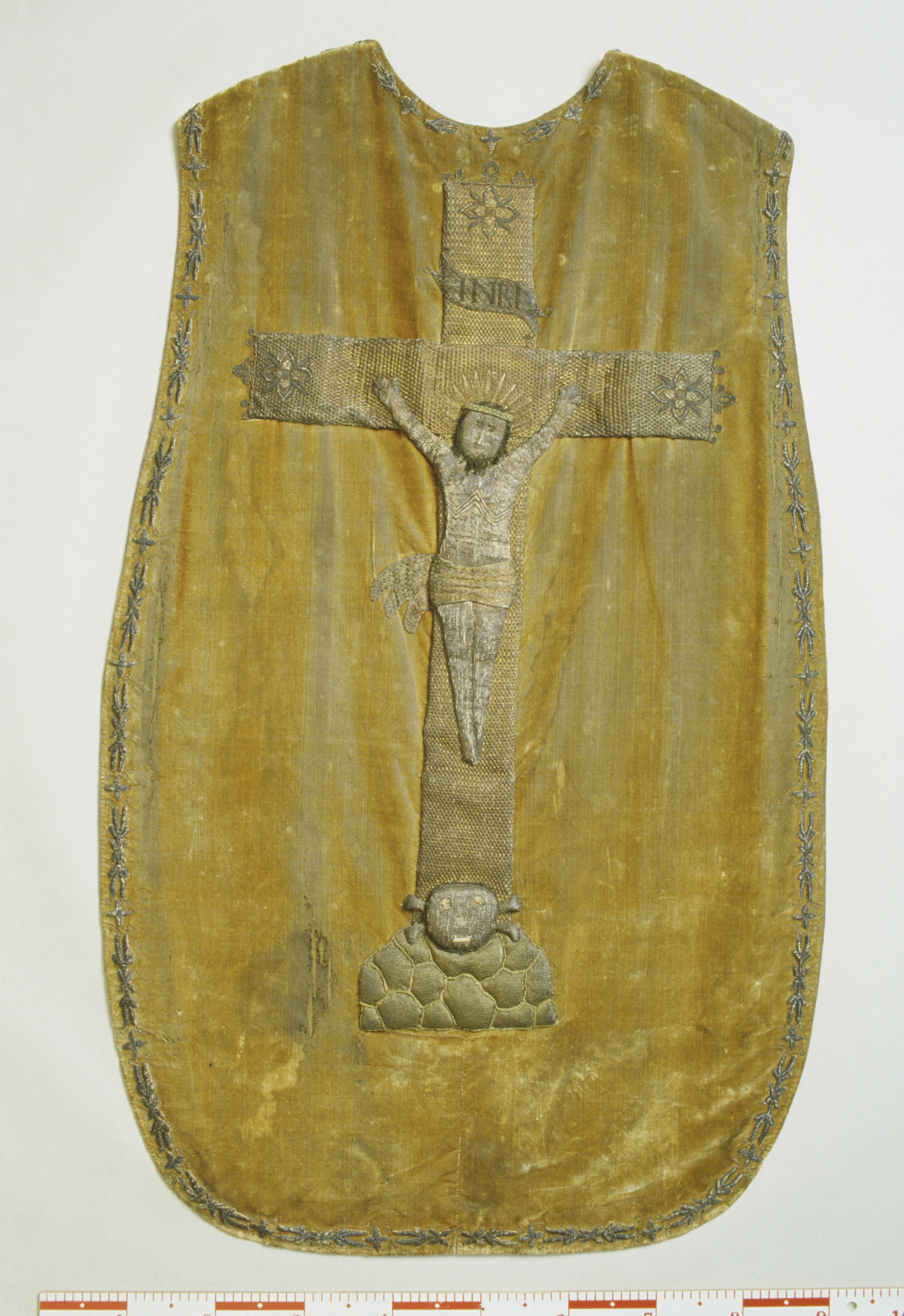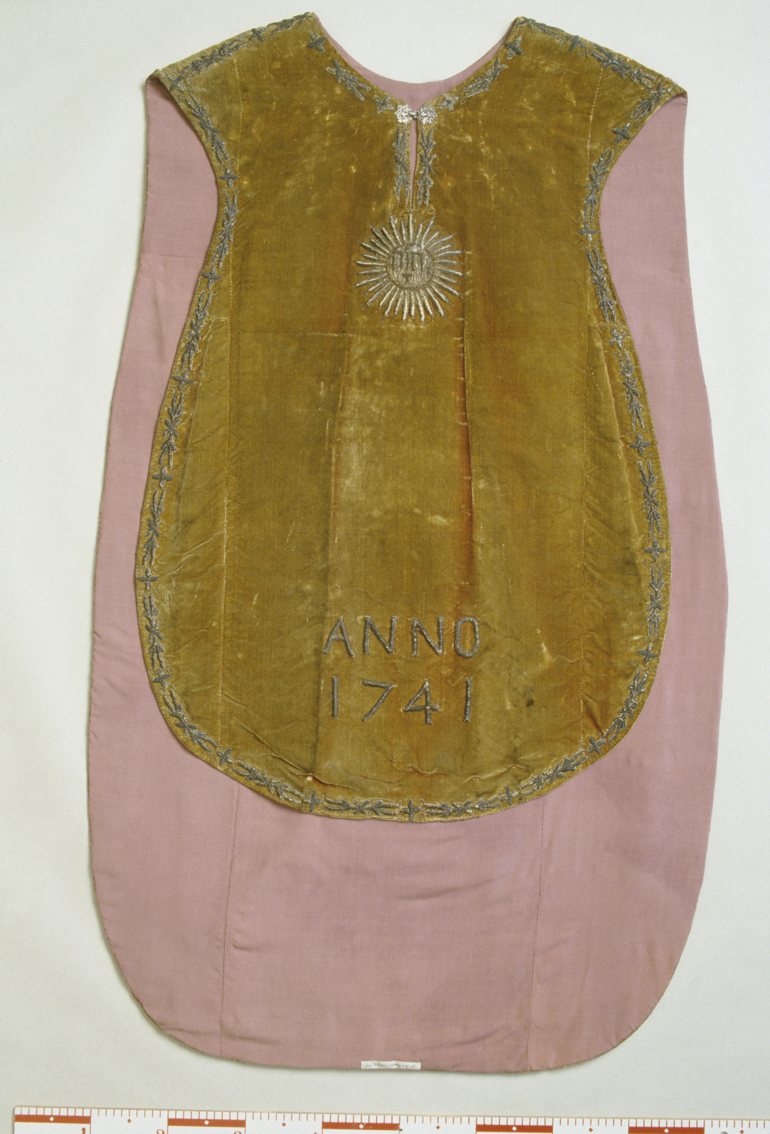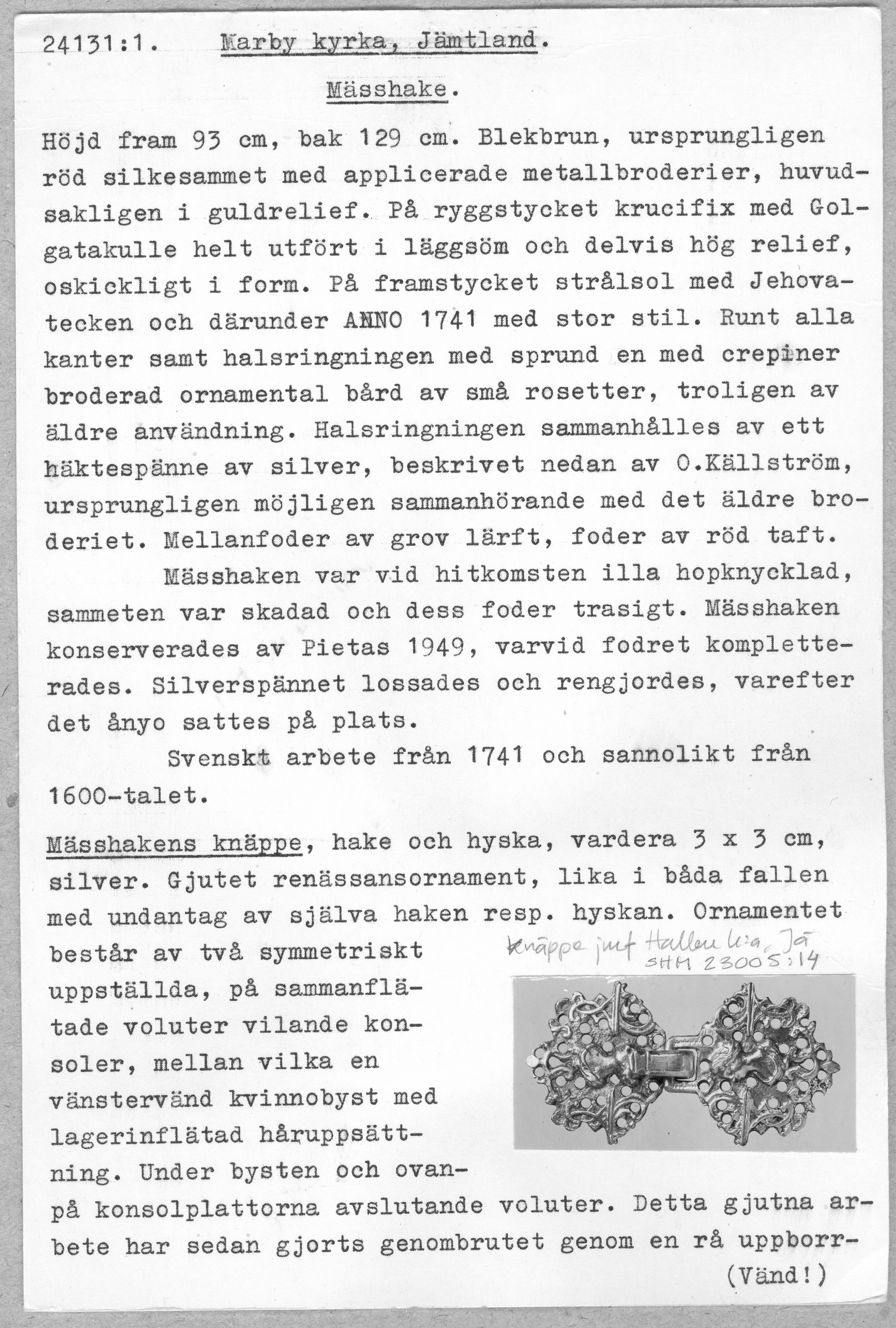 Röd sammet, krucifix, guld- och silverbroderi, strålsol, metallspänne. Deponerad i SHM 1949.