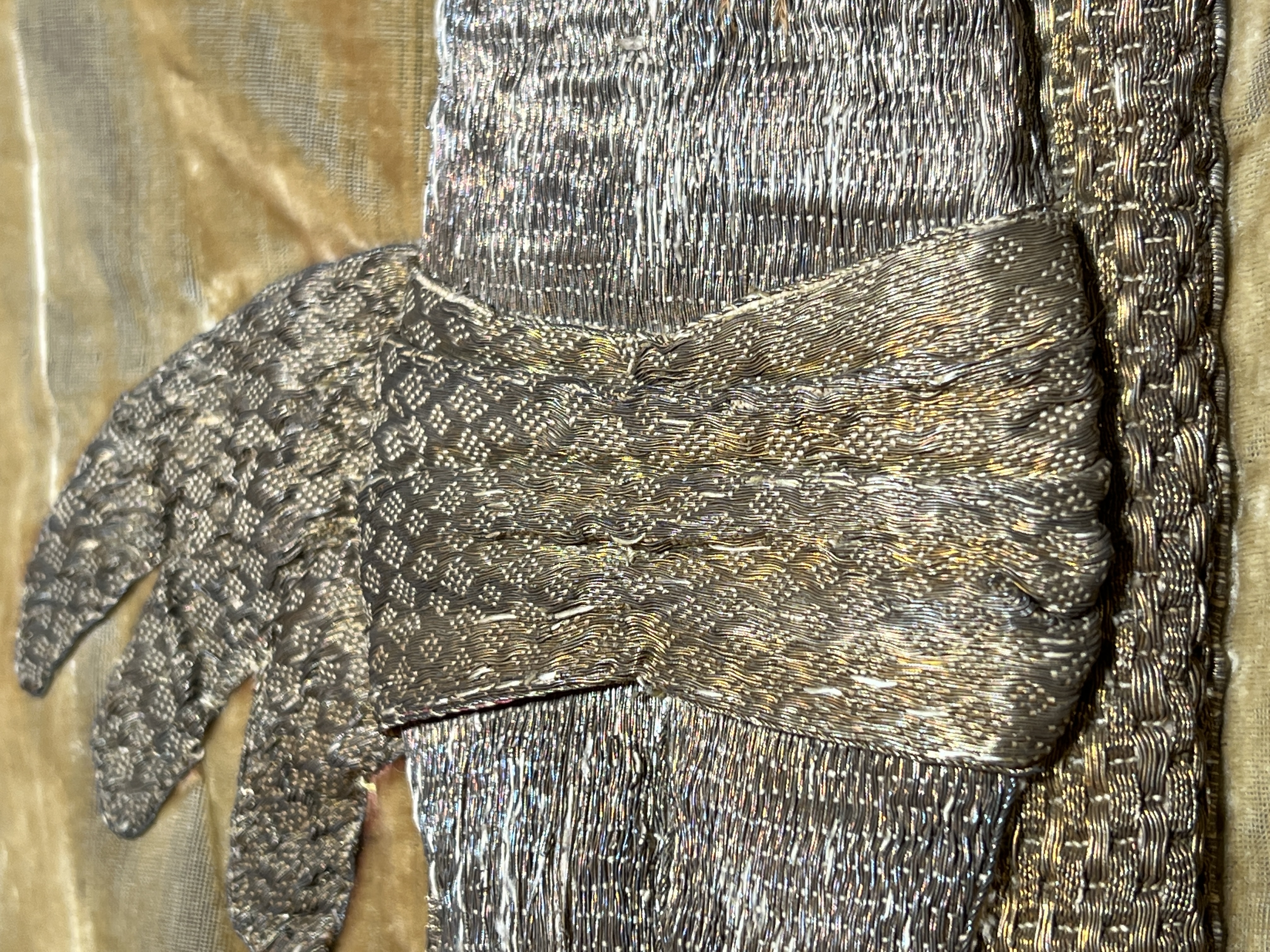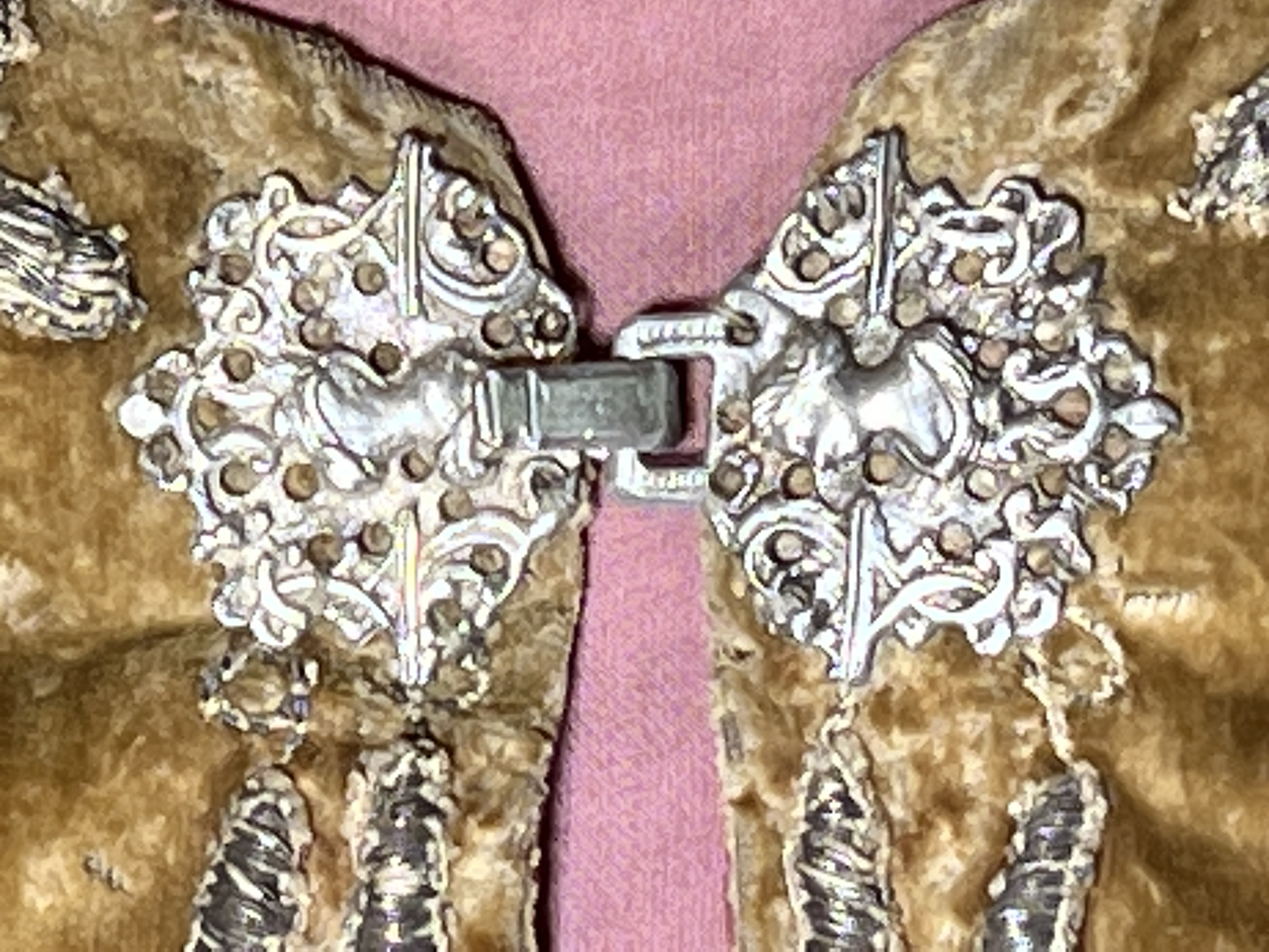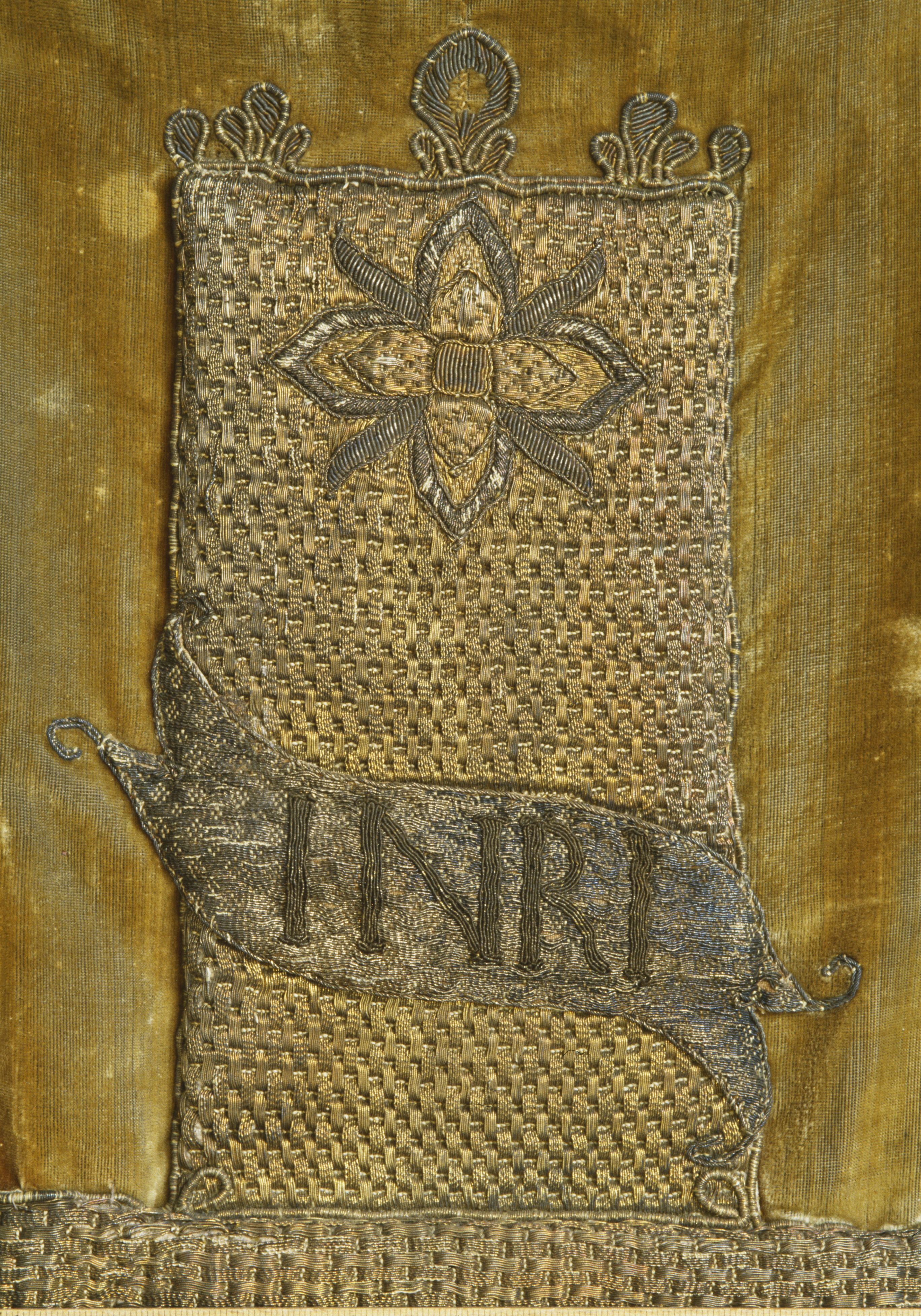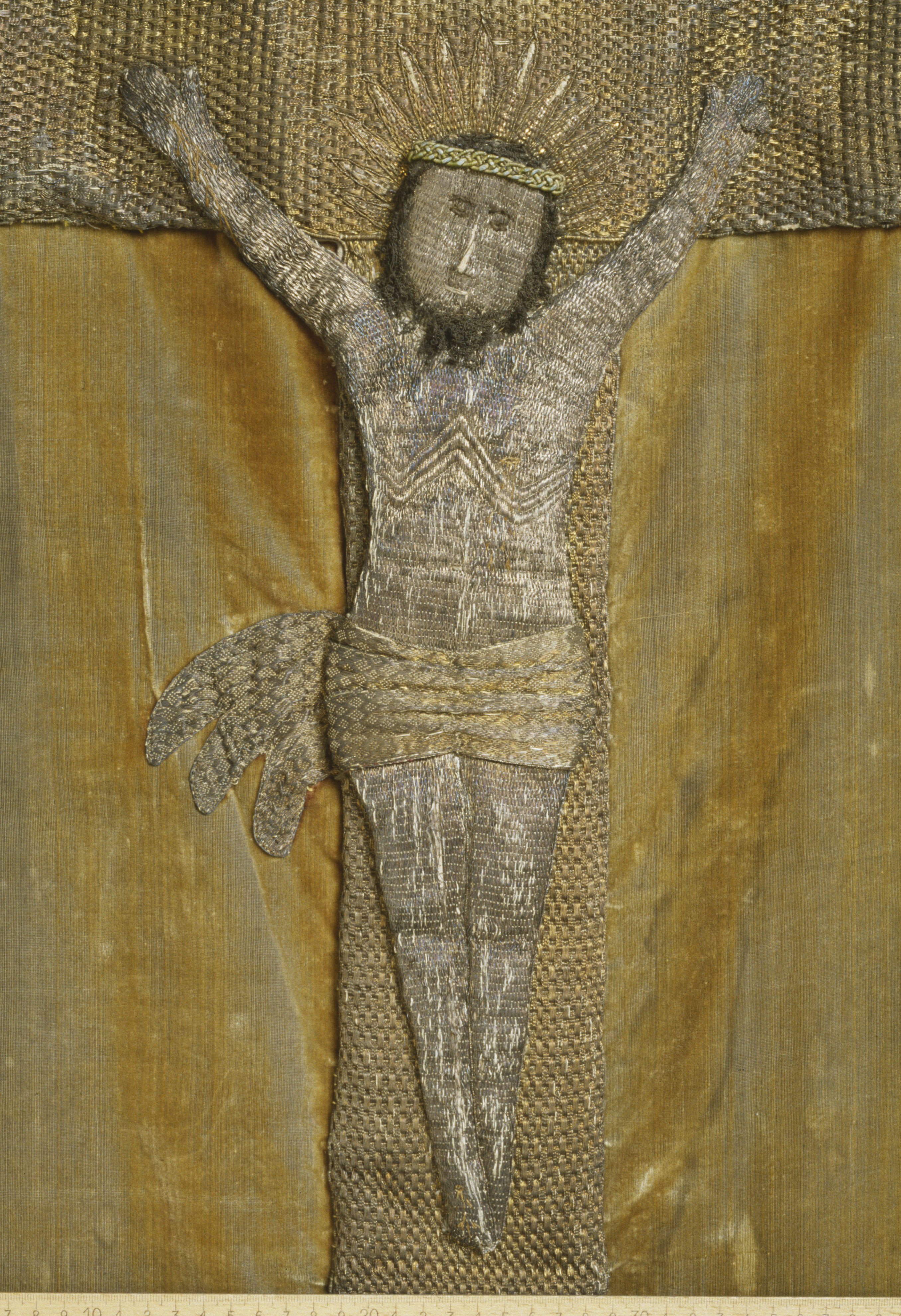 Röd sammet, krucifix, guld- och silverbroderi, strålsol, metallspänne. Deponerad i SHM 1949.
