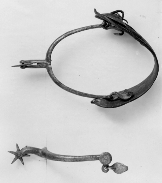 L: 145 mm, b: 118 mm, vikt: 185 g Sporre av stål med u-formade skänklar och 37 mm lång något nedåtböjd hals med sexuddig klinga (en udd avbruten). Vid ena skänkelns ände rund knapp på hals. I den andra rund kraftig remsölja med bred kant. Mellan dessa 35 mm bred vristrem av läder medkantstickning. Vid ändarna nedre kant kraftiga hakar (för hålfotsrem).