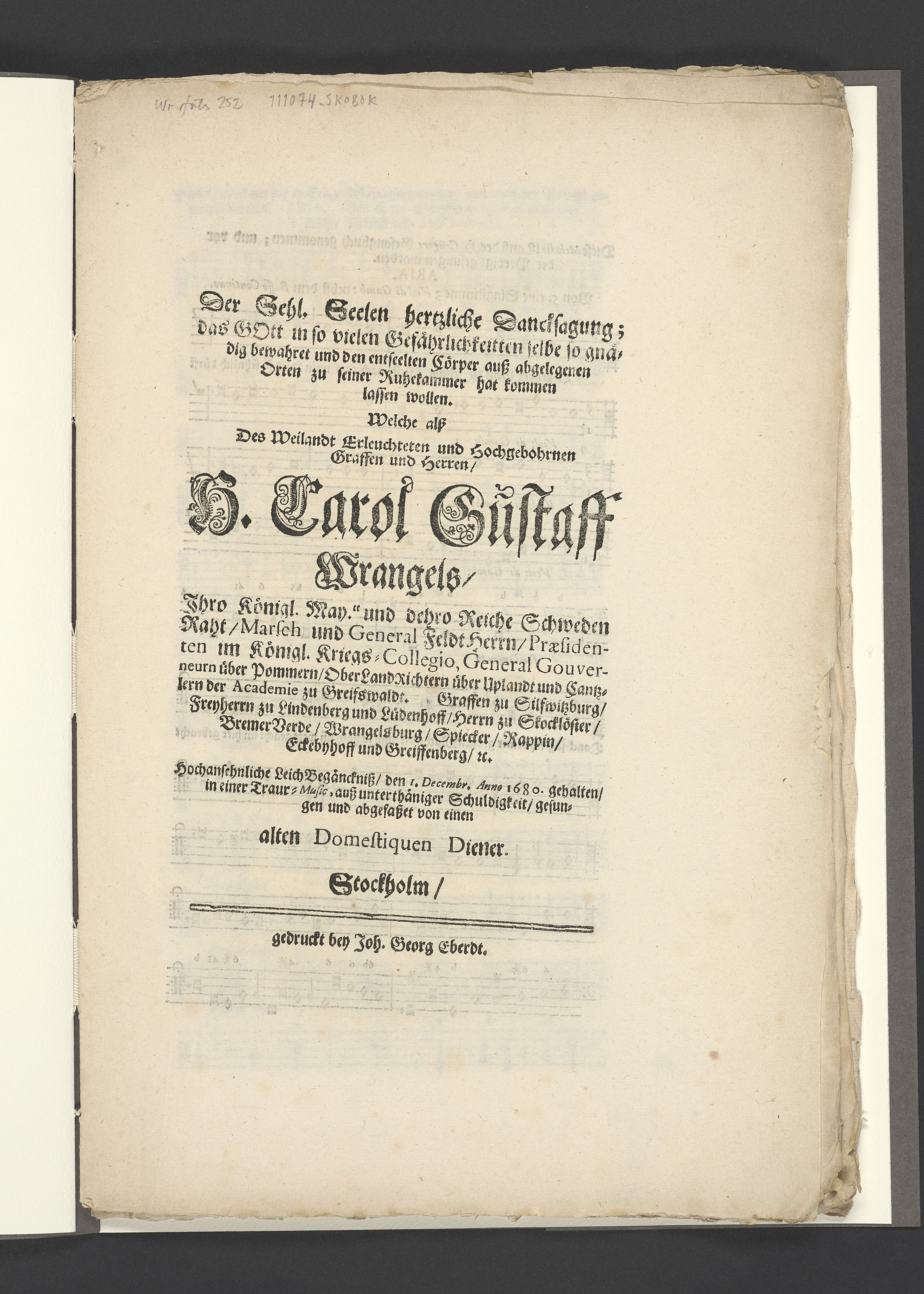Der Sehl. Seelan hertzliche Dancksagung...alsz des...Herren H. Carol Gustaff Wrangels...Leich Begäncknisz, den 1 Decembr. Anno 1680. gehalten...abgefaszet von einen alten Domestiquen Diener. Stockholm, gedruckt bey Joh. Georg Eberdt