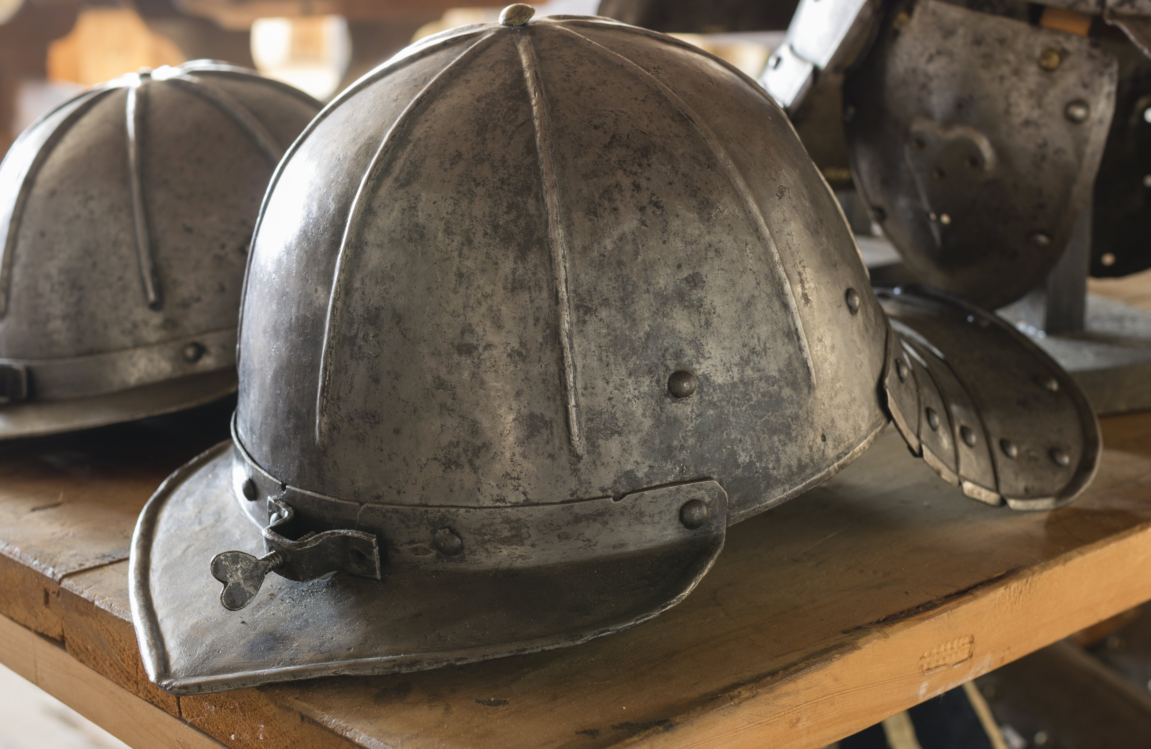 Hjälm, zischägge eller s k ungersk stormhuva. Av svartmålat stål. 1600-tal. Sammanförd med rustning nr 14868. Hjälmklockan med från toppen utgående 8 snidade strålar. Rakt utgående pannskärm. Nackskydd i form av 4 lameller. Ett öronskydd (höger).