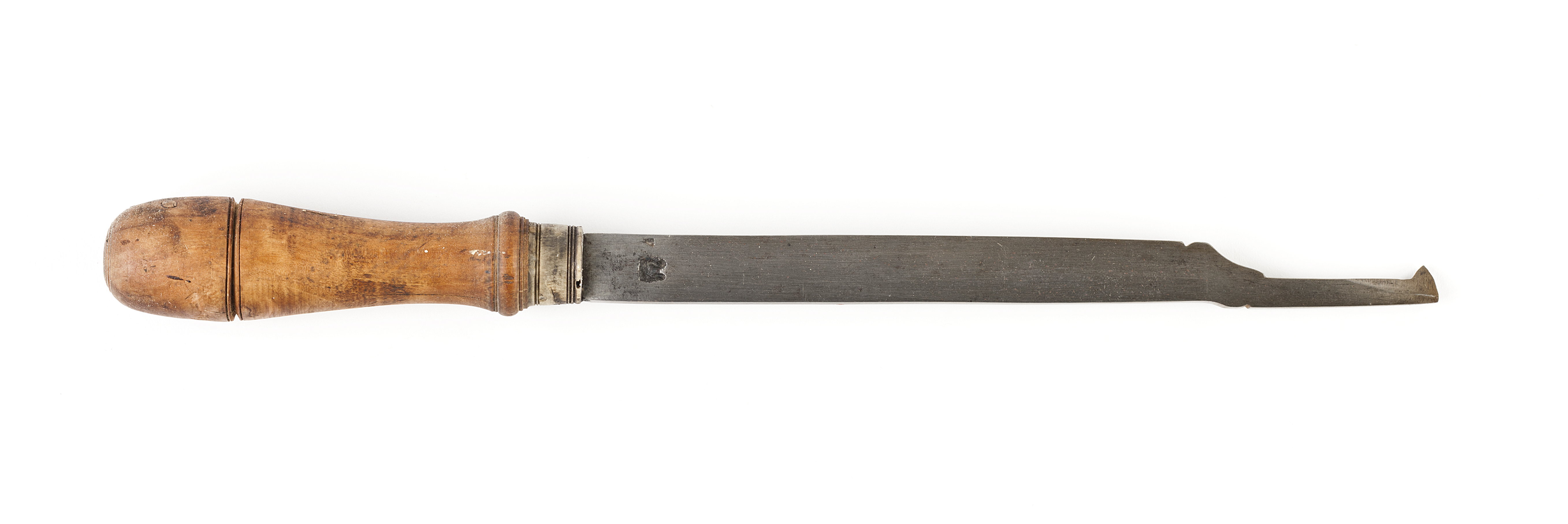 Klinga med rektangulär genomskärning, via profilering övergående i smalare ände. Vinkelböjd, spetsig egg. Stämplat på klingan: oxenstiernska vapnet. Svarvat skaft av päronträ, med en vulst nedtill. Hornring.