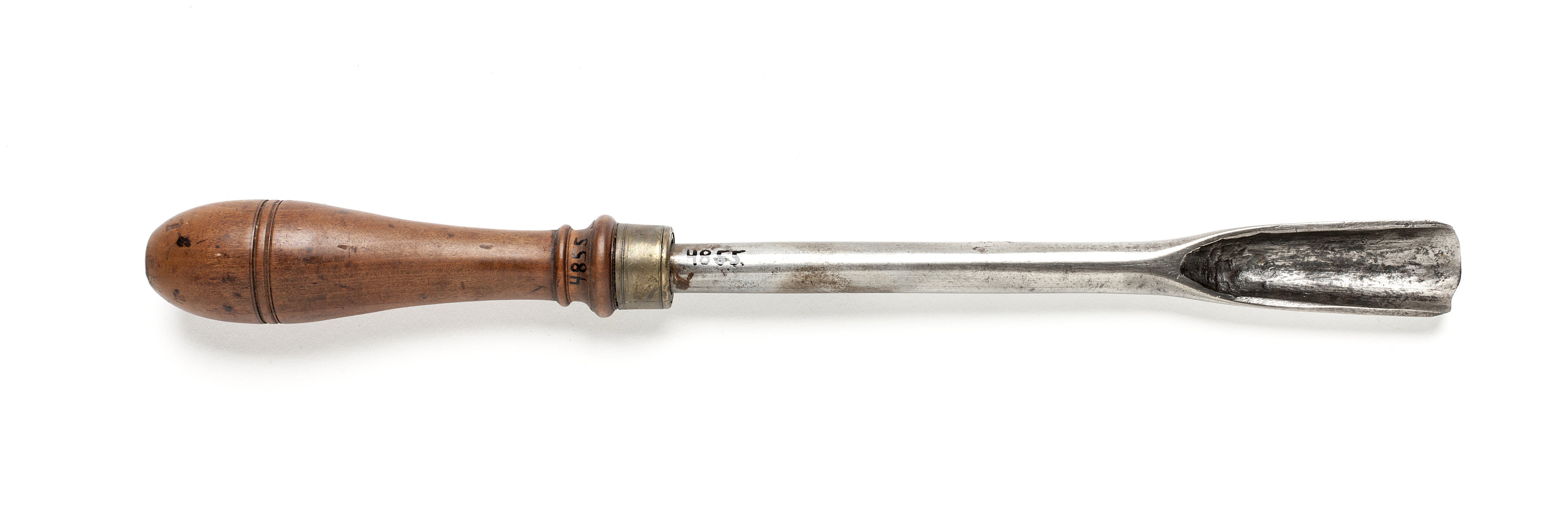 Rund klinga. Svarvat skaft av päronträ med två vulster nedtill ("skoklostertyp"). Mässingsring.