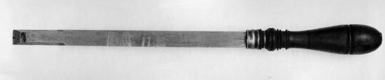 Slätstål med rak egg framtill och på sidorna. Klinga med rektangulärt tvärsnitt. Svarvat, profilerat, kägelformigt skaft, dekorerat med svarvade ringar och vid fästet med en rad vulster. Fästet är skott med en profilerad mässingsring. Mått: L: 431 mm, skaftl: 152 mm, största diam: 36,5 mm, egg b: 18,0 mm Stämpel: IK under krona, ett P 4 mm ovanför, proberstämpel?