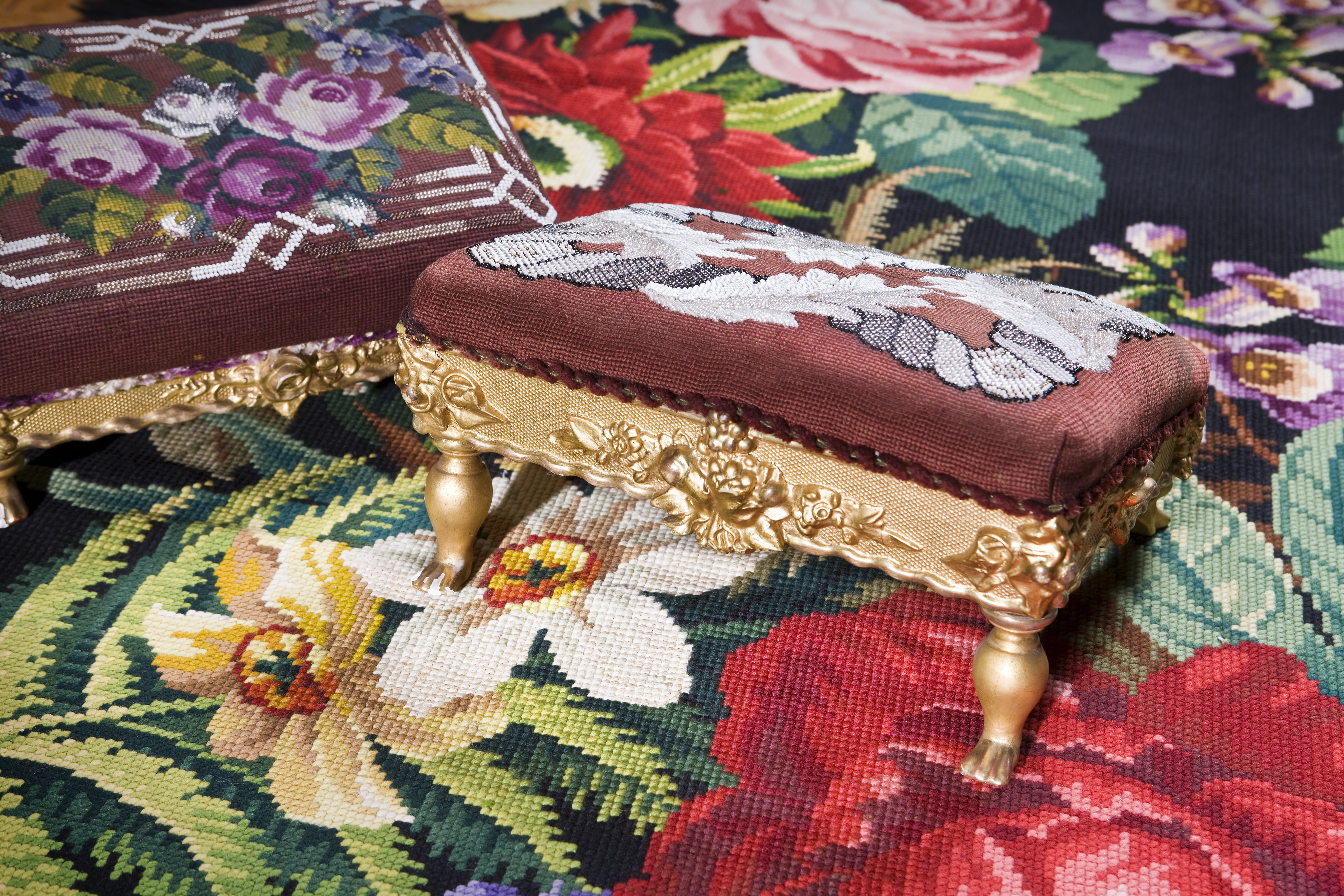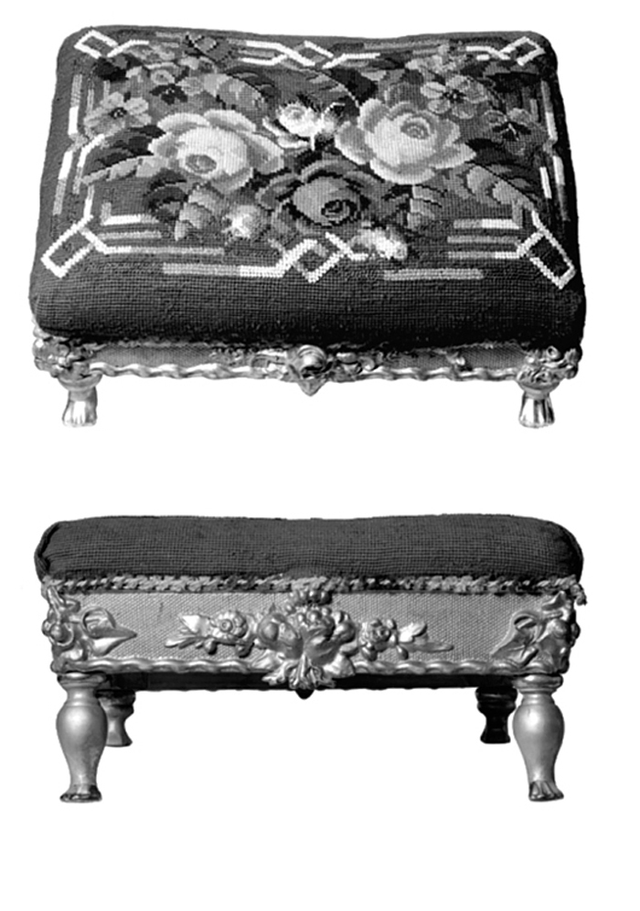 PALL. Rektangulär, med fyra ben, sarg och framåtlutande sits, stoppad samt klädd med broderi i korssöm av sefirgarn och filosellsilke samt pärlsömn på vit bomullsstramalj. Gåva till Wilhelmina Kempe på hennes lysningsdag 30 april 1865.