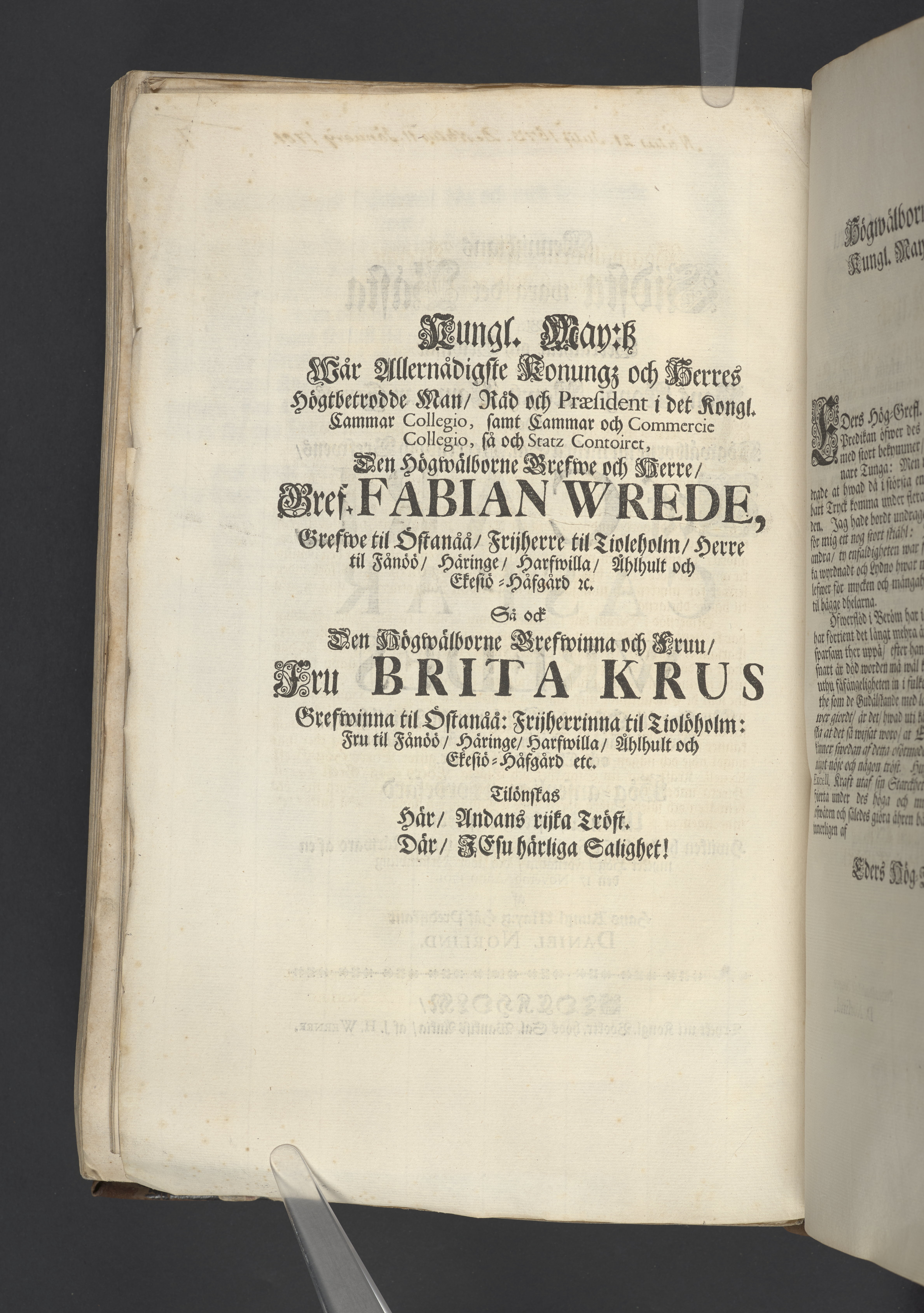 Menniskians sidsta wara det bästa blef betrachtat och bewijsat wid hans kongl. may:tz cammar-herres den högwälborne nu mehra sal. ... Carl Caspar Wredes ... hög-ansenlige jordefärd uti en christelig likpredikan hwilken hållen blef i St. Jacobi kyrkia under närwaro af en mycket hög, förnähm, och stoor försambling den 17 novemb. anno 1701. Af ... Daniel Norlind. Stockholm, tryckt uti kongl. booktr. hoos sal. Wankifs änkia, af J.H. Werner.