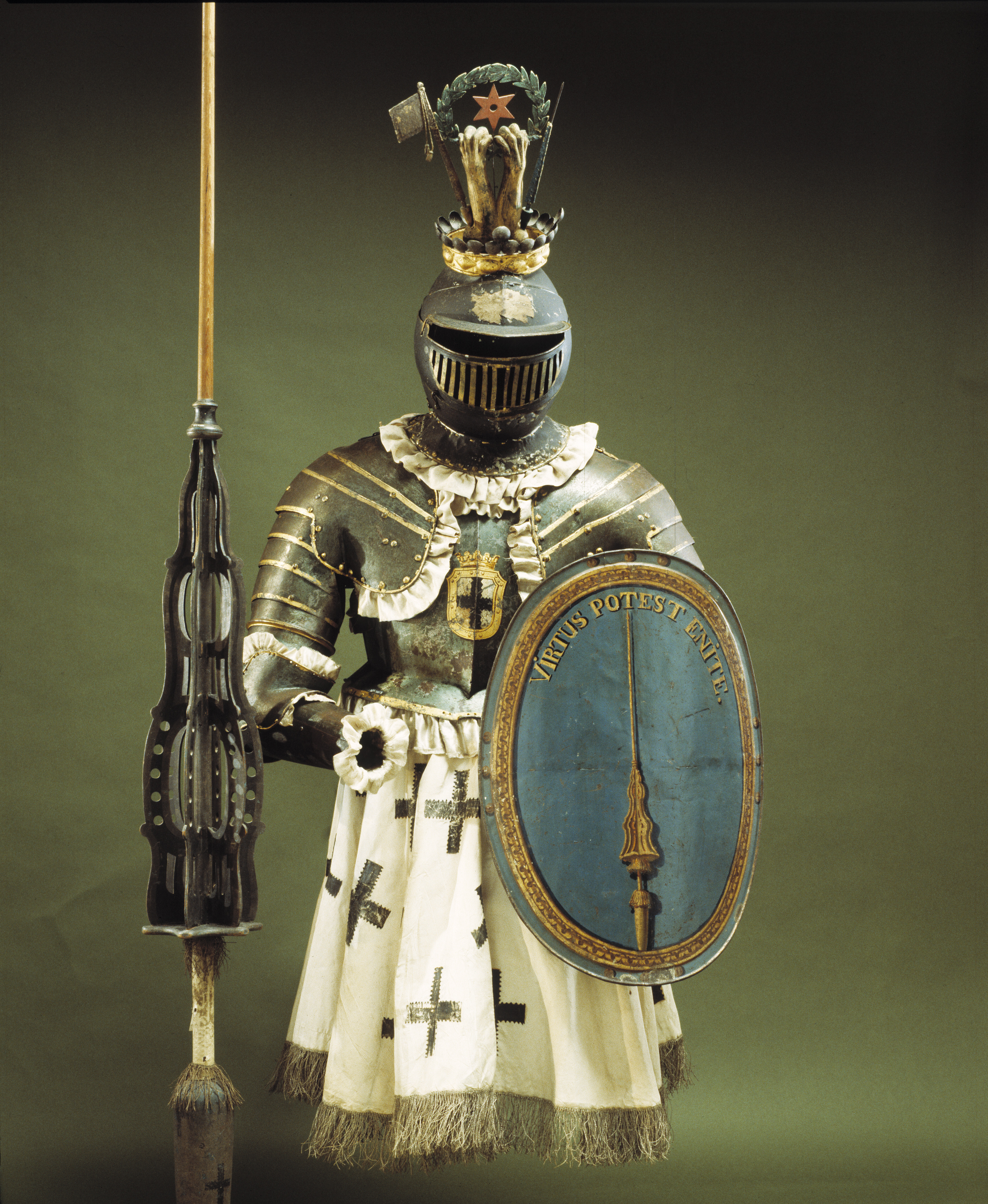 Hjälm av tunn bleckplåt med gallervisir. Hela hjälmen övermålad med svart färg. Gallret samt smala kanter runt visiret belagda med guldfärg. Detta är avnött på åtskilliga ställen och grön färg syns. Fast krage med täta, runda, välvda guldmålade ornament (imiterade nithuvuden). Utmed kragkanten 42 mm bred kant av rynkad vit atlas. Kanten är fodrad med gult kläde. På visirets pannklaff sitter en söndrig, fastklistrad etikett med otydlig text: "Eric Reinh.A-- //Tornerspel---" I nacken, vid kragen 57 mm lång, guldmålad plymhållare. Nedanför denna, fästad i kragen, brun lädertamp. På hjälmklockan är fastlött en friherrlig krona, kronringen guldmålad och de halvsfäriska"kulorna" är överdragna med svart färg. I kronan sitter en hjälmprydnad av trä och stål bestående av två guldmålade uppåtriktade lejontassar hållande en grönmålad lagerkrans, inneslutande en sexuddig rödmålad stjärna. Vid den ena sidan en tornerfana vid den andra endast lansen (fanan saknas). Den förra målad med guld den senare blåmålad. Hjälmprydnaden utfördes av JeanBaptiste Masreliez ca år 1800. (Gnr 45/80) Rustningen har burits av greve Fredrik Sinclair (1751-1816) under riddarspelen på Adolf Fredriks torg 1777 i Gustav III:s kadrilj. Hjälmen bars av friherre Erik Reinhold Adelswärd (1778-1840) på Drottningholm år 1800.