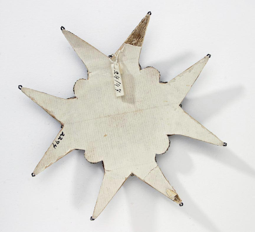 Malteserkors broderat med silverlan, -kantiljer och -palmetter, serafer av silverlan och silvertråd. Medaljong täckt med ljusblå sidenmoare, därpå broderat IHS, kors av silverkantiljer och paljetter, tre spikar av silvertråd samt tre kronor och kantbård av kantiljer och paljetter av förgyllt silver. På baksidan klistrat vitt papper.