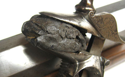 Pyrit med blanksvart yta och rundad främre del. Mantel av grå blyplåt.