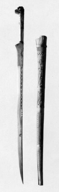 Fäste av stål i ett med klingan. Åttkantigt tvärsnitt, upptill böjt och kantigt. Övre hälften beslagen med mässing med graverad linje och trängel dekor. Nedre hälften med punsade linjer och smala påslagna mässingsränder. Klinga av stål, 29 mm bred, eneggad med rak rygg och utdraget s-formad egg. Ryggen dekorerad med påslagen mässing och punsat sicksacklinje, klingans sidor med mässing och punsade linjer i geometriskt mönster längs ryggen. Närmast fästet månskära.