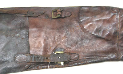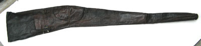 Av mörkbrunt läder, dubbelvikt med längsgående söm på undersidan. Långsmalt, platt och framåt avsmalnande form. Framparti och lock av separata stycken. Frampartiet tvärt avslutat med cirkulär skinnbit fastsydd med kraftiga kanter. Locket fyrkantigt, upptill fäst med dubbel söm av gul tråd. Låses genom i framkant påsydda hålslagna läderremmar, b 18 mm, varav den ena är av. På fodralet två söljor med rektangulära ramar av mässing fästade i 45 mm långa påsydda remmar.