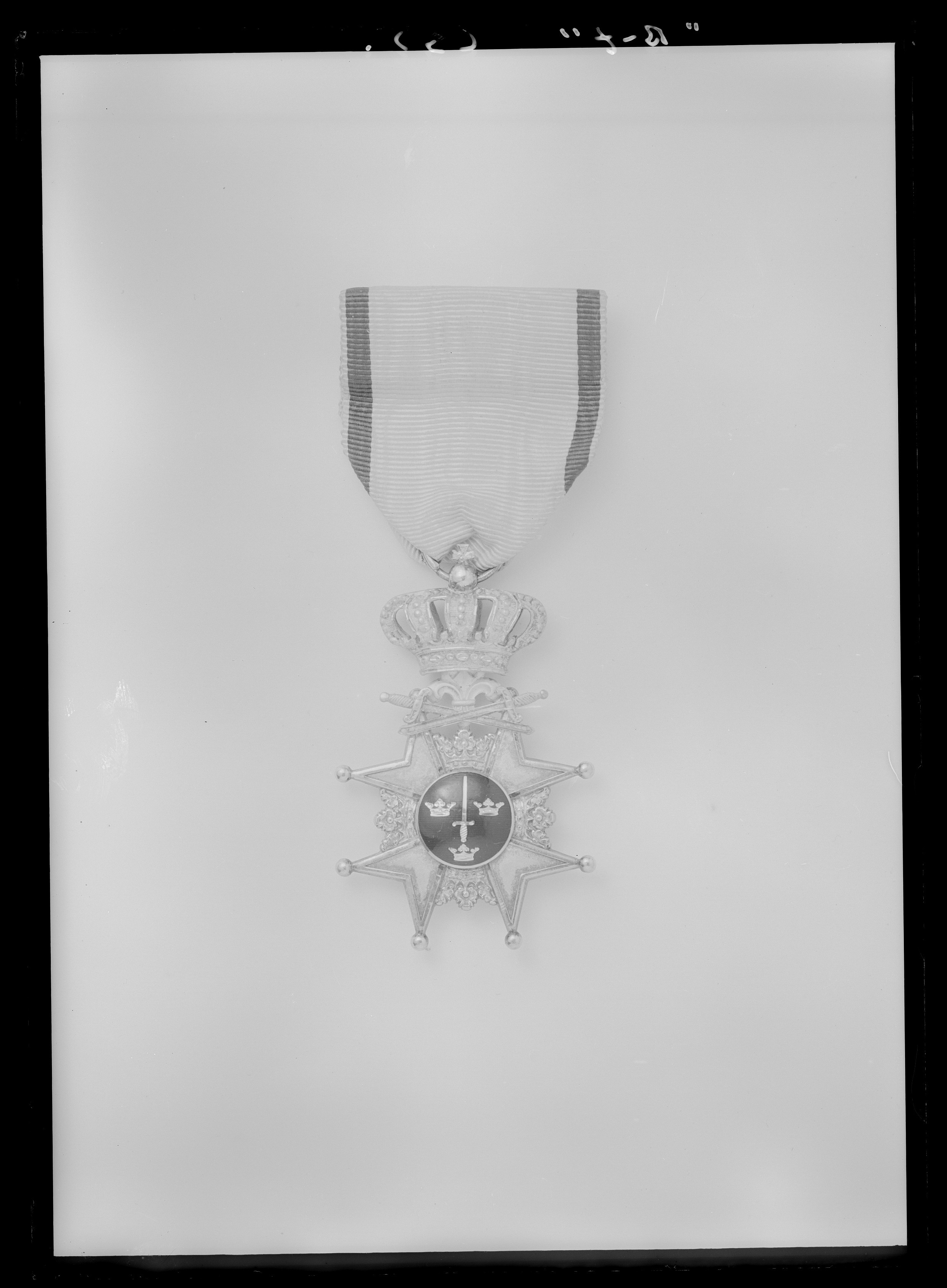Av samma utseende som Svärdsordens riddarkors, dock av silver, enbart framsidans medaljong är emaljerad. Stämplar på liljeornamentets baksida: CFC, tre kronor, S. (C F Carlman. Stockholm).