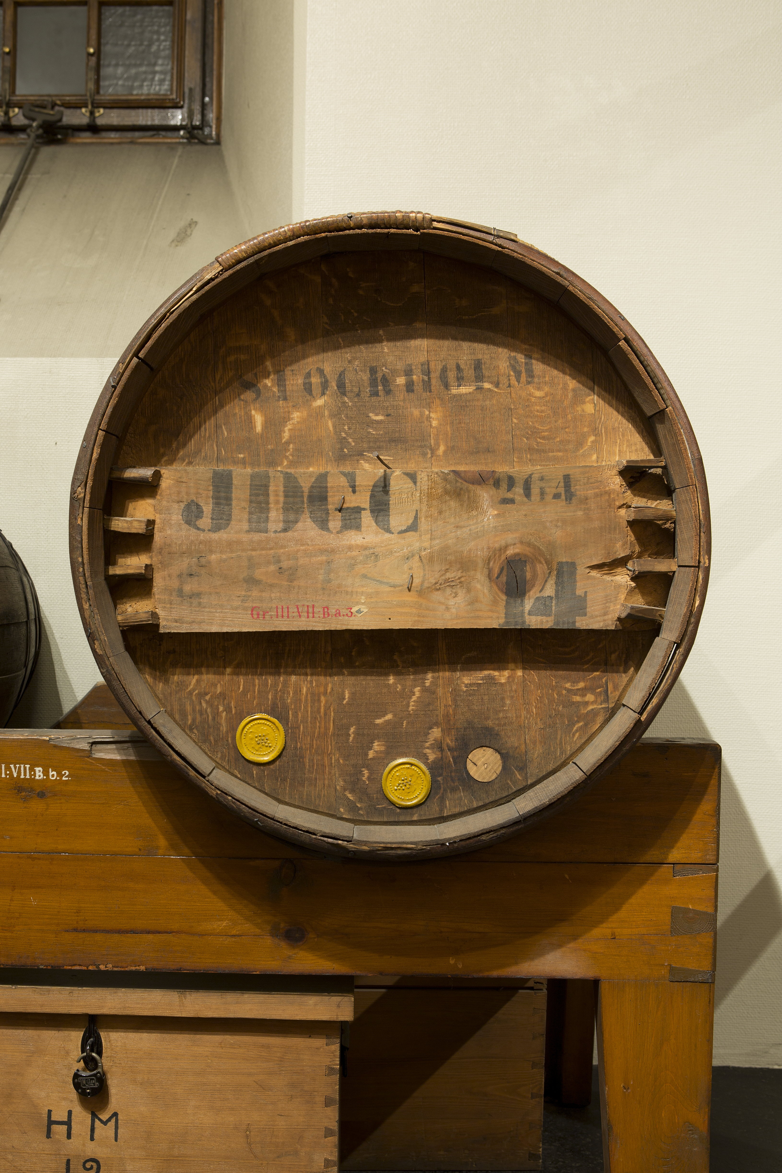 VINFAT (tomfat, Bordeaux-barr) Av ek. Bukigt, med bottnarna insatta i stavarna medelst en i stavarna inskuren s. k. krösning, på vardera bottnen en tvärgående bred regel, fäst vid vardera änden med fyra fyrsidiga pinnar. Band dels av järn, dels av trä, de förstnämnda sex stycken, hopsatta varje med två nitar, de sistnämnda två stycken, av hassel, hopsatta medelst en lindning av smala rottingskenor samt anbragta vid ena änden. På fatets ena botten i svart, ovanför regeln: STOCKHOLM, på regeln: J D G C, till höger: 264; nedtill på regeln otydligt skrivet: E 747. 22, längst till höger: 14; nedanför regeln två gula lacksigill med en druvklase inom en pärlrand, till höger om dessa ett igenkorkat kranhål; på buken ett sprund, fyllt med en träpropp jämte en flerdubbel tvåskaftad linnelapp som mellanlägg. På motsatta botten ingen skrift. Höjd: 93 cm.; Omkrets: 211 cm. Inköpt av Wilhelmina von Hallwyl den 5 November 1929, hos Aktiebolaget J. D. Grönstedt & Co., Stockholm.