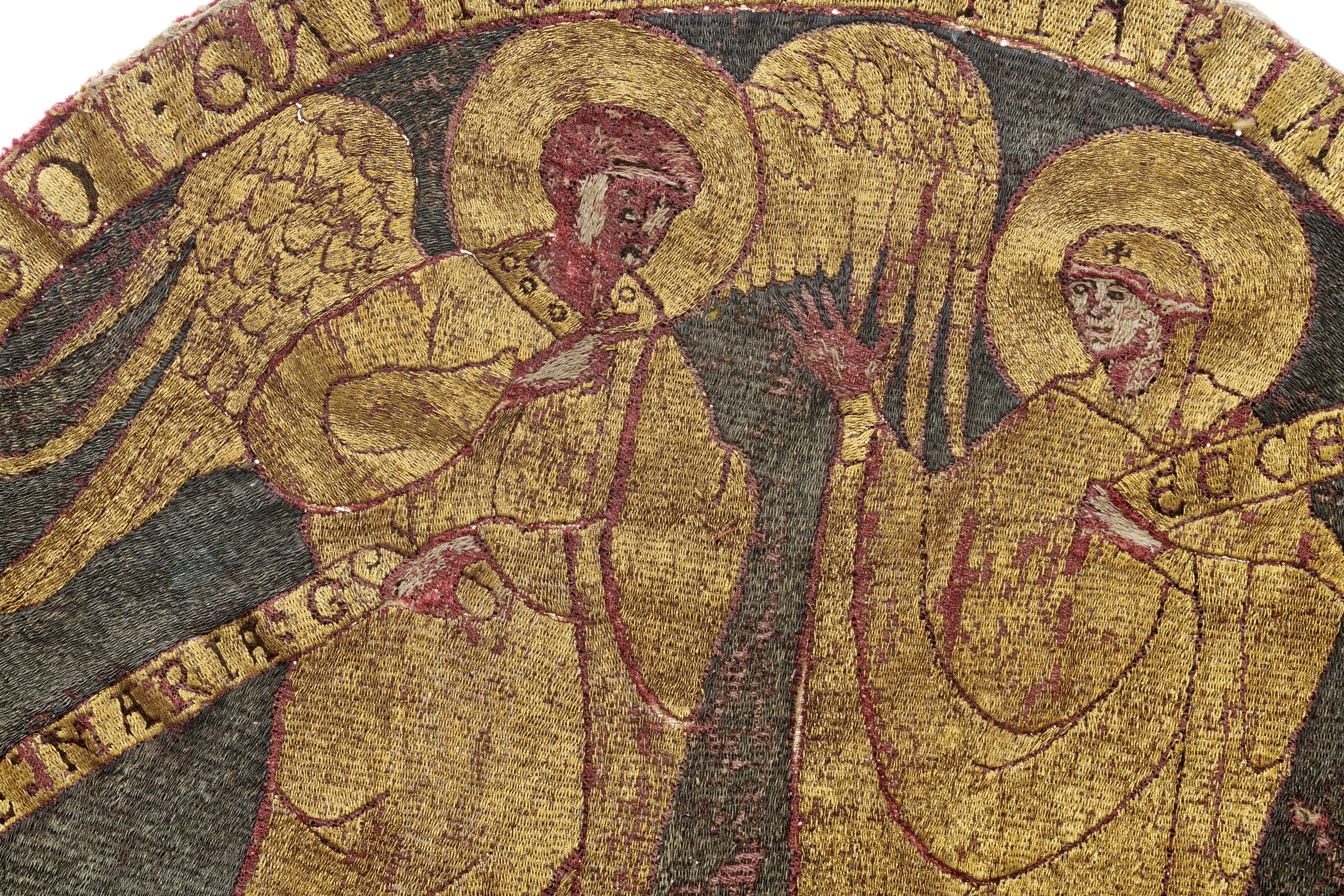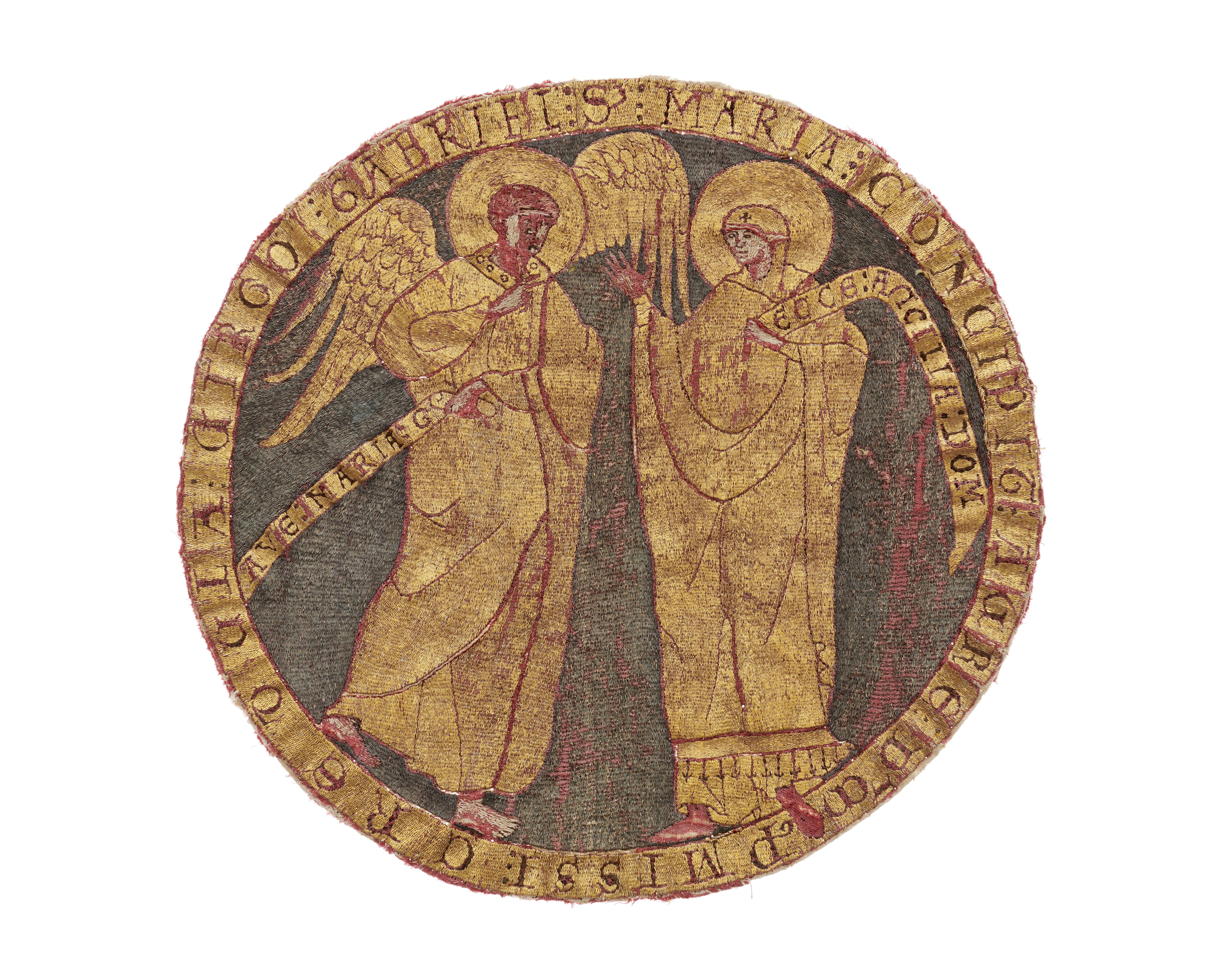 Guld-, silver- och silkebroderad rundel på röd samitum med framställning av Kristi liv. Broderiet utfört i neddragen läggsöm och klyvsöm. Troligen franskt arbete, sent 1100-tal. Scen Bebådelsen