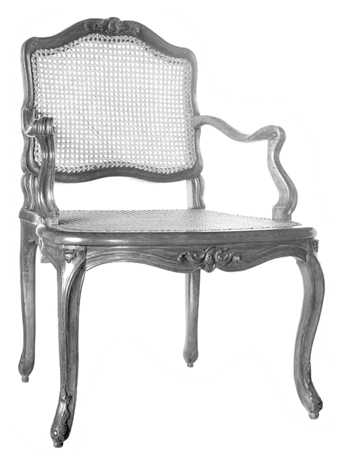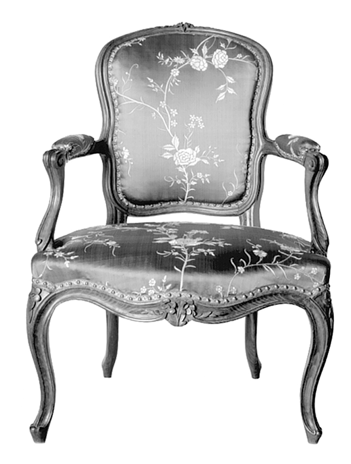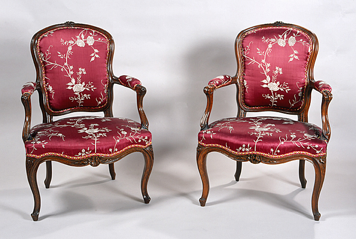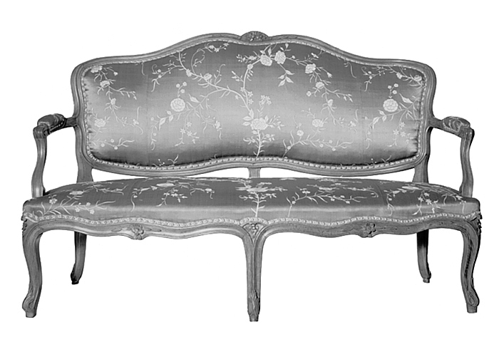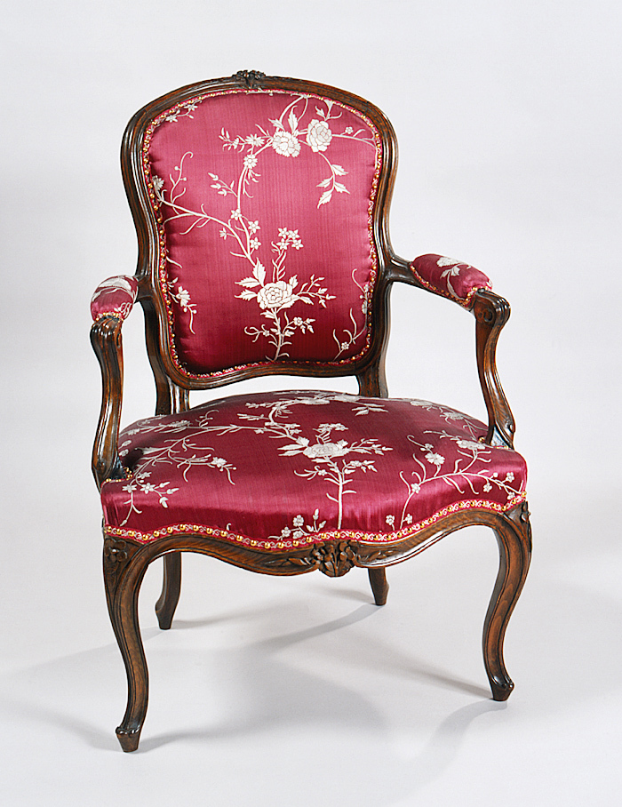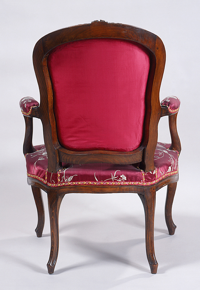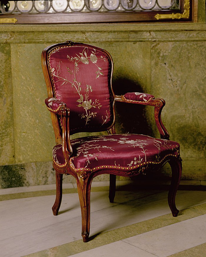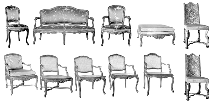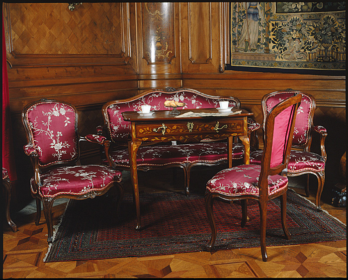MÖBELUPPSATS. Bestående av en soffa, en taburett (fotpall), sex länstolar och åtta stolar av olika ursprung. Soffan, de två länstolarna och sex stolar är av rödbok, snidade och polerade, stoppade med tagel samt klädda med rött siden. Två stolar med hög rygg från 1700-talets förra hälft (möjligen schweiziska arbeten) är av valnötsträ, med inläggningar av ljusare och mörkare träslag samt polerade. Länstolarna "typ 1" (enligt katalogiseringen 1932) utgör ett par, där den ena under sargen är stämplad N.HERTAUT, vilket står för Nicolas Hertaut (1720-1771), stolmakare och ämbetsmästare i Paris. De kan dateras till 1755-60. Länstol "typ 5" är stämplad C L BURGAT, d v s Claude Louis Burgat, verksam som stolmakare och ämbetsmästare i Paris 1744-1782. Hans verkstad vid Rue de Clery producerade högkvalitativa sittmöbler, och i Sverige finns Burgat representerad på Stockholms slott. Fotpallen har utgjort del av en s k duchesse brisée - en schäslong bestående av fåtölj, fotpall och ibland även en tredje motstående fåtölj.