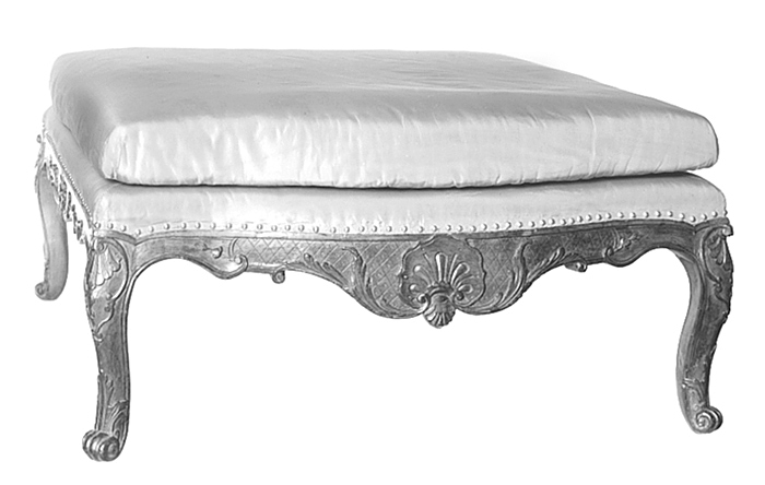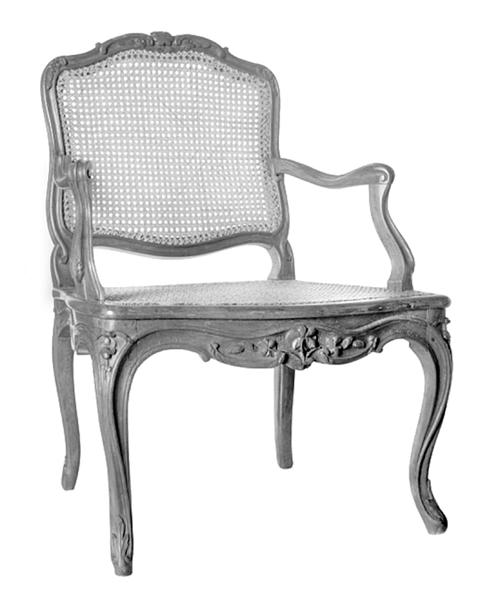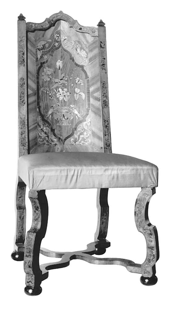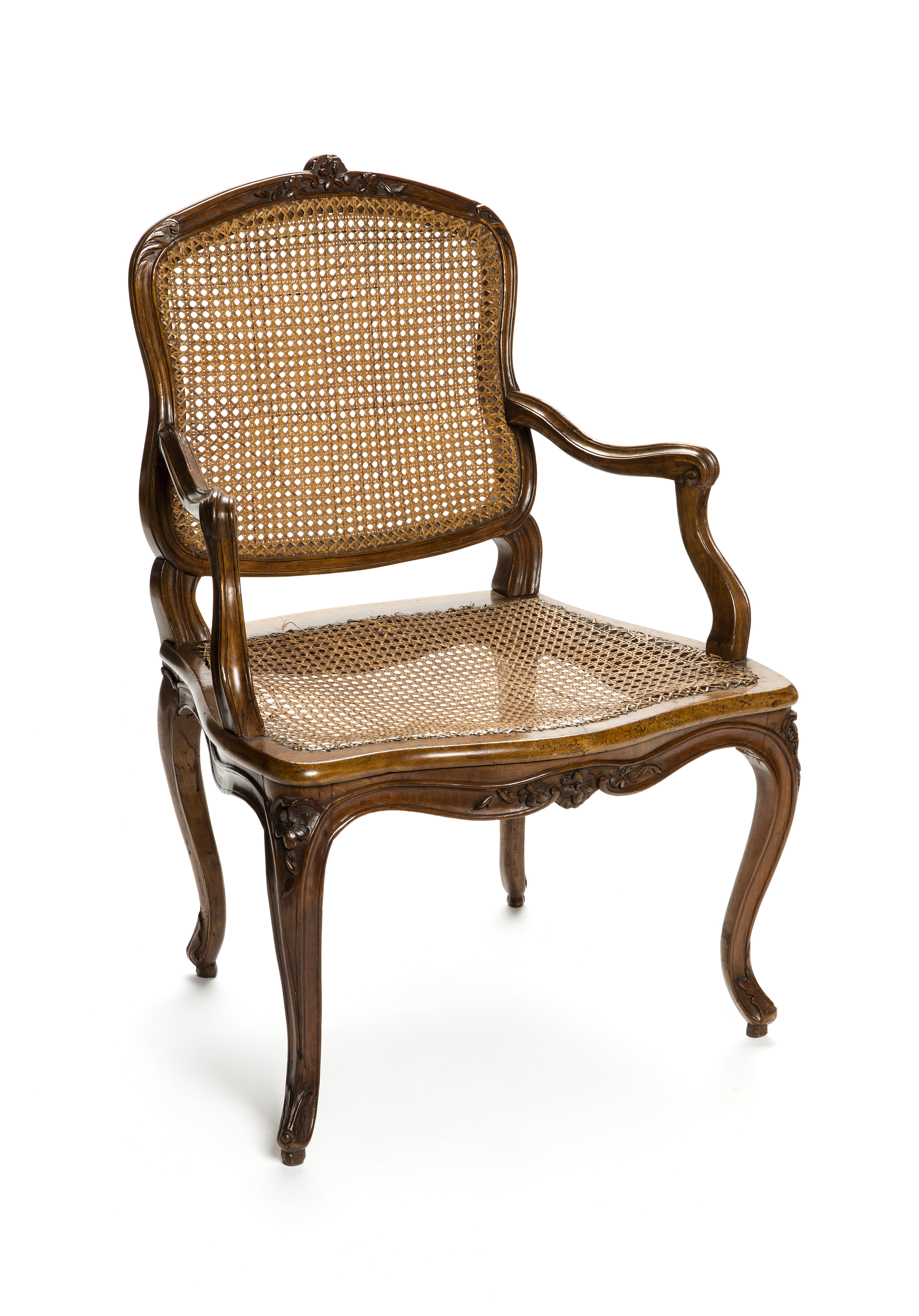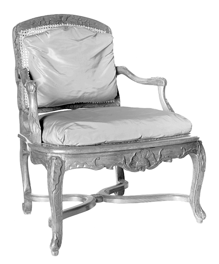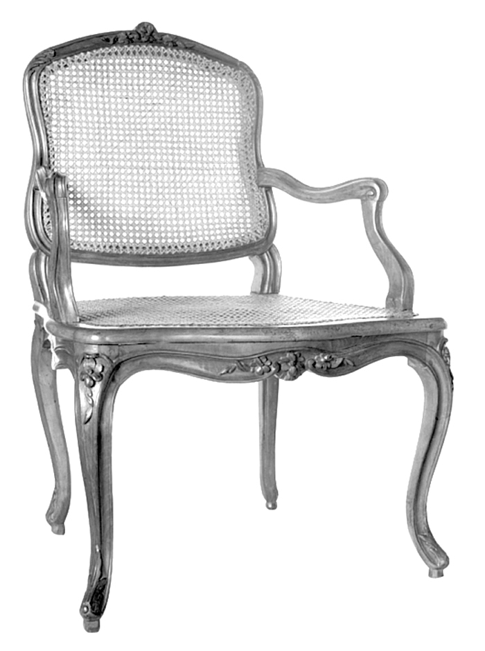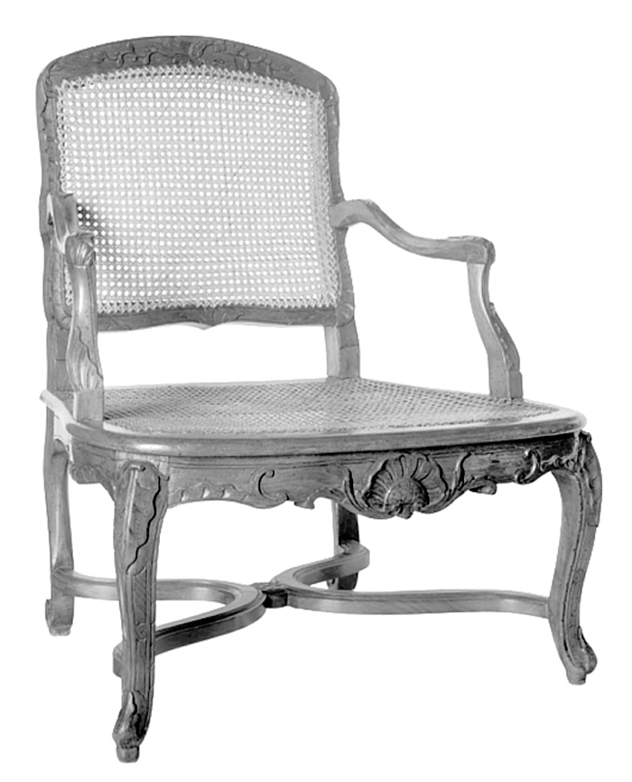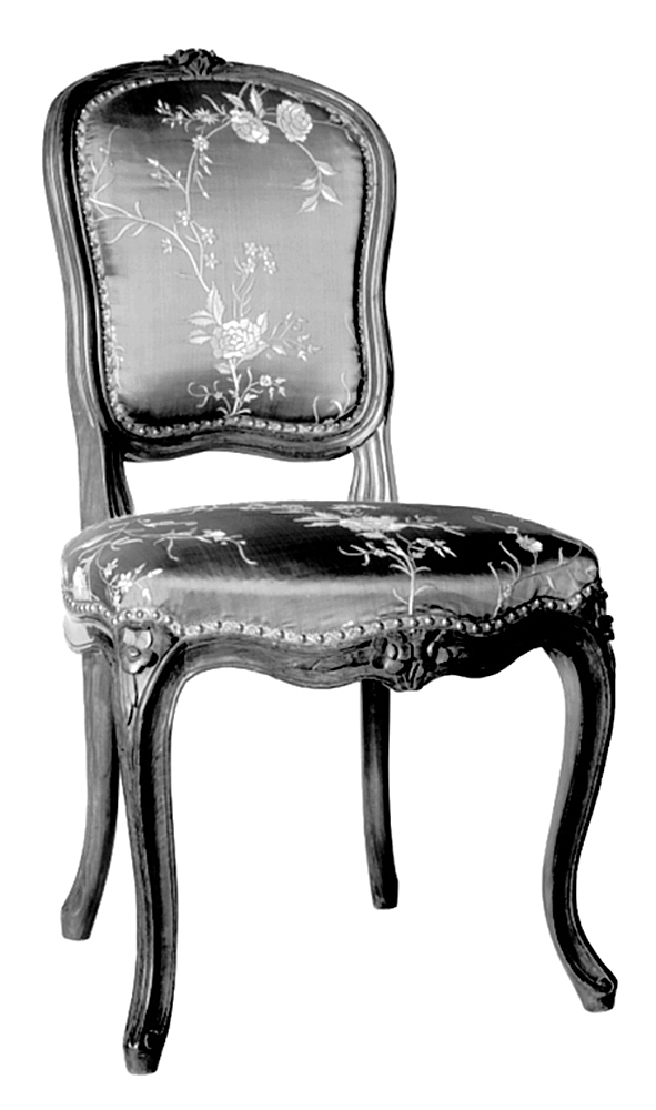 MÖBELUPPSATS. Bestående av en soffa, en taburett (fotpall), sex länstolar och åtta stolar av olika ursprung. Soffan, de två länstolarna och sex stolar är av rödbok, snidade och polerade, stoppade med tagel samt klädda med rött siden. Två stolar med hög rygg från 1700-talets förra hälft (möjligen schweiziska arbeten) är av valnötsträ, med inläggningar av ljusare och mörkare träslag samt polerade. Länstolarna "typ 1" (enligt katalogiseringen 1932) utgör ett par, där den ena under sargen är stämplad N.HERTAUT, vilket står för Nicolas Hertaut (1720-1771), stolmakare och ämbetsmästare i Paris. De kan dateras till 1755-60. Länstol "typ 5" är stämplad C L BURGAT, d v s Claude Louis Burgat, verksam som stolmakare och ämbetsmästare i Paris 1744-1782. Hans verkstad vid Rue de Clery producerade högkvalitativa sittmöbler, och i Sverige finns Burgat representerad på Stockholms slott. Fotpallen har utgjort del av en s k duchesse brisée - en schäslong bestående av fåtölj, fotpall och ibland även en tredje motstående fåtölj.
