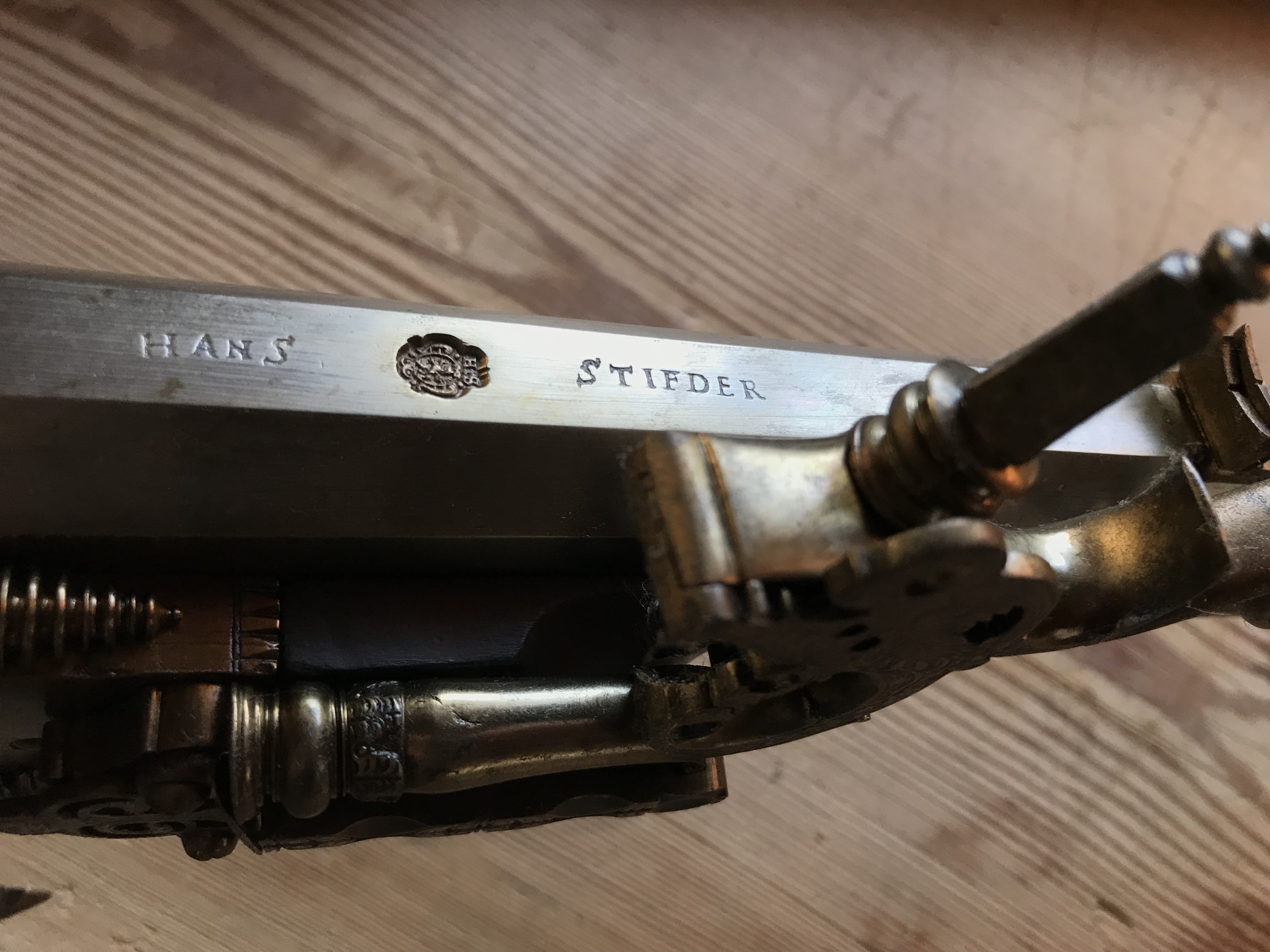 Hjullåsbössa av Hans Stifter, i par med inventarienummer 5663. Tillverkad i Prag. Åttkantig pipa av stål, 9 räfflor. Över kammaren inslaget "HANS STIFDER" och en stämpel med en grip och "H.S:" ovanför (se Stöckel 1042, Prag, 1645). Klaffsikte av stål med framförliggande gren, stolpkorn av mässing. Tre häften. Krysskruv från ovansidan. Hjullås med plant blånerat låsbleck av tysk typ, bakåt avsmalnande genom två fall. Plan genombruten hjulkapsel av stål, graverad. Bakåtböjd krutskärm. Fyrkantig tryckknapp genombruten. Hane med lös överkäke med delat s-formigt fingergrepp med inrullad ytterände. Hanhals med graverad dekor. På underkäken graverad platta i form av fågel. Hanfjäderstudeln i form av genombruten platta. Brun helstock av valnöt, med kolv av tysk typ med kolvlåda med lock av trä. Bakplåt av ben, stödkula av stål. På anslaget inlagd benoval bård kring graverad björn av ben. Två låsbrickor av graverat ben. Rörka och näsband av graverat ben. Avtryckare med snällare, varbygel av stål med 2,5 fingerläge, plan främre del. Tillbehör: Laddstock av trä, doppsko av ben, krats av stål. Märkt: 563 ovanför låsblecket, stanstyp 5376. 140 framför varbygeln, stanstyp 5373.
