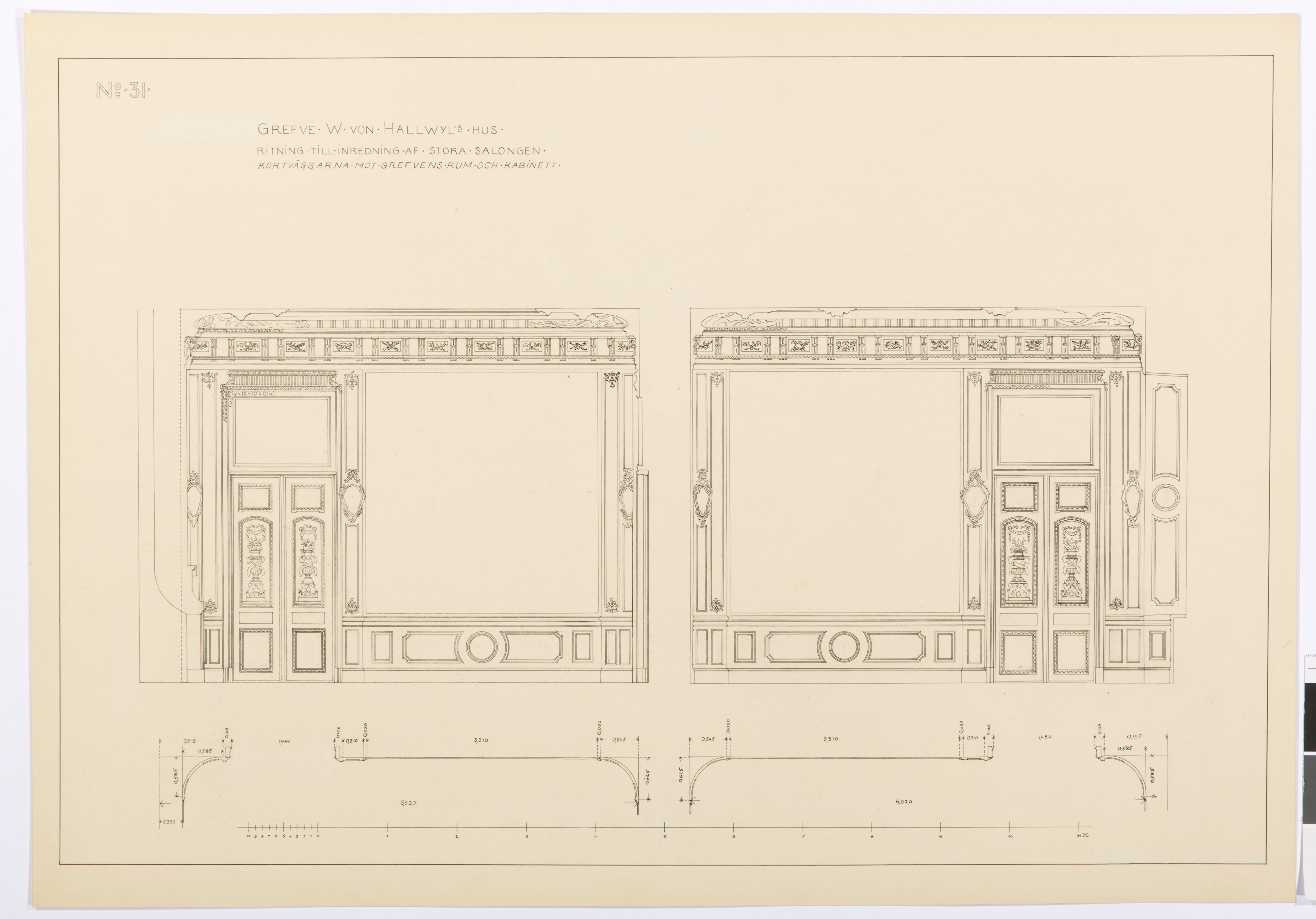 Nr 31. Ritning till af stora salongen kortväggarna mot grefvens rum och kabinett. Huvudritningar.