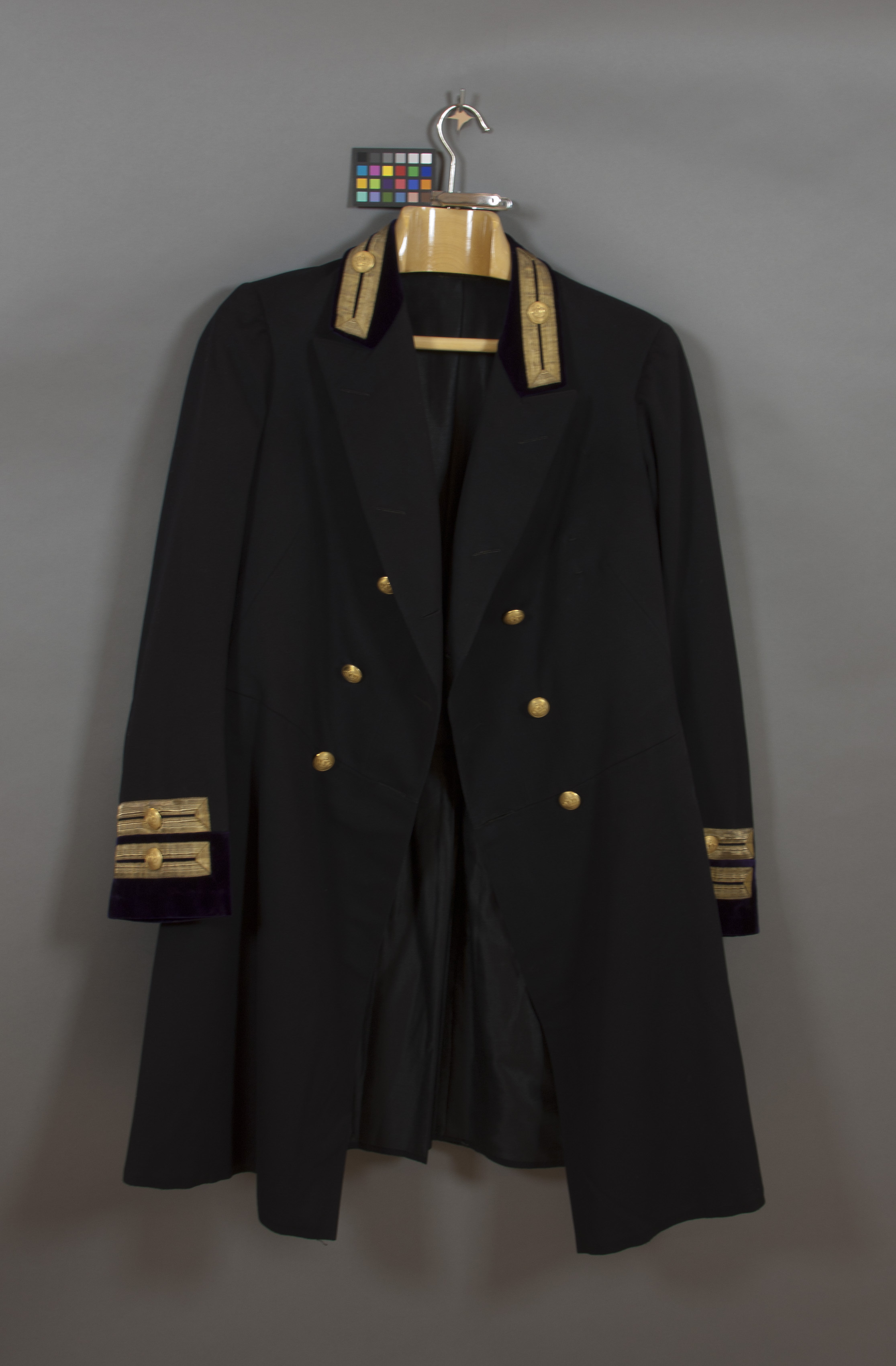 Uniformskappa av mörkblått kläde tillskuren med livsöm, fällkrage och uppslag. 2 rader och 4 knappar. På v.sida 4 små tränsar för fästande av ordenstecken. Fällkragen och ärmuppslag av mörkviolett sammet med guldgaloner i form av s.k. knapphål samt knappar, på vardera ärmen 2 dylika och på kragen 2. På ryggen, i livsömmen på vardera sidan om sprundet 1 knapp. Summa 16 runda, förgyllda och välvda knappar med kunglig krona. På v. framstycke 50 mm lång horisontal slits för värja. Svart sidenfoder (?). Baktill vid kragen firmamärke i gult mot svart botten: "F.R.KAEDING KONGL. HOFSKRÄDDERI STOCKHOLM". En inner- ficka. Vitt foder i ärmarna.