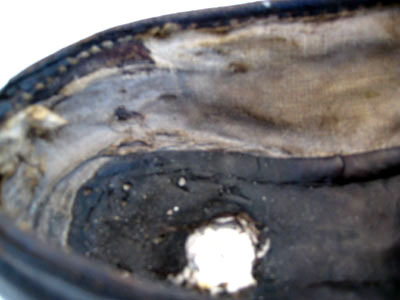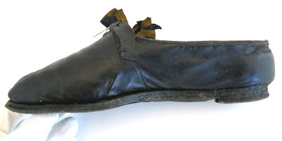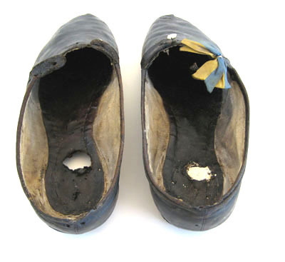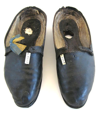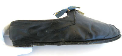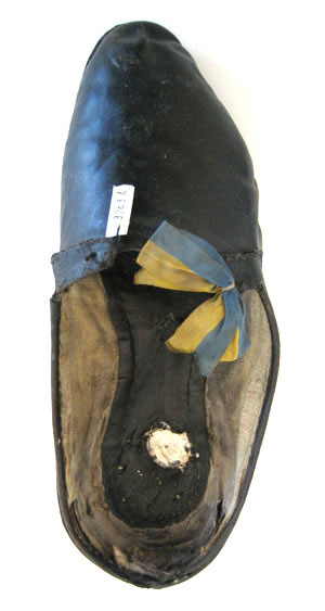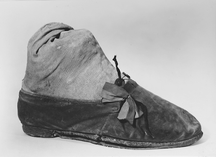 Skon är skuren i ovanläder och bakkappa med slejfar. Hälen är spannat. Skon har en rundad tå och är kantad med vit getskin. Sulans undersida är sydd med en grov tråd och har en skarv. Ett gult /blått band är trätt igenom hålen på slejfarna och bilder en rosett, 70 mm bred. Fodret är av kypertvävt linne.