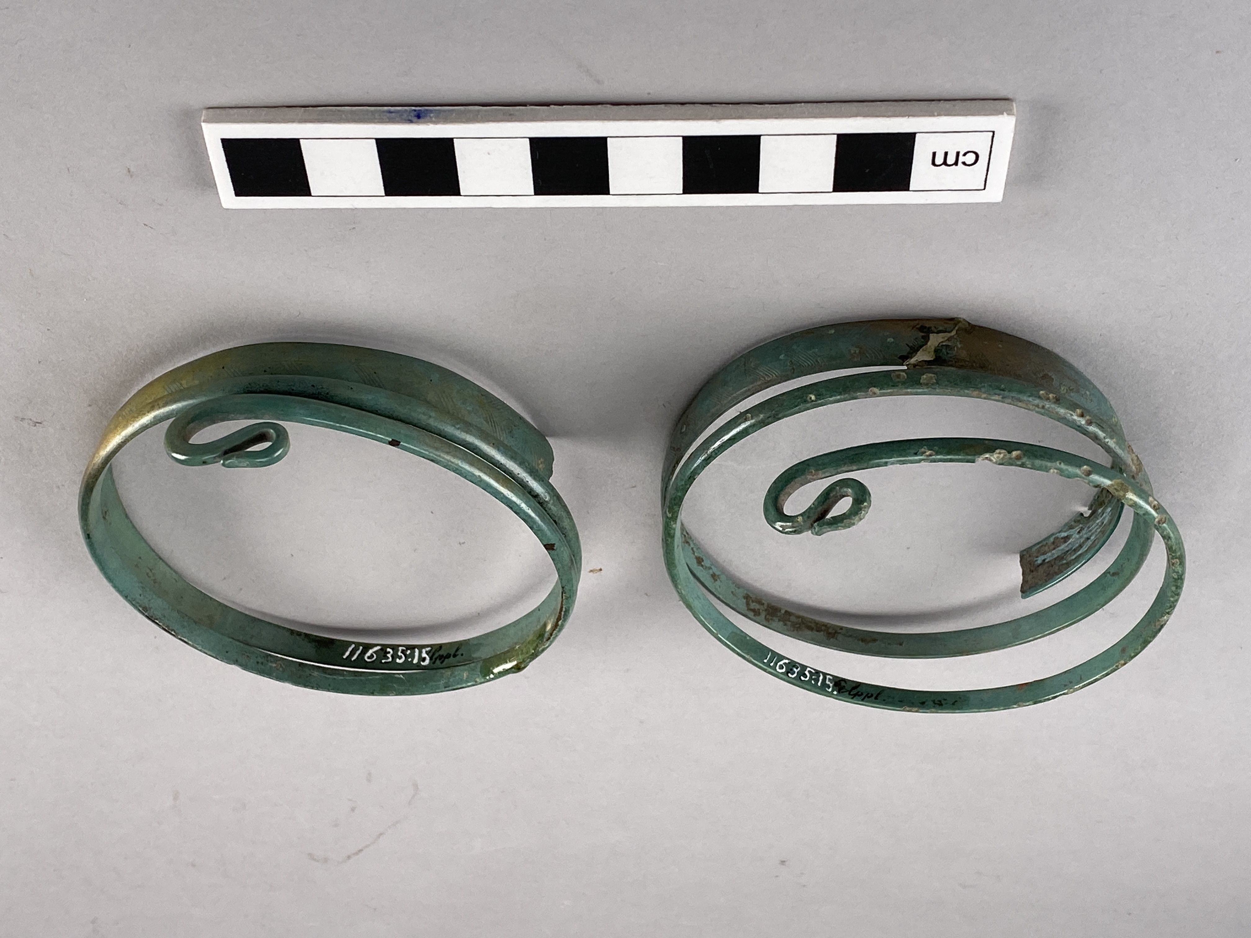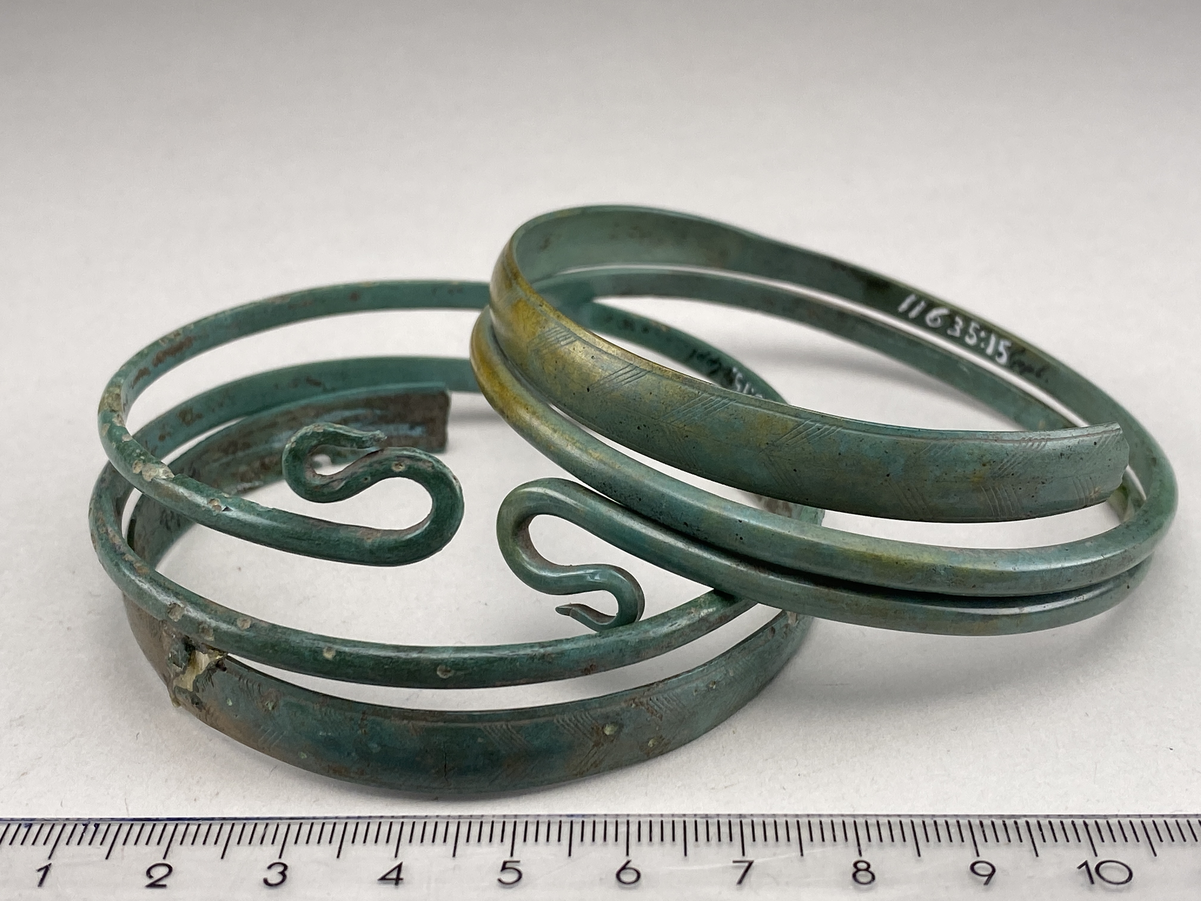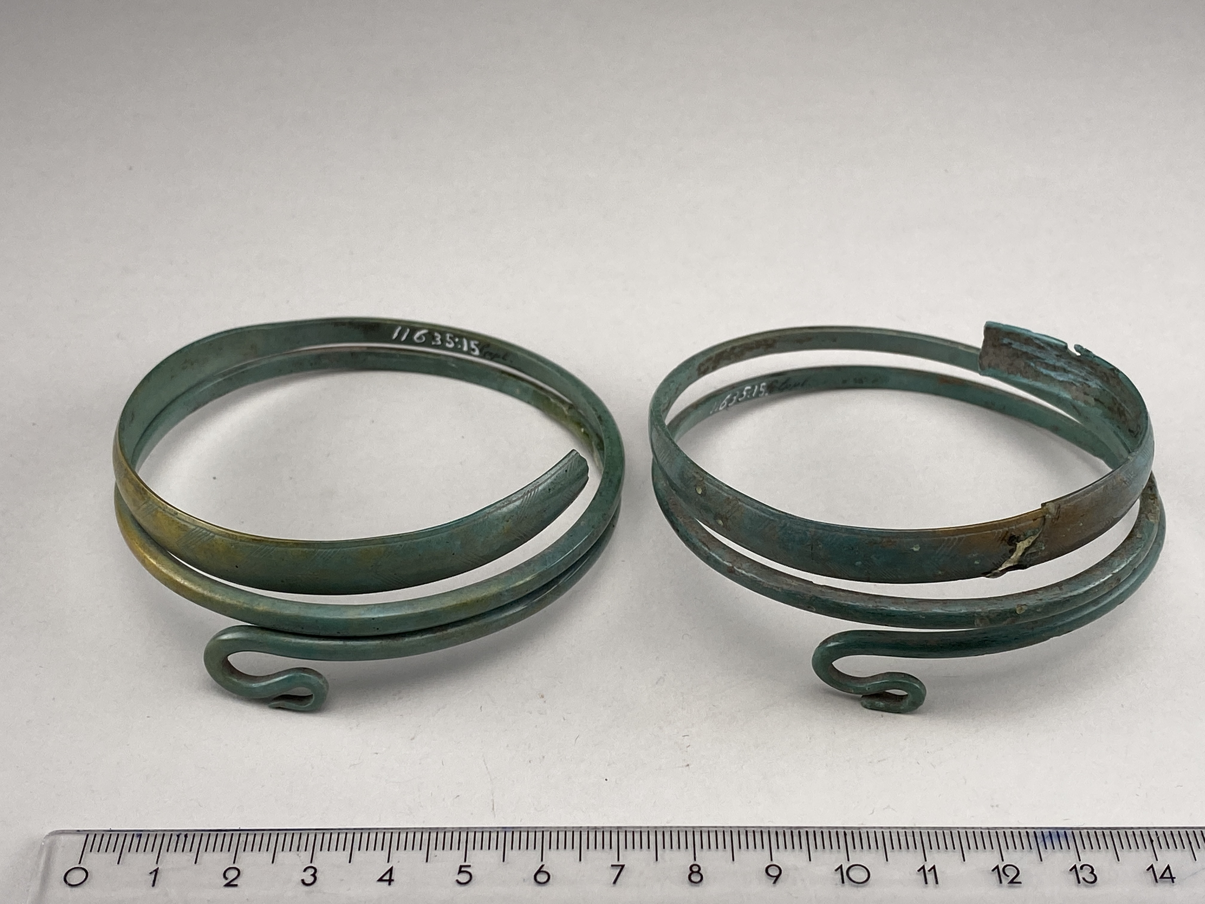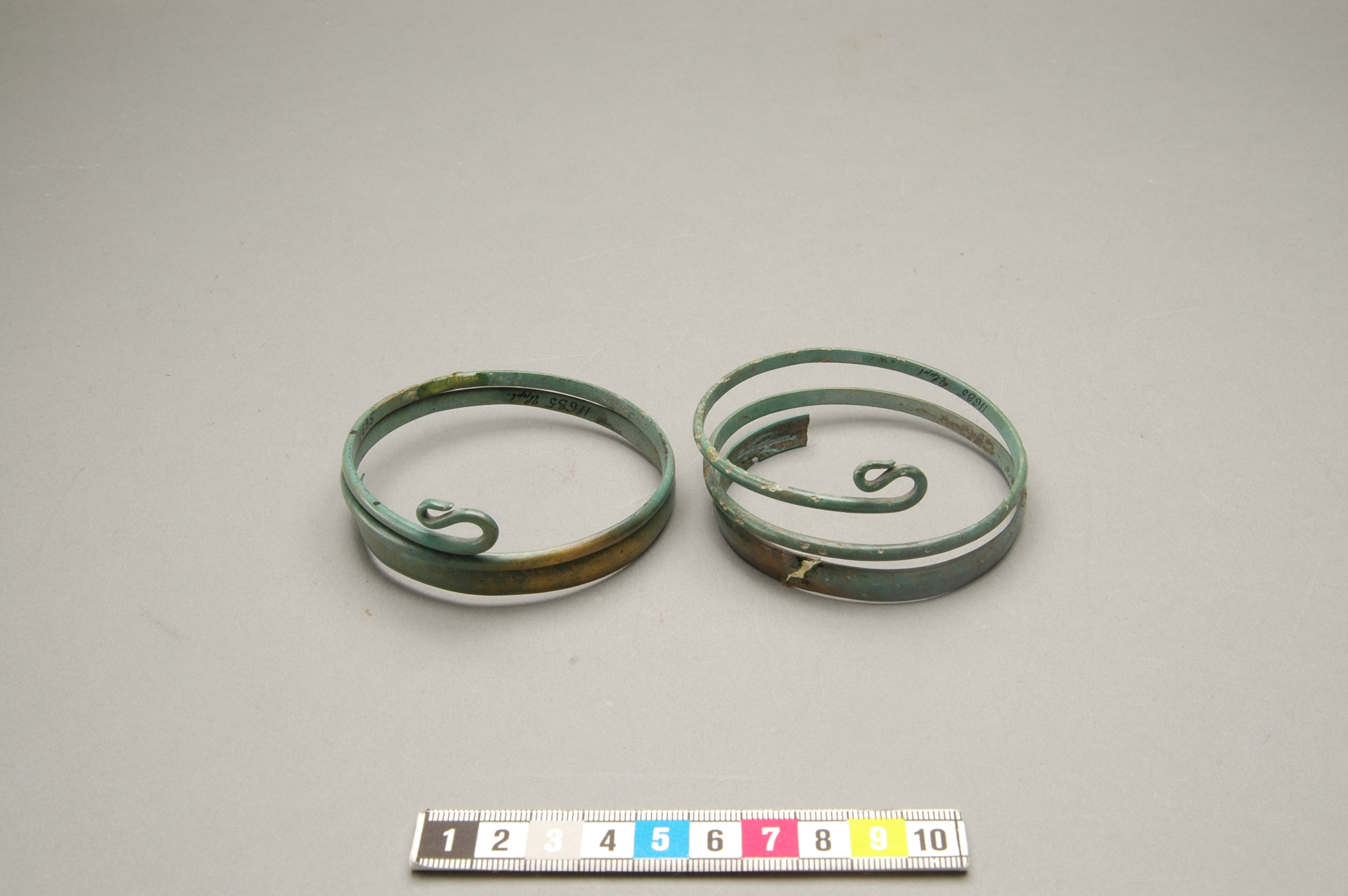 Två spirallagda armringar av brons med ändarna s-formigt böjda och ornerade med grupper av sneda streck ställda i vinkel mot varandra.