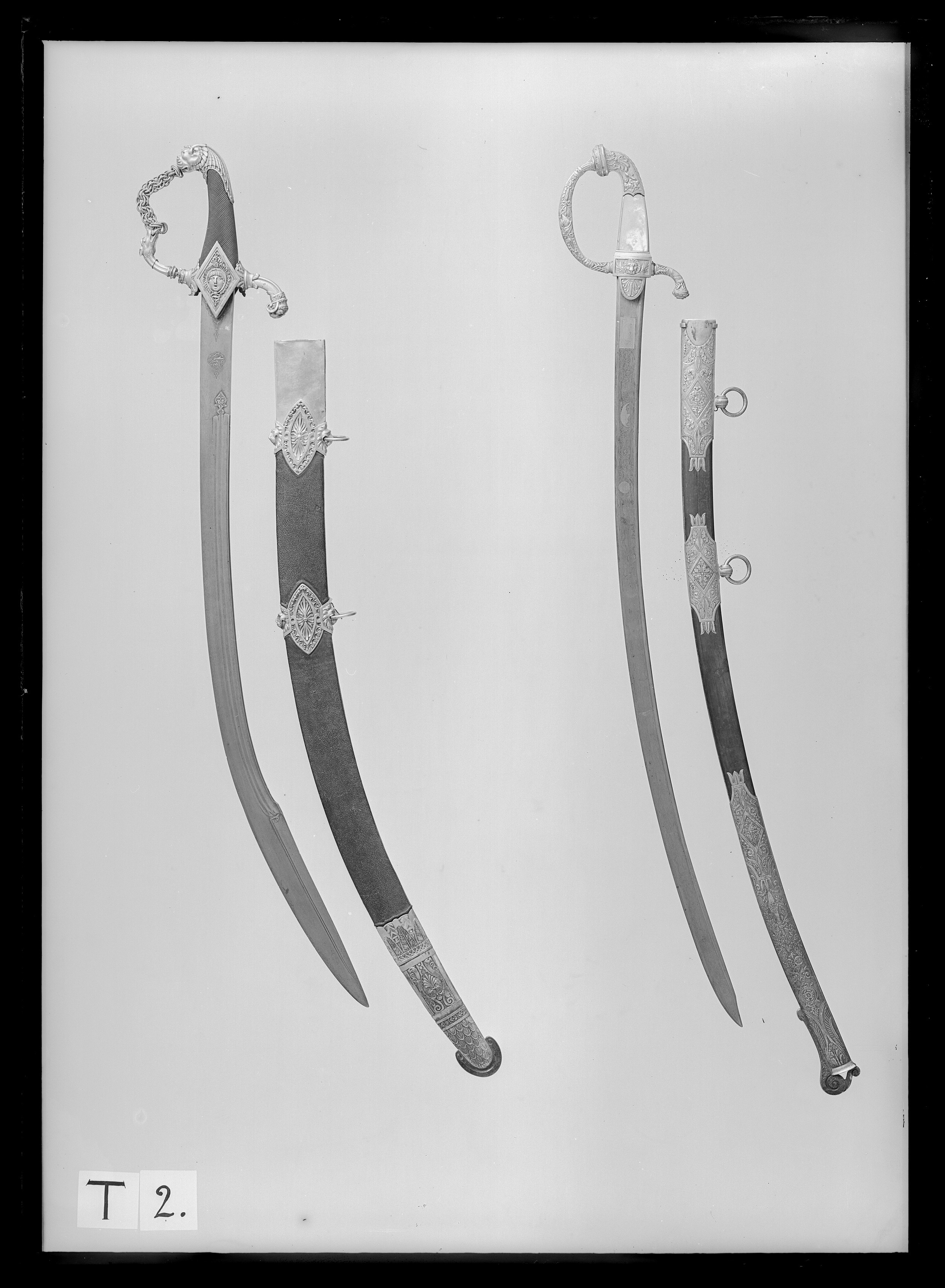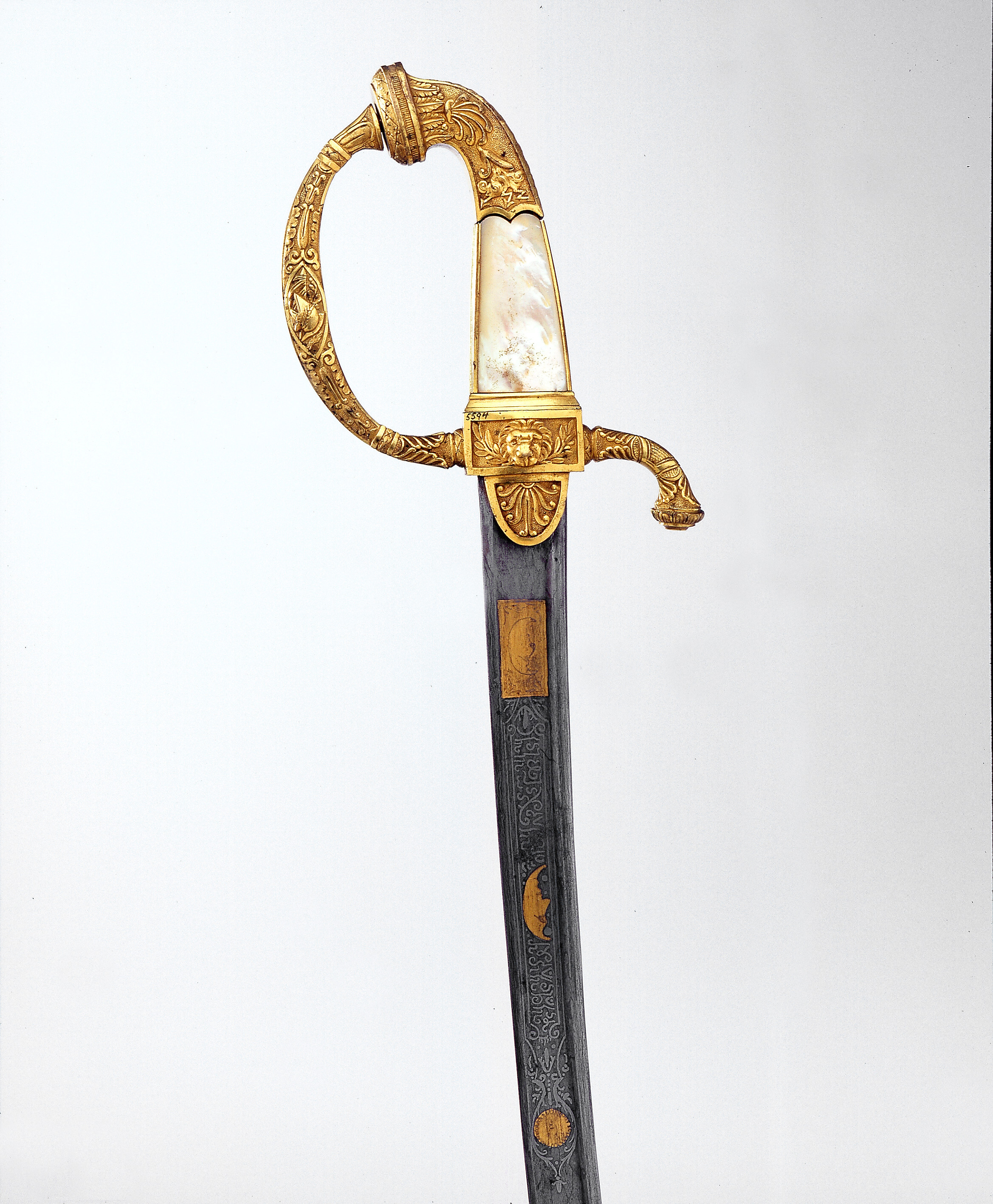 Fäste av punsad och ciselerad, förgylld mässing. Kappa med framåtriktad, oval övredel med en bladbård, därnedanför på båda sidor palmett och åskviggar mot punsad botten, ryggen med ett utdraget, långsmalt blad. Krysset rektangulärt med på utsidan ett lejonhuvud framifrån, omgivet av två korslagda lagerkvistar, på insidan enkla blom- och bladornament, allt mot punsad botten. Handbygeln rikt ornerad med snidade blad och blommor samt på mitten en spetsoval medaljong med på utsidan en trofégrupp, på insidan överdelen av ett romerskt fälttecken(?) med en slingrande orm. Bakre parerstången nedåtböjd med snidad ornering och vidgad i änden och profilerad. Halvoval styrskena med sjubladig palmett mot punsad botten. Kavel platt, på ut- och insidan med skivor av pärlemor samt på fram- och bakkanten mässingsband med stiliserad ekbladsranka. Klinga böjd, eneggad, damaskerad av turkisk typ med vulstformig rygg och 210 mm lång jelman. På båda sidor etsad och förgylld ornering, l: 216 mm, på starka delen på båda sidor ett rektangulärt, förgyllt fält med på utsidan en månskära, på insidan ett turkhuvud sol, en enkel trofégrupp.