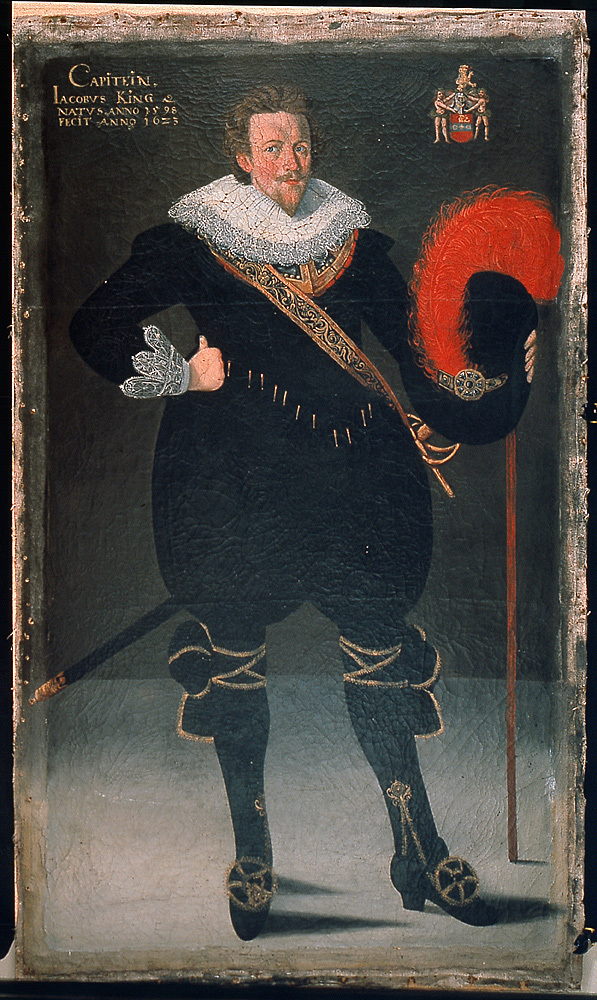 Stående helfigur , fas höger. Höger hand i sidan , i vänster hand käpp och hatt. Svart tröja med skört , svarta pluderhosen , spetkantad pipkrage , guldstickat axelgehäng , värja , svarta strumpor och skor. Inskrift överst t.v : " CAPITEIN JACOBVS KING NATVS ANNO 1598 FECIT ANNO 1623 ". Spikad på ram , fastskruvad vid väggen. Bakpå högra ramlisten "17" med krita , 4 cm h.