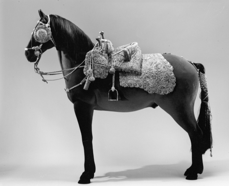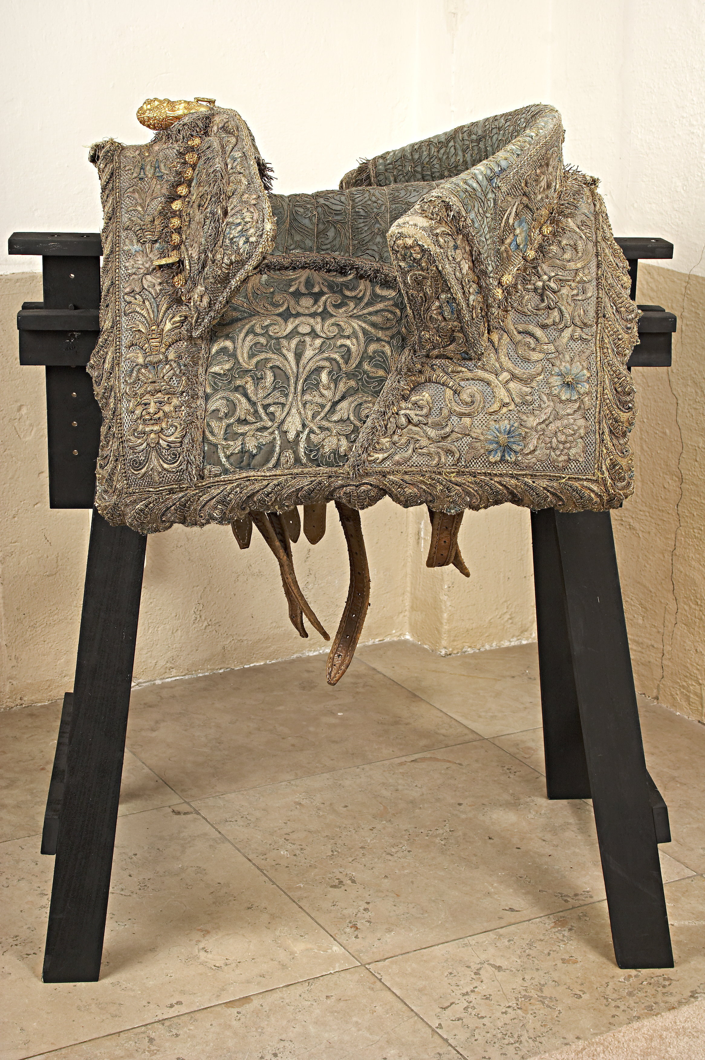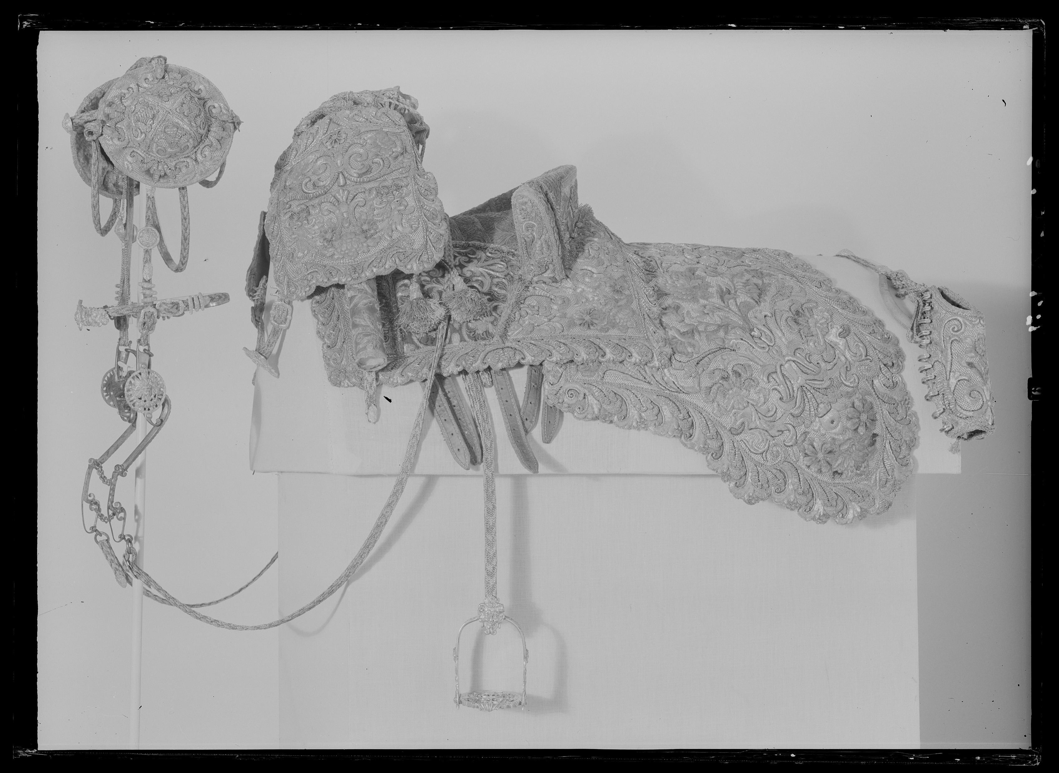 Sadel af blått sammet med stigbyglar (hvaraf en söndrig) och sadelknapp förgyllda, stickad i sätet med guld- och silfver lisquard; sadelkåpan och schabraket rikt ornerade samt broderade i guld och silfver; förbygeln virkad af guld af guld, silfver och silke; stegläderne af samma arbete; svanskappan lika broderad med sadeln; hölstren af blått saffian med kappor, stickade med guld- och silfvergaloner, remmarne med 2 söljor af jern; husen öfver pistolkapporna af blått turpinette med en guld och silfverspets sydda med guld och silfvergalon med 4 qvastar af guld, silfver columbine och blått silke; ryggstycket af samma arbete som förbygeln med en bukett af af guld, silfver och diverse färgade band; hufvudställ och handtygel lika med förbygeln; betselstängerna förgyllda; handtygel af guld, silfver och blått silke med en tofs och en knapp; 1 par blinder lika med sadeln. Alla beslagen, bestående af pucklor, söljor, tampar och styfter, hvilka i äldre inventarier uptagits såsom varande af 6 lödigt silfver, hafva efter skedd undersökning befunnits bestå af förgylld metall. (Sadeln upgifves vara skänkt från Frankrike.) Tid. inv. nr.: 598 Nr. i föreg. inv.: 573