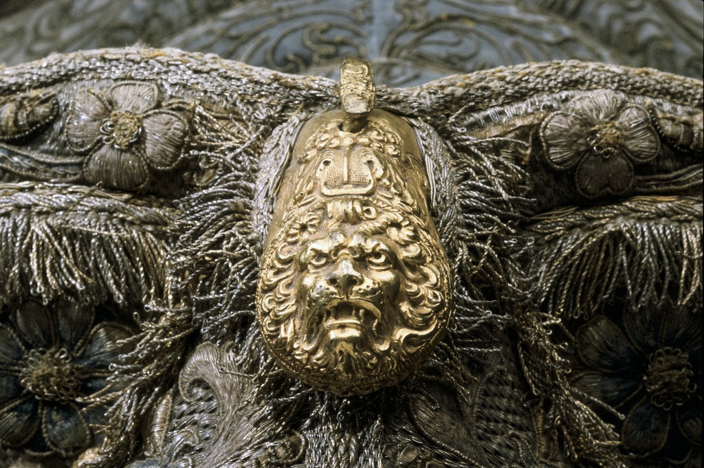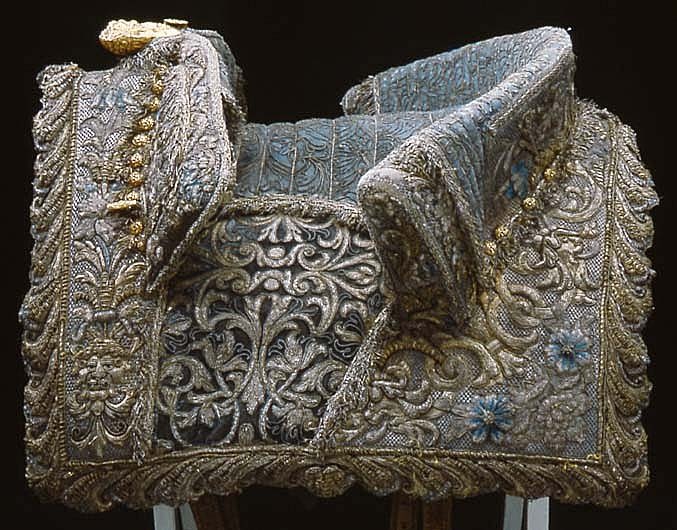 1 Sadel af blått sammet med förgld. stegböglar, stickad i sätet med guld- och silfver; Litsquard, sadelkåpa, hölsterkappor med eschabraque broderadt med silfver och guld samt colombin och blomerantfärgade rosor uti sömmarne, med en silfvertoffs. Sadelknappen samt 3 sleiffer hvari pistolhölstren spännas är förgl med tennlickor af 6 lödigt silfver på sadeln fram och bak. Förbögeln virkad af guld och silfver samt columbin och blått silke, med puckla och söljor af förglt silfver; stegremmarne lika förbölgen men söljorna af jern 1 Svanskappa lika broderad med sadeln med insatte förgl. hakar Hölster af blått Saffian med kappor stickade med guld och silfver galoner, remmarne med 2ne söljor af jern Husen öfver pistolkapporne af blått turpinette med en guld i silfver spets schameerade, med guld och silfvergalon, med 4 quastar af guld, silfver, columbine och blått silke Ryggstycke lika förbögeln med 7 förgl. pucklor och söljor samt en bouquette med diverse färgade band Hufvudställe och handtygel lika förbögeln, beslagen af pucklor, söljor, stiften af 6lödigt silfver samt 4 små kedjor för pannan Betselstänger och pucklor af förg. silfver Handtygel lika förbögeln med en toffs och en knapp 1 par Blinder lika Sadeln med söljor och stifter (Förärad af Konungen i Frankrike) Rubrik: Rid och Slädtyg Tid. inv. nr.: 573 Sida: 40 Nr. i föreg. inv.: 573