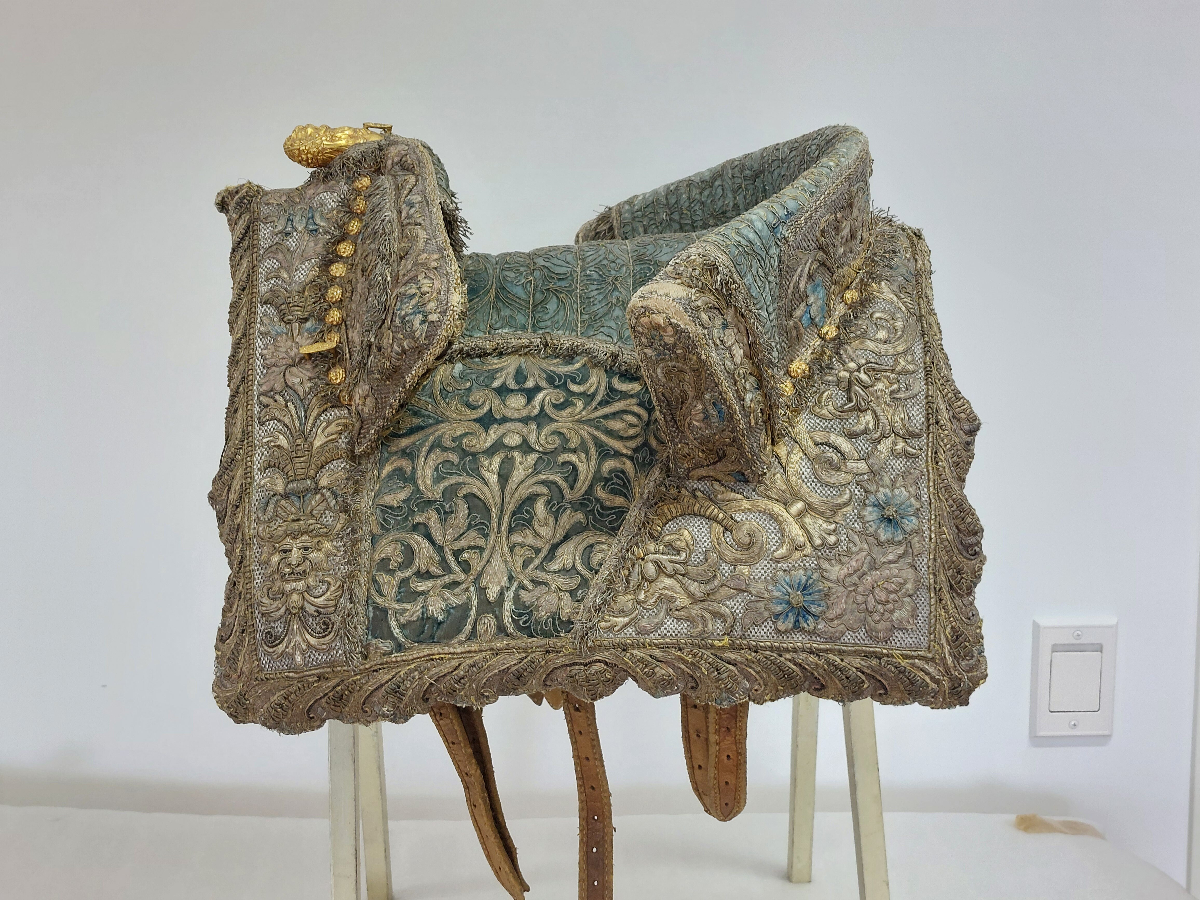 - En ny Sadell af blått Sammet, stickad i Sätet med en grann Guld- och Silfwer-Litzqward, Sadellkåpan och Höllster-Kapporne med Eschabraquet brodderade med Sölfwer och Guld, samt Columbin och Blommerat färga Rosor uti Sömer och Knuter infattade med en Guld i Silfwer Galon.
