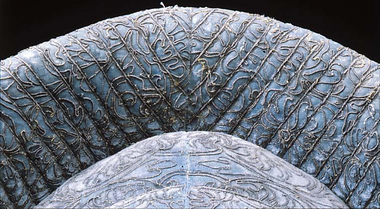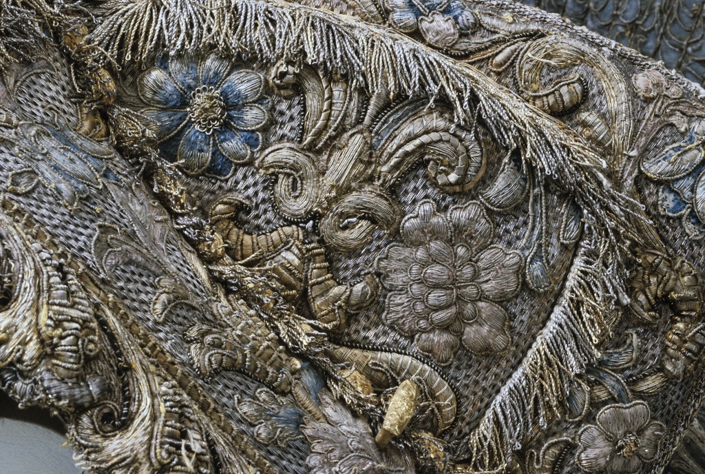 1 Sadel af blått sammet med förgylda stegbyglar, stickad i sätet med guld- och silfver. Litsquard, sadelkåpan, hölster kapporne och Eschabraquet broderade med silfver och guld samt Columbien och blomerant färgade rosor, sömmar och kanter, infattade med en silfver i guld galon. Sadelknappen samt 3ne stycken sleiffer, hvari pistolhölstren spännas är förgyld, med tennlickor af 6 lödigt silfver på sadeln fram och bak. Förbögeln virkad af guld och silfver samt blått och Columbien färgadt silke... Rubrik: Rid och Slädtyg Tid. inv. nr.: 573 Sida: 52 Nr. i föreg. inv.: 573 Anmärkning: Le Gaillard
