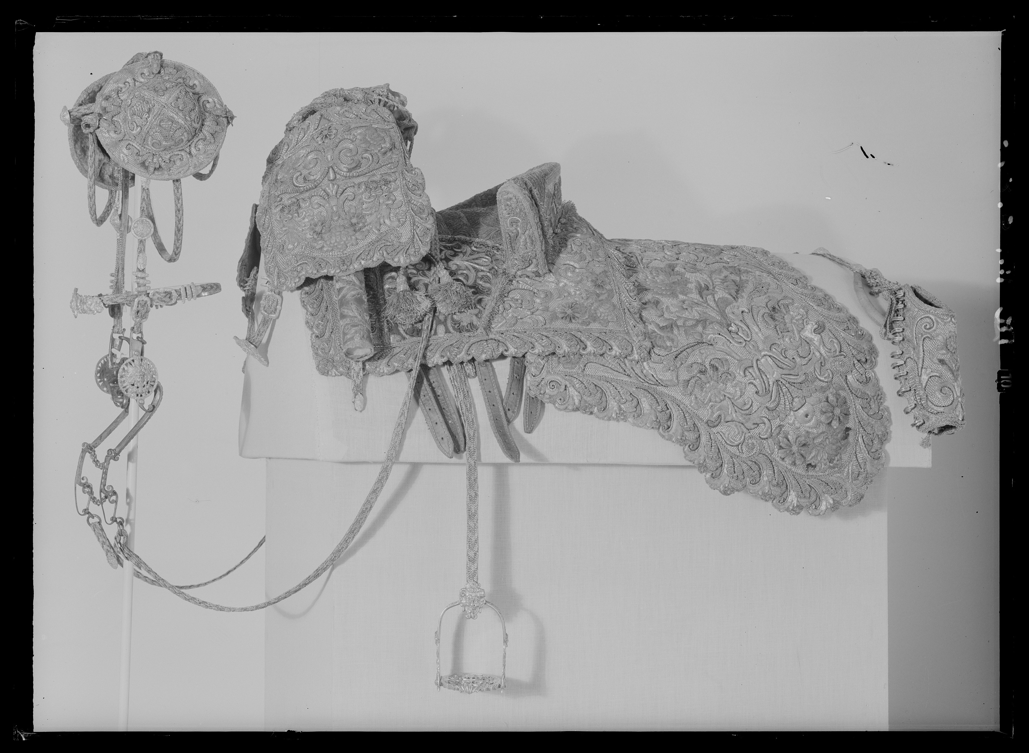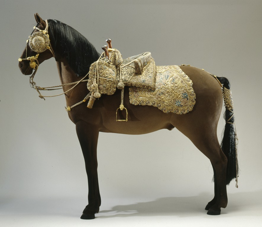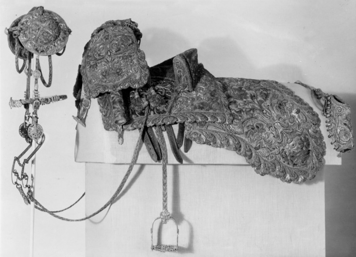 - Sadel af blått sammet med stigbyglar (hvaraf en söndrig) och sadelknapp förgyllda, stickad i sätet med guld- och silfver lisquard; sadelkåpan och schabraket rikt ornerade samt broderade i guld och silfver; förbygeln virkad af guld af guld, silfver och silke; stegläderne af samma arbete; svanskappan lika broderad med sadeln; hölstren af blått saffian med kappor, stickade med guld- och silfvergaloner, remmarne med 2 söljor af jern; husen öfver pistolkapporna af blått turpinette med en guld och silfverspets sydda med guld och silfvergalon med 4 qvastar af guld, silfver columbine och blått silke; ryggstycket af samma arbete som förbygeln med en bukett af af guld, silfver och diverse färgade band; hufvudställ och handtygel lika med förbygeln; betselstängerna förgyllda; handtygel af guld, silfver och blått silke med en tofs och en knapp; 1 par blinder lika med sadeln. Alla beslagen, bestående af pucklor, söljor, tampar och styfter, hvilka i äldre inventarier uptagits såsom varande af 6 lödigt silfver, hafva efter skedd undersökning befunnits bestå af förgylld metall. (Sadeln upgifves vara skänkt från Frankrike.)