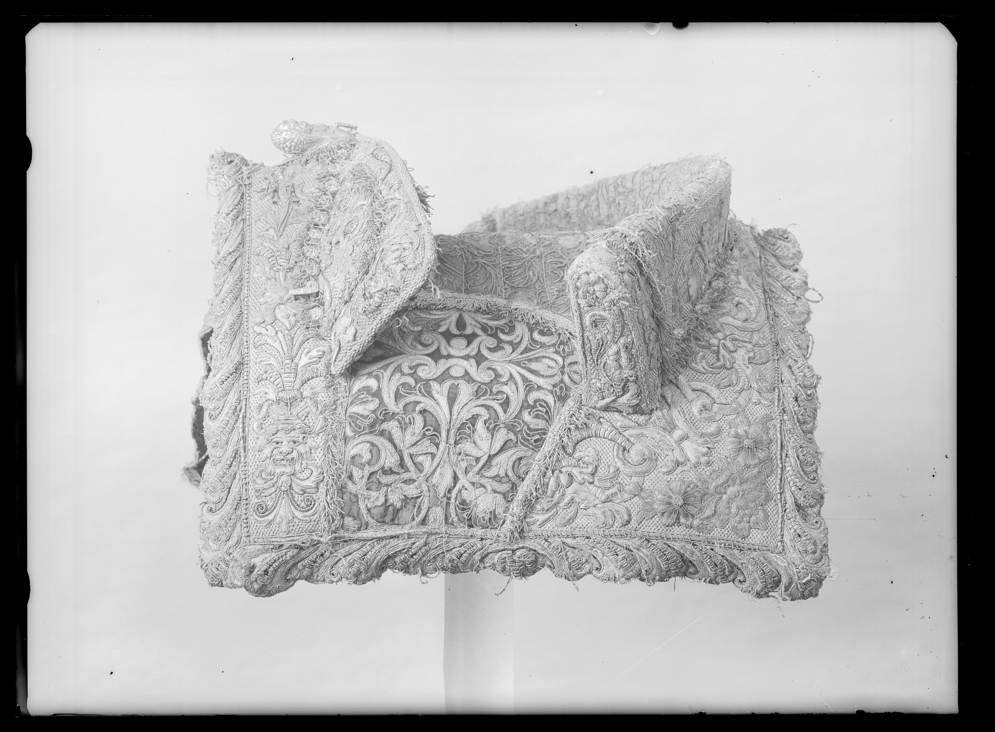 En ny Sadell af blått Sammet, stickad i Sätet med en grann Guld- och Silfwer-Litzqward, Sadellkåpan och Höllster-Kapporne med Eschabraquet brodderade med Sölfwer och Guld, samt Columbin och Blommerat färga Rosor uti Sömer och Knuter infattade med en Guld i Silfwer Galon. - i marg: Prot. 573 Sadelknappen samt 3 stycken Sleiffer, hwar uti Pistol-Höllstren spännas, är förgylt, sammaledes fram och bak på Sadelen finnes inslagne 43 st förgylte Tenglickor af 6.lödigt Silfwer eller Zinck; Förbögeln ... Ryggstycket .... En Swants Kappa ... Stegremmarne ... Stegböglarne Bukjorden ..,. Höllstren ... Husen öfwer Pistole-Kapporne ... Hufwudstället ... Betzellstängerne .... Handtygelen .... Ett par Blindor ... Pistolerna äro under dess Titul här efter åt med No 29 antecknade, som kan ses Folio 417 Ett bredt Silferband ... Ett Täcke öfwer Sadelen af blått Sarge, underfordrat med Canfas (Prot. mellan Ett Öfwertåg till Sadelen af blå Safian underfordrat med blått Sarge (Prot. 742) Ett par Pistole-Kappe-Öfwertåg där till af samma Materia och arbete (Prot 739) Förbemälte Sadell är Högst bemälte Sahl Kongl. Maijstt förährad af Konungen i Franckrijke Rubrik: Högst Sahl. Konung Carl den Elloftes, Glorwyrdigst i åminnelse Sadlar Tid. inv. nr.: 79 Sida: 195 Nr. i föreg. inv.: 25 Anmärkning: sid. 195-199