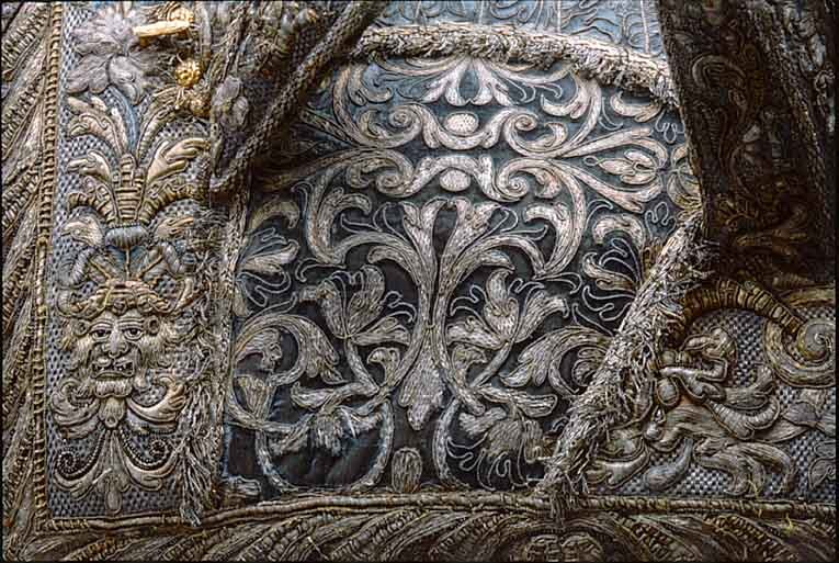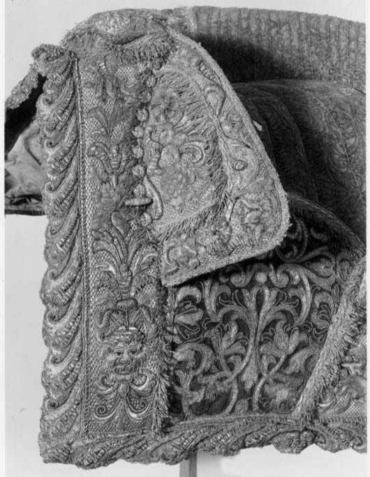 - En Ny Sadel af blått Sammet, stickad i SÄtet med en grann Guld och Silfver Litsquard, Sadel-Kåpan och Hölster Kåporne med Eschabraquet brodeade med Silfver och Guld samt Columbin och Blommerant färgade Rosor uti Sömmar och Kanter infattade med en Guld i Silfver galon.