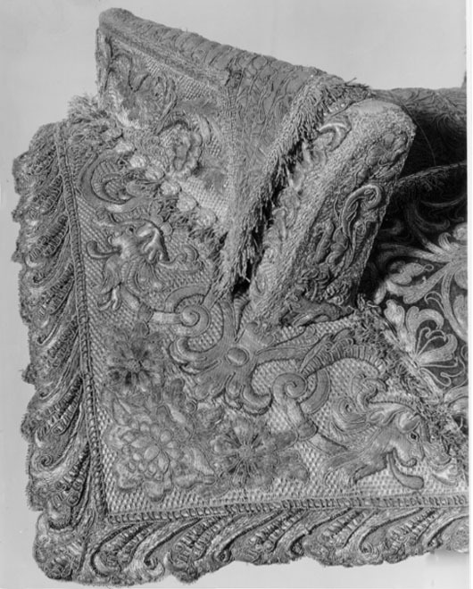 En Swants Kappa lika broderad med Sadelen, hvaruti är insatt 22 stycken förgylte Hakar, som äro infattade med en Guld i Silfver galon, samt en Guldi Silfver Columbin och blåfärgad Litsquard, med Guld i Silfver Knappar och Cantiller på ändarne.