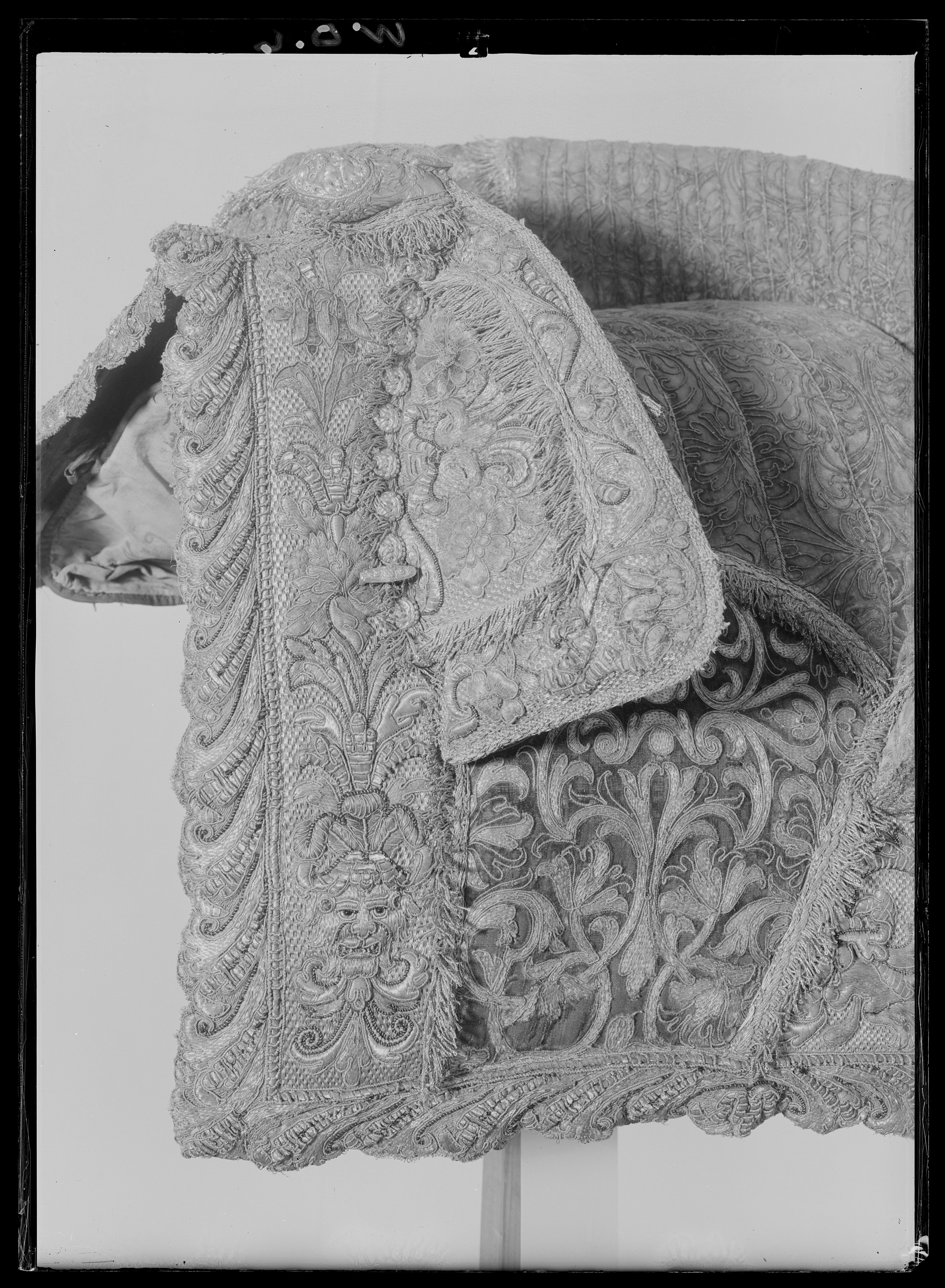 En Ny Sadel af blått Sammet, stickad i SÄtet med en grann Guld och Silfver Litsquard, Sadel-Kåpan och Hölster Kåporne med Eschabraquet brodeade med Silfver och Guld samt Columbin och Blommerant färgade Rosor uti Sömmar och Kanter infattade med en Guld i Silfver galon. Sadelknappen samt 3 stycken Sleiffer, hvaruti Pistol Hölstren spännes, är förgylt sammaledes fram och bak på Sadelen finnes inslagne 43 stycken förgylte Tänglikor af 6lödigt Silfver eller Zink; Förbögeln virkad af Guld och Silfver samt blått och Columbin färgaat Silke, beslagen med 17 st Pucklor och Söljor förgylte af 6lödigt Silfver nätt drifvit Arbete. Ryggstycket af samma slags Arbete som Förbögeln, beslagit med 84 st Pucklor och Söljor, förgylte, samt en Bouquette af Guld och Silfver samt åtskillige slags färgade band. En Swants Kappa lika broderad med Sadelen, hvaruti är insatt 22 stycken förgylte Hakar, som äro infattade med en Guld i Silfver galon, samt en Guldi Silfver Columbin och blåfärgad Litsquard, med Guld i Silfver Knappar och Cantiller på ändarne. Steg Remmarne äfven lika som Förbögeln, Stegböglorne därvid, af 6lödigt Silfver förgyldt /:Stegböglorne feltes 1803:/ Bukjorden af blått och hvitt samt Vilimort Silke uti 3ne stycken bestående, Söljorna af Jern. Hölstren till samma Sadel af blått Saffian, stickade med Guld och infattade med en Guld och Silfver Galon, uti Remmarne 2 söljor af oftannämnde Materiae. Husen öfver Pistol Kapporne af blått Tursenell med en Guld i Silfver Spets schamererade, infattade ofvan omkring, hvardera med en Guld ochSilfver galon. Litsquarden hvarmed husen upp och igendragas af Guld, Silfver, Columbin och blått Silke, med 4 Qvastar af Dito. Hufvudstället och Hand TYgeln äro virkade af Guld ochSilfver, samt blått och Columbin färgat Silke, lika som Förbögeln; Beslaget uti Pucklor, Söljor och Stijfter, som är af 6lödigt Silfver förgylt, består af 49 stycken nätt drifvit Arbete samt 4 stycken små Kedjor. Betselstängerne och Pucklorne jemväl förgylte samt 2 stykcen Bouquetter af åtskillige slags färgade Band. HandTygeln af GUld, Silfver, blått och Columbin färgat Silke tillhopaflätadt, med en Toffs af samma slag vid ena ändan, och en Knapp vid andra ändan. Ett par Blindor, lika med Sadelen broderad, Remmarna därvid af samma slags Arbete som Förbögeln; Beslagen äro 6 stycken Stijfter och Söljor. Pistolerne äro under dess Titul härefter med No 398 (29 överstruket) antecknade som kan se pg. 293 (fol. 417 överstruket). 739 - Ett par Pistol-Kappe-Öfwertåger därtill af samma Materia och Arbete (tillskrivet cass. 1823) Förbemälte Sadel är Högstbemälte Salig Kongl. Majst förärad af Konungen i Frankrike Rubrik: Sadlar och Ridetyg fordna Konungars Tid. inv. nr.: 573 Sida: 111 Nr. i föreg. inv.: 573 Anmärkning: Le Gaillard, sid. 111-