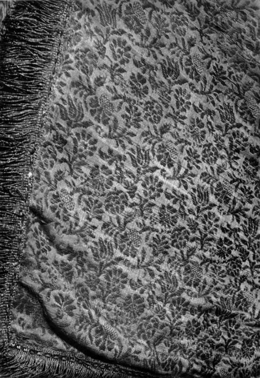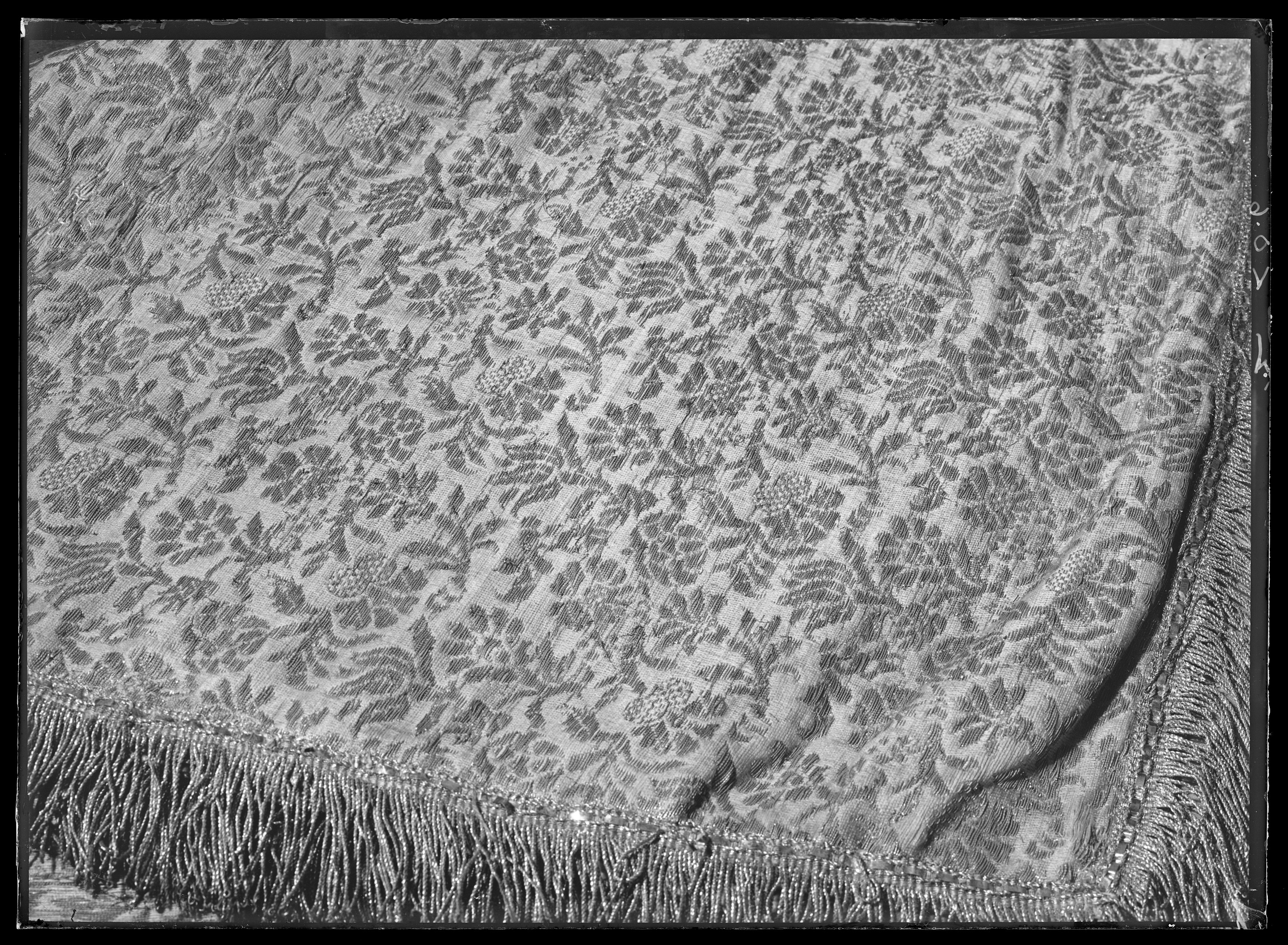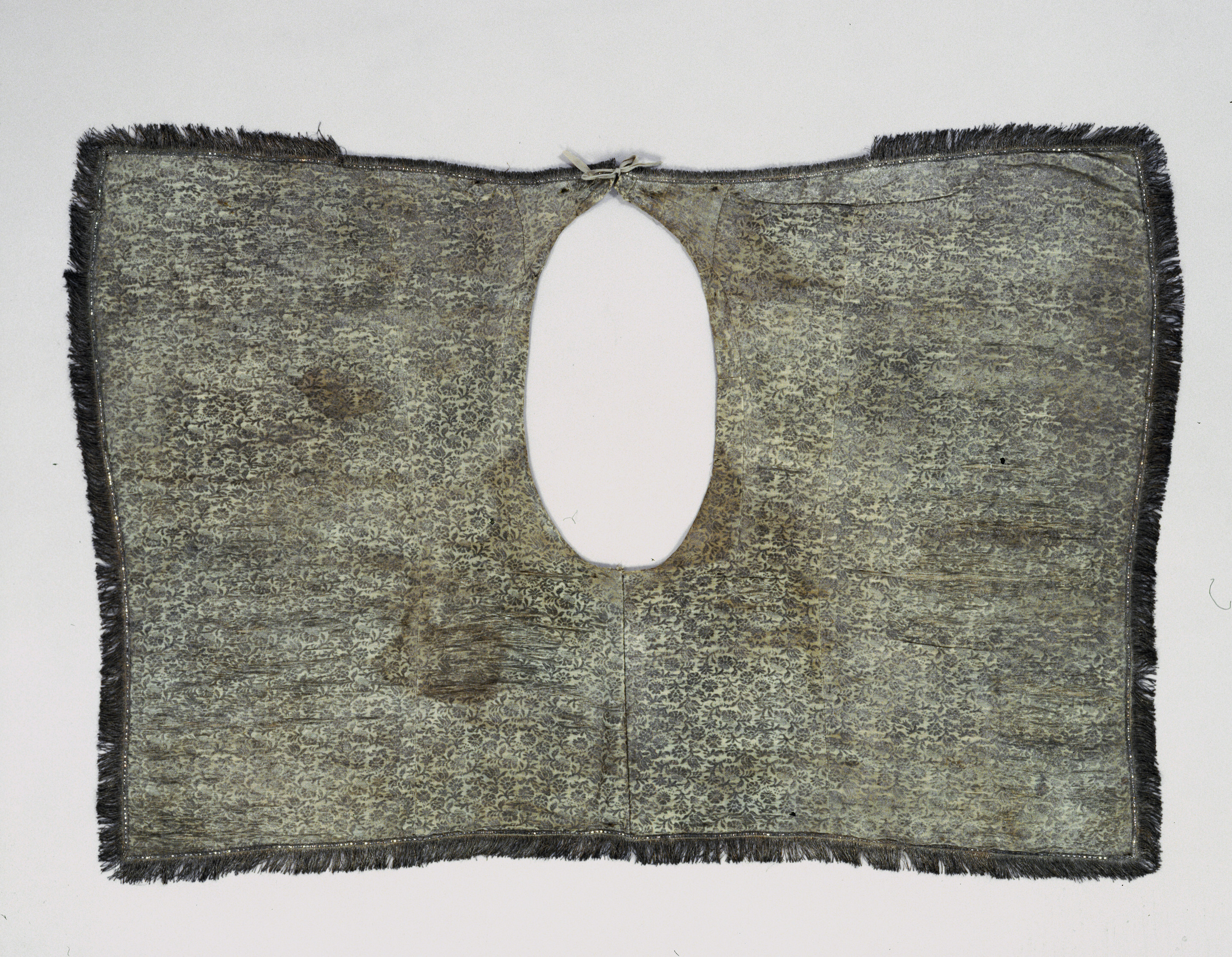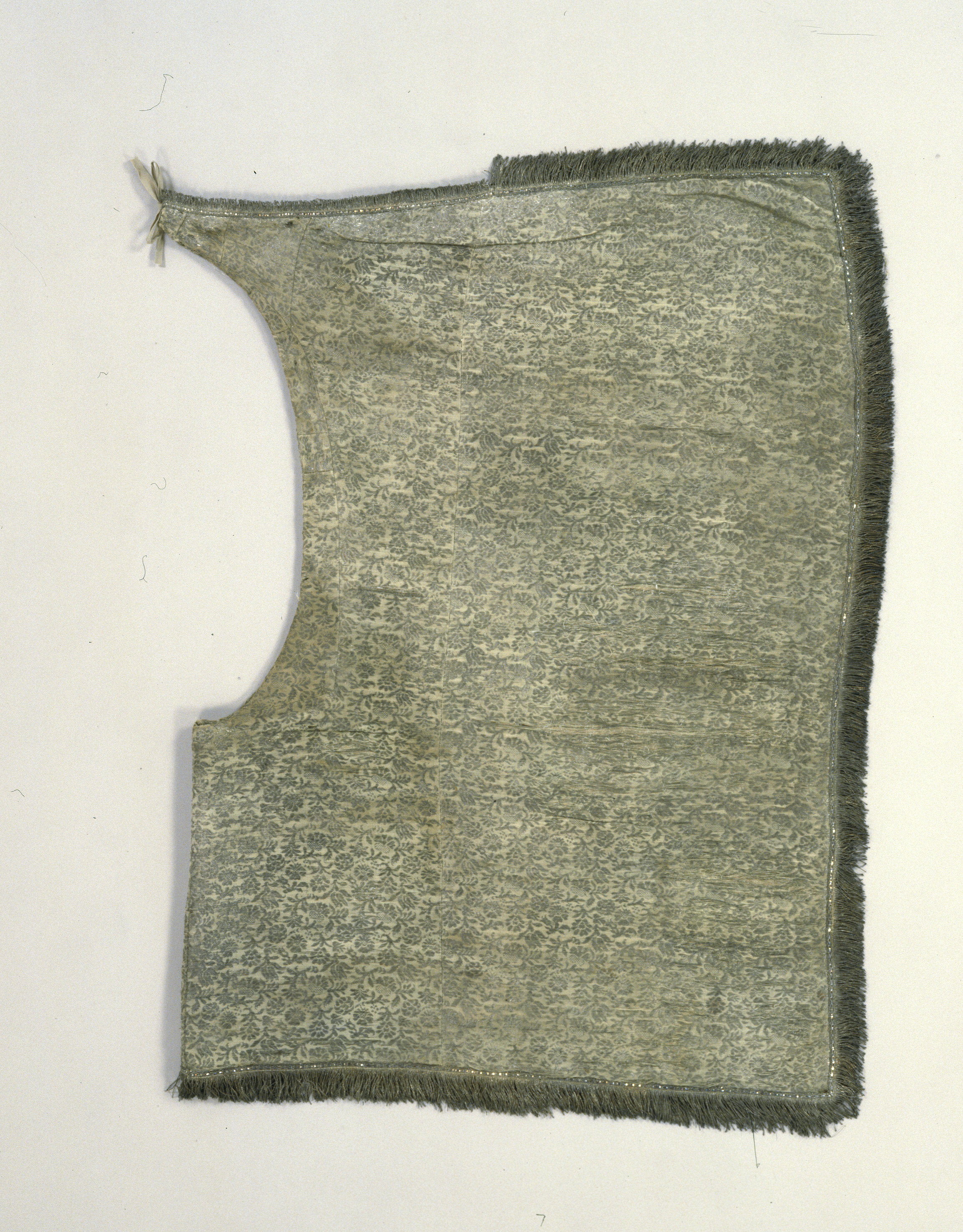 Mått: Mönsterrapport 85 x 85 mm. Framsidans mått: Vådbredd 500 och 320 mm En 470 mm lång mittsöm går från nederkanten till det ovalformade mitthålet. Runt uttaget 11 mindre tygbitar. Baksidans mått: Fodrets vådbredd 760 mm hopsydda i mitten och i vardera sidan en skarvad smal tygbit. Brokad av silver och siden nu beige färgat förmodligen ursprungligen vit. Stadkant, 13 mm, är grön-vit randig. Silvertrådens flottering bildar mönter av små blommor och blad. Kanterna invikta. På dessa en 50 mm bred kavelfrans med en 2 mm bred silverlan i fransens övre del. Fransen består av grupper om två trådar, båda 0,5 mm tjock silverlantråd, med 4 grupper per cm. Fransen löper längs samtliga sidor, 400 mm på vardera sida om halsöppningen är fransens bredd endast 21 mm. Foder av taft. Mellanlägg av juteväv i tuskaft.