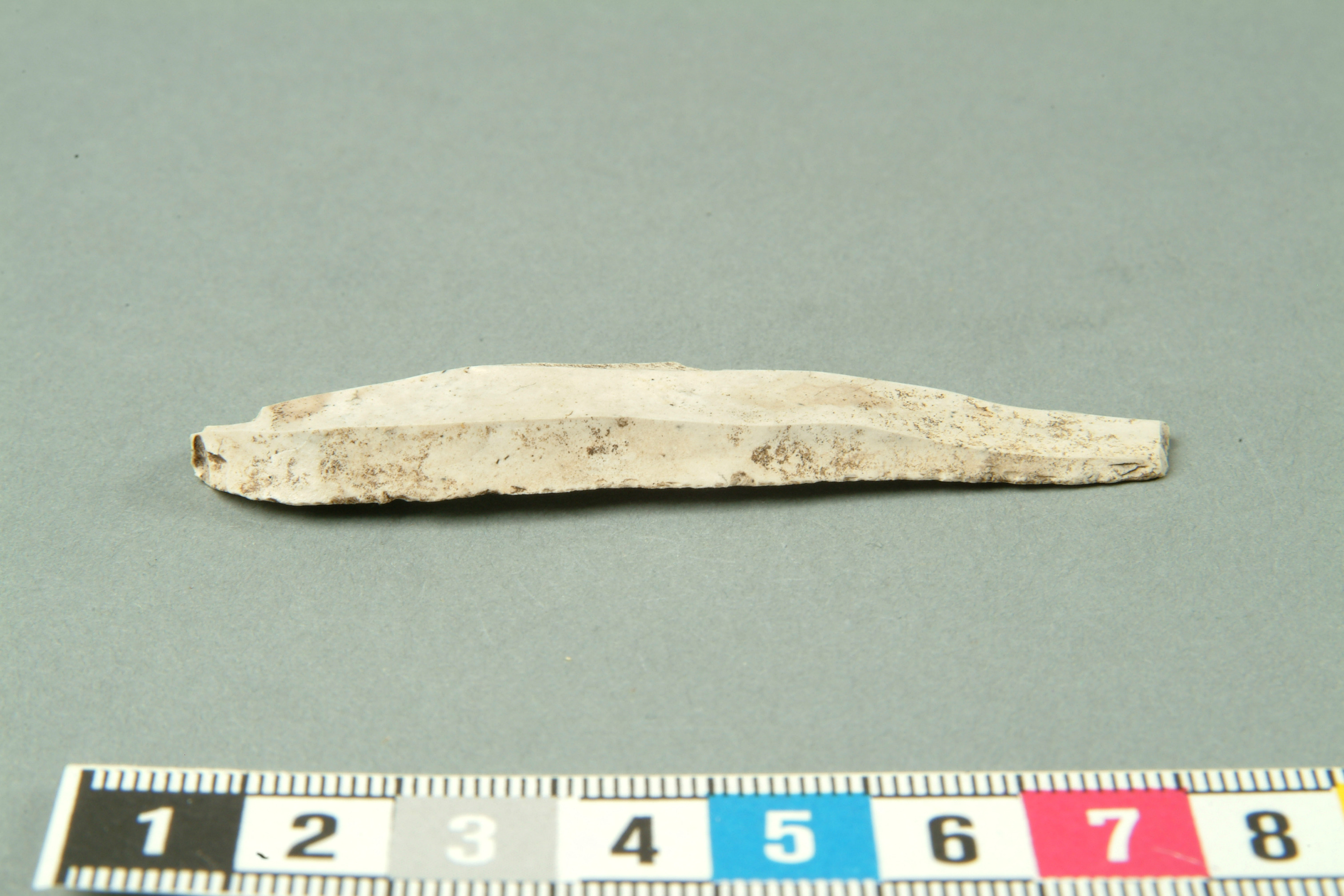 Vitt tvåryggat spån av flinta med bruksretusch.