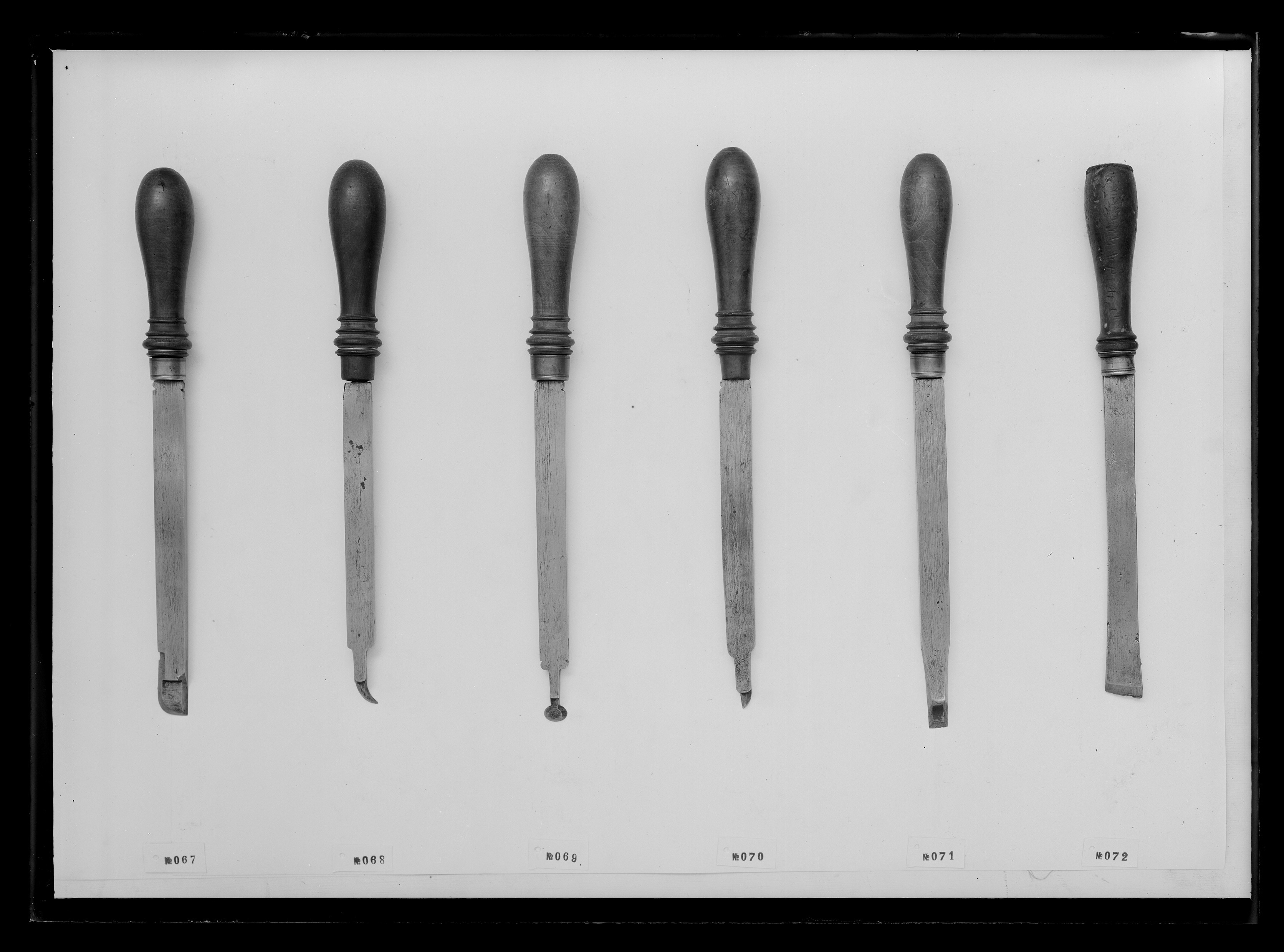 Profilstål med rak, något snedställd, egg framtill och på sidorna. Klinga med rektangulärt tvärsnitt. Svarvat, profilerat, kägelformigt skaft dekorerat vid fästet med en större vulst, omgiven av två mindre samt kring skaftets smalaste del en mindre vulst. Fästet skott med en mässingsring, dekorerad fyra ringar. Mått: L 349, skaft L 135, största diam: 32,0, egg bredd: 11,2.