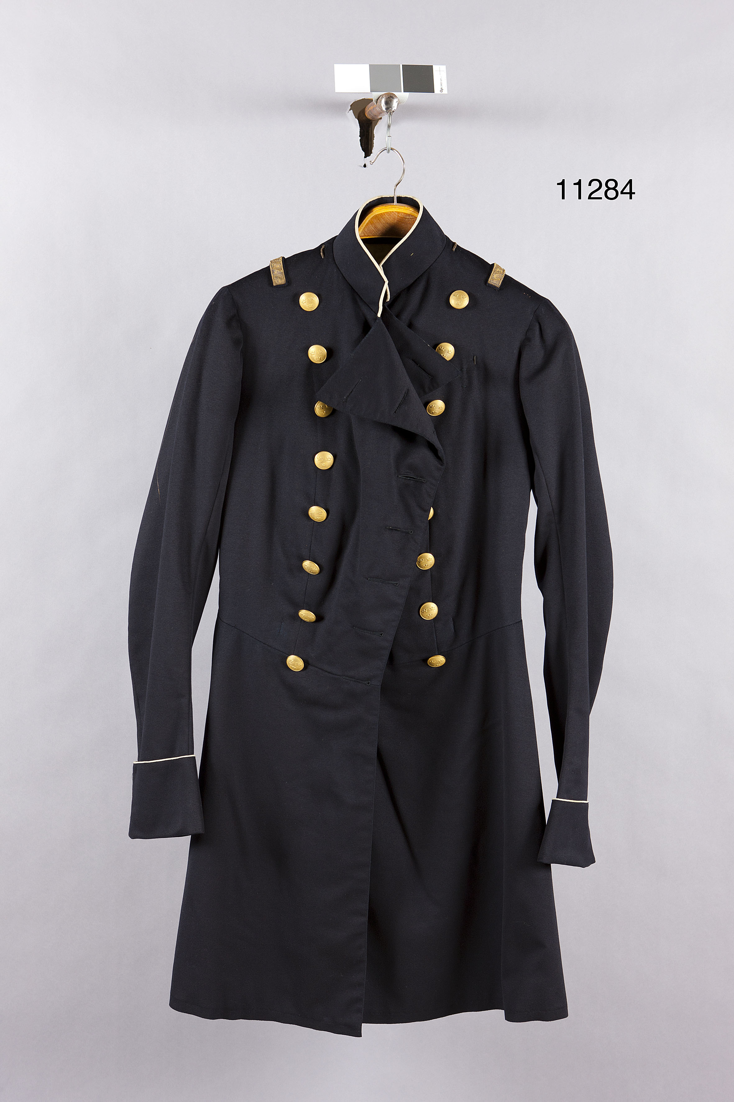 Syrtut av mörkblått kläde med vit kantpasspoal tillskuren med livsöm och ståndkrage. Tvåradig. Åtta förgyllda trekronorsknappar av mässing i varje rad d: 24 mm. På axlarna hälla med guldbroderi samt mindre hälla. Ärmuppslag 84 mm breda. Sprund i ryggen med två dolda fickor samt sex knappar lika som de övriga. Foder av gulvitt linne med matelasserat liv och spänntampar i midjan. I ärmarna foder av vitt siden.