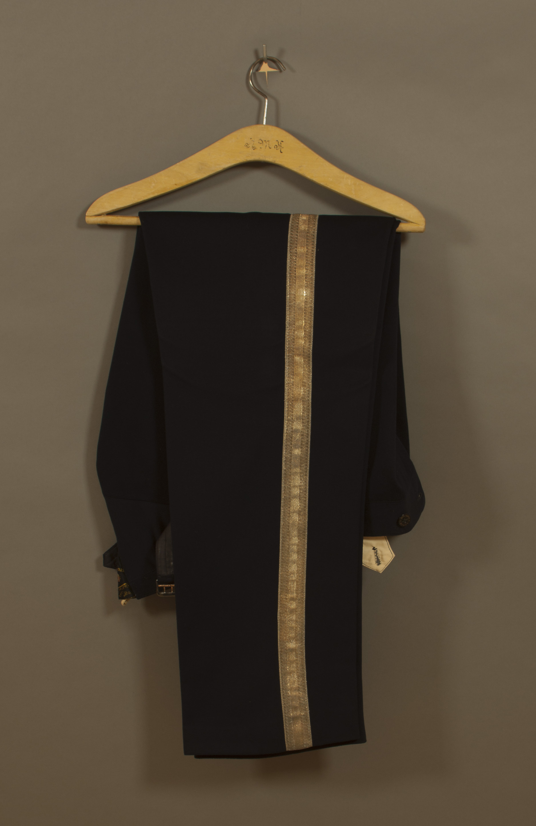 Långbyxor av mörkblått kläde, med gylf, knäppt med hyska och hake av brunmålat stål samt tre svarta knappar d: 14,3 mm med dekor av åtta femuddiga guldstjärnor samt med slejf av vit bomullskypert och likadan knapp. I linningen knäppning med svart knapp, d: 17,5 mm med guldtext: " A. F: PALM STOCKHOLM " samt två stjärnor. På linningen sex likadana knappar för fästning av hängslen. I mittsömmen bak sprund, l: 80 mm, slutet med svart sidenetikett med invävt firmamärke, gul text: " A.F. Palm // Etabl. 1871 // STOCKHOLM " samt ett svensk-norskt vapen (?) med fält, krönt av hertigkrona. Spänntampar av klädet, fodrade med mörkblå bomullskypert, tvåklospänne av svart och brunfärgat stål, märkt: SOLIDE. Vid sidsömmarna silvergaloner, b: 34 mm, i sidsömmarna fickor, l: 150 mm, av vit bomullskypert. Bakficka, l: 160 mm, av vit bomullskypert, kantning av svart satäng. Foder upptill av vit satäng med smala svarta och blå ränder, grenlapp av samma tyg. Invändigt i benens nederkant lappar av svart bomullskypert.
