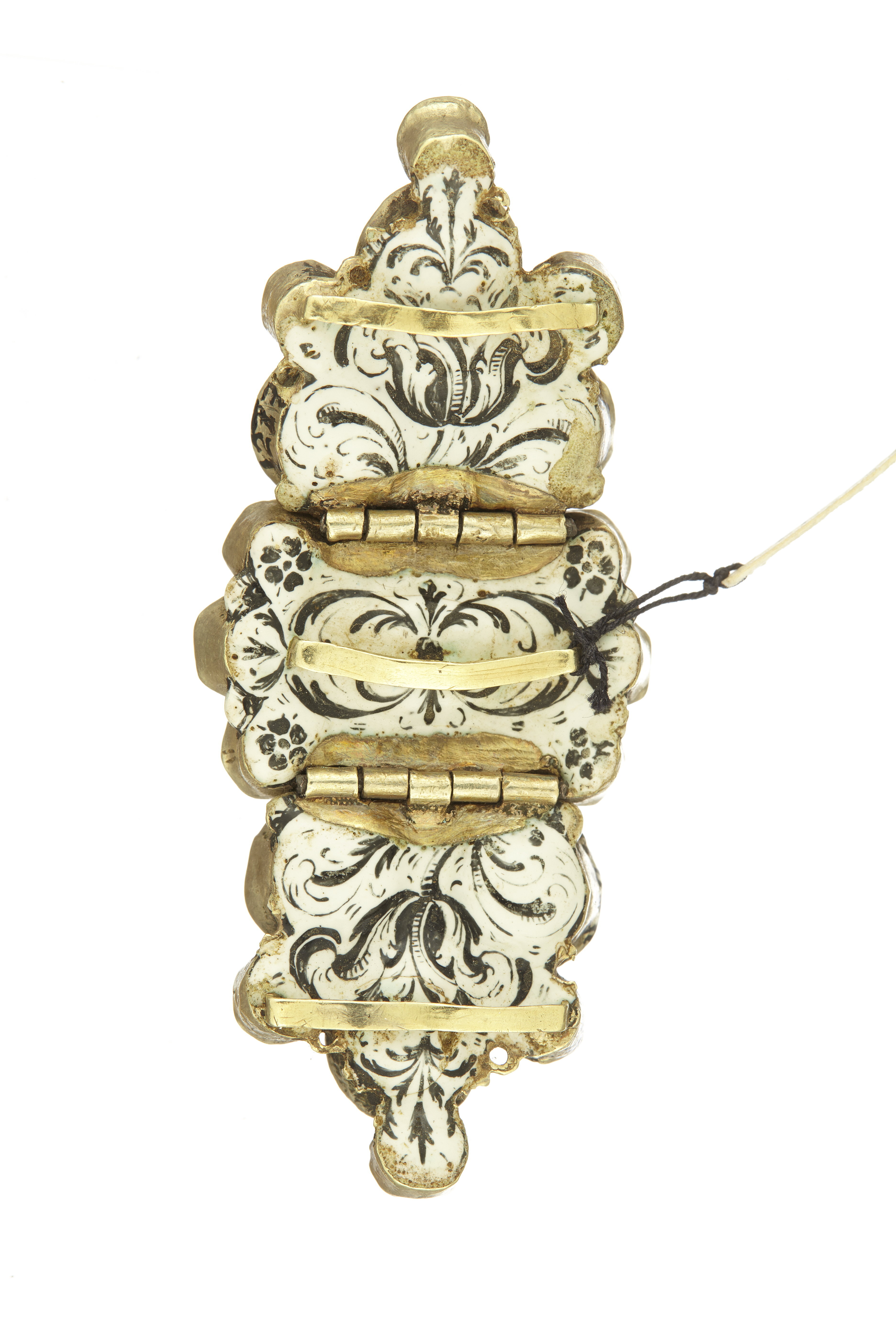 Klädsmycke av guld och bergkristall, i tre delar, förenade med gångjärn. Mittdelen bestående av oval sten, omgiven av sex små sexkantiga stenar, på båda sidor därom triangulära stycken sammansatta av tre ovala stenar samt tre små runda stenar. Stenarna rosenstenslipade och folierade, slät fattning. Baksidan delvis täckt med vit emalj med rankverk målat med svart färg, längs kanterna mer eller mindre trasiga öglor, på varje del en bygel av guld.